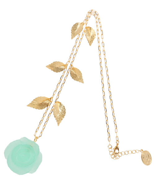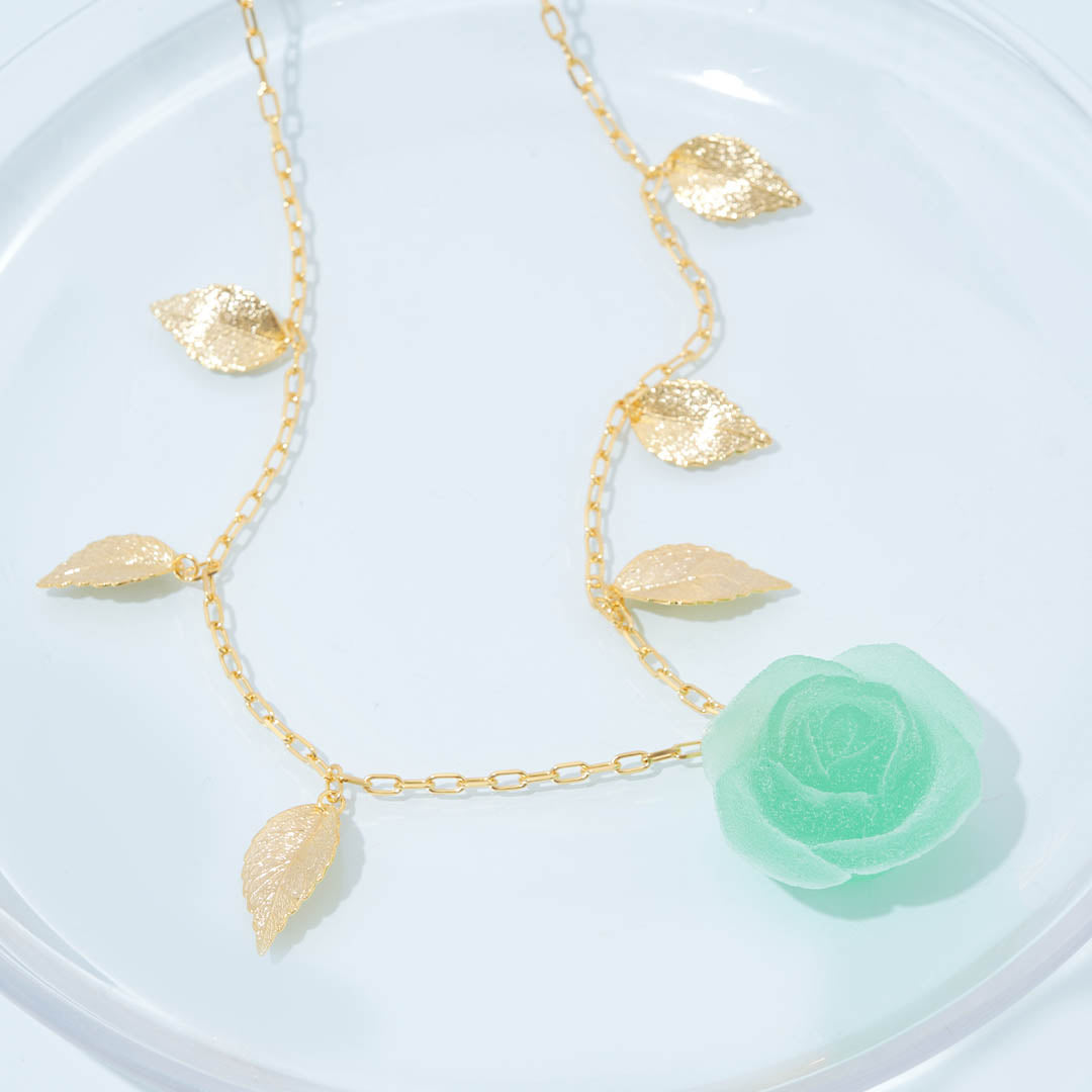 A glamorous necklace featuring romantic rose pate de fruit and leaves of rose on the chain, bold and eye-catching size adds a touch of elegance to any outfit.