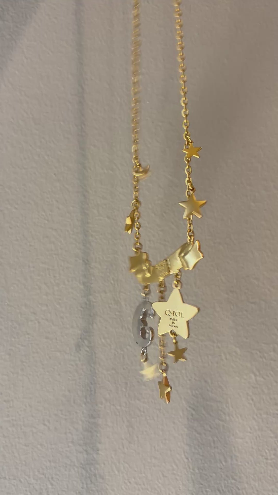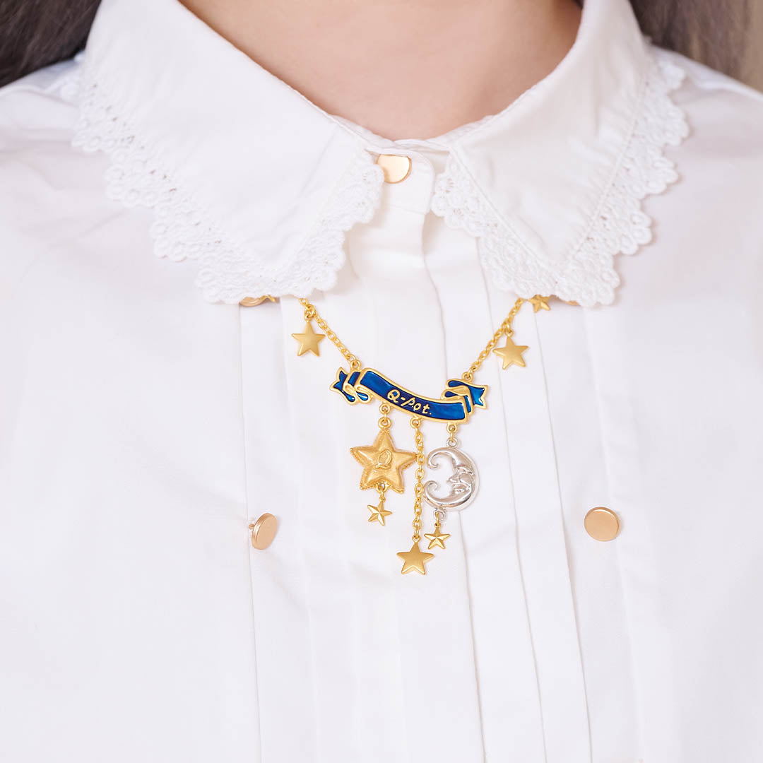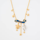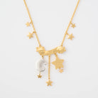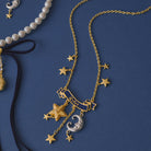 Delicately scattered stars sway gently from the chain, adding a touch of romance. Even the necklace chain itself is adorned with tiny stars, illuminating the neckline with subtle brilliance.