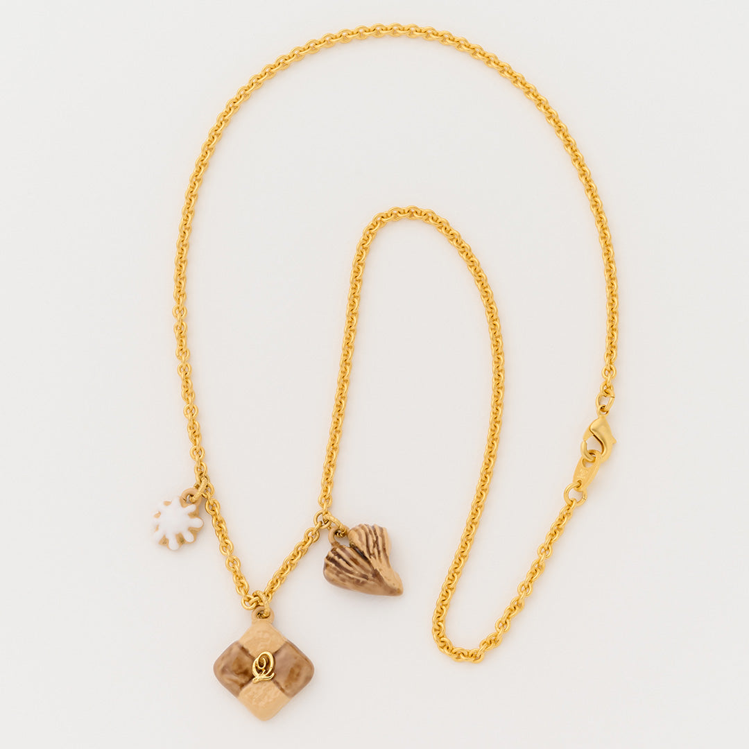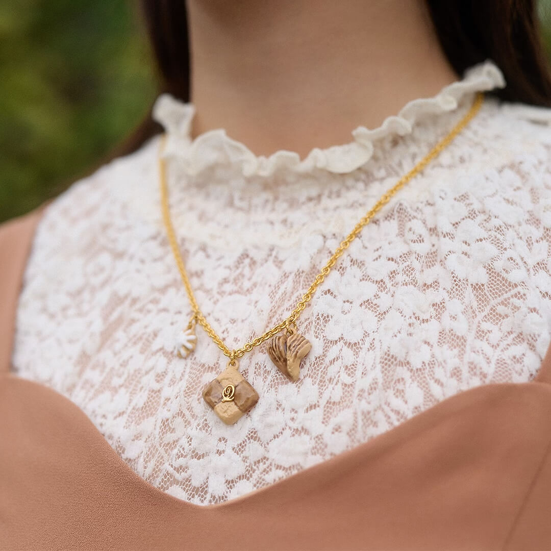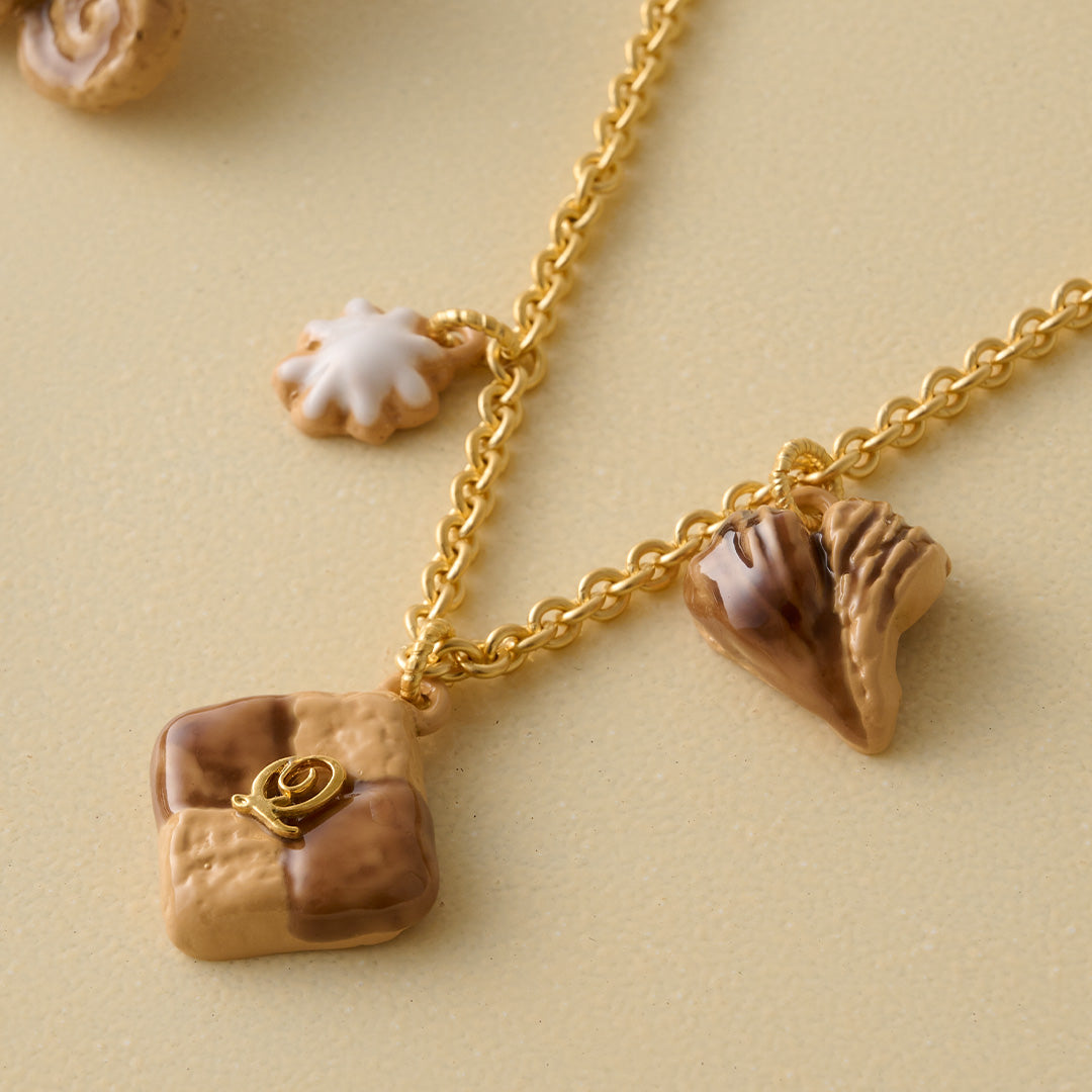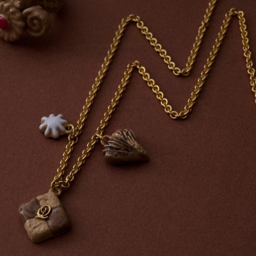 A simple necklace decorated with three types of cookies: icebox cookie, heart cookie, and icing cookie.