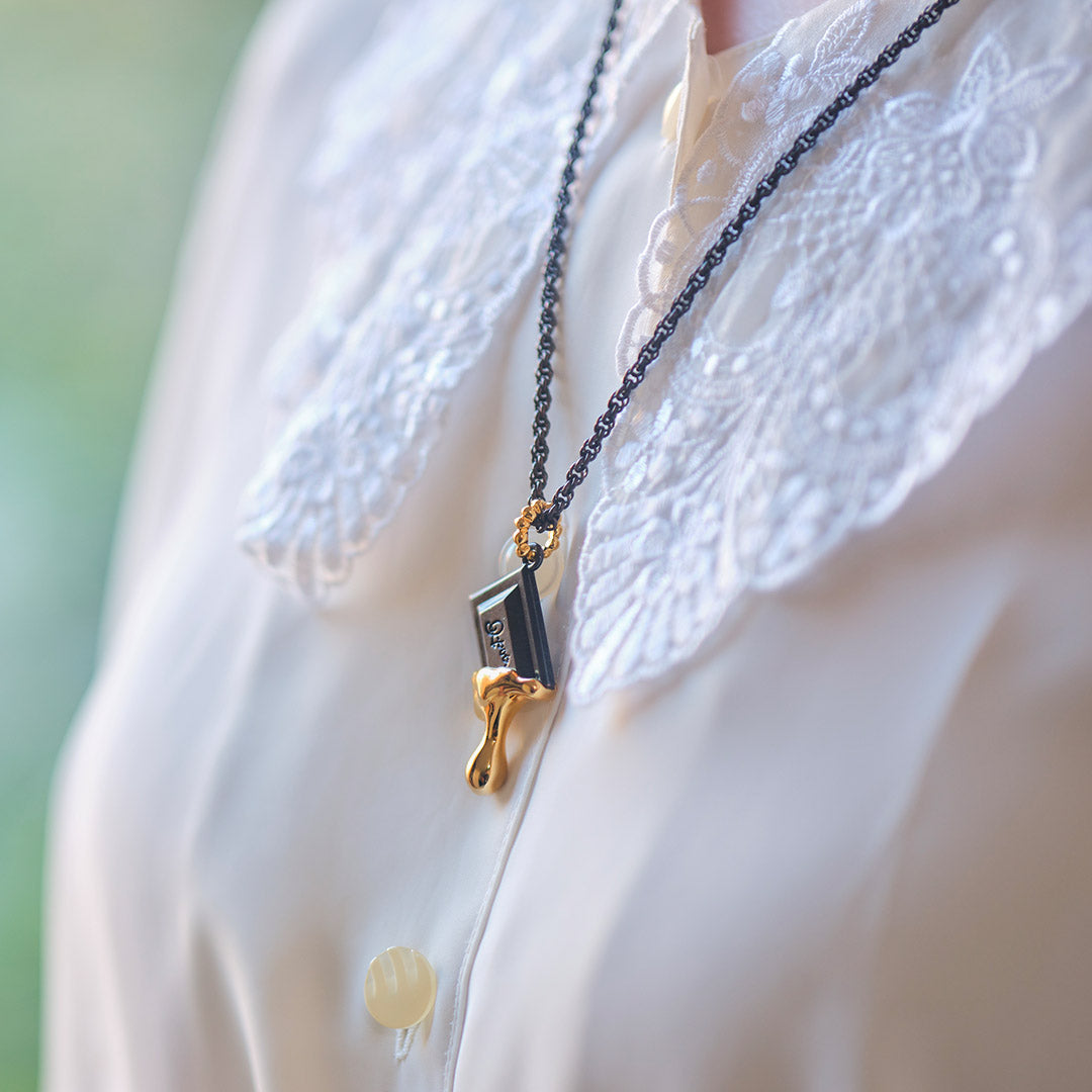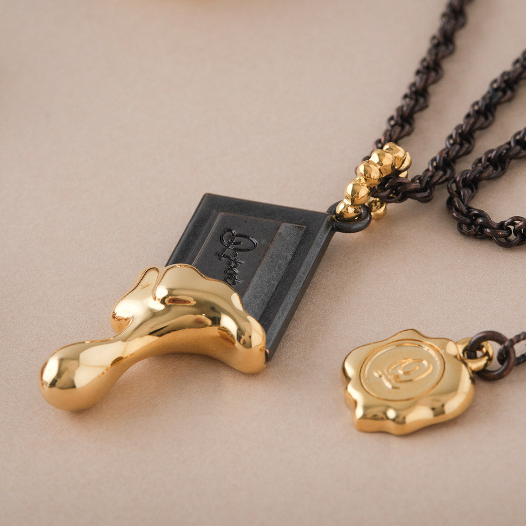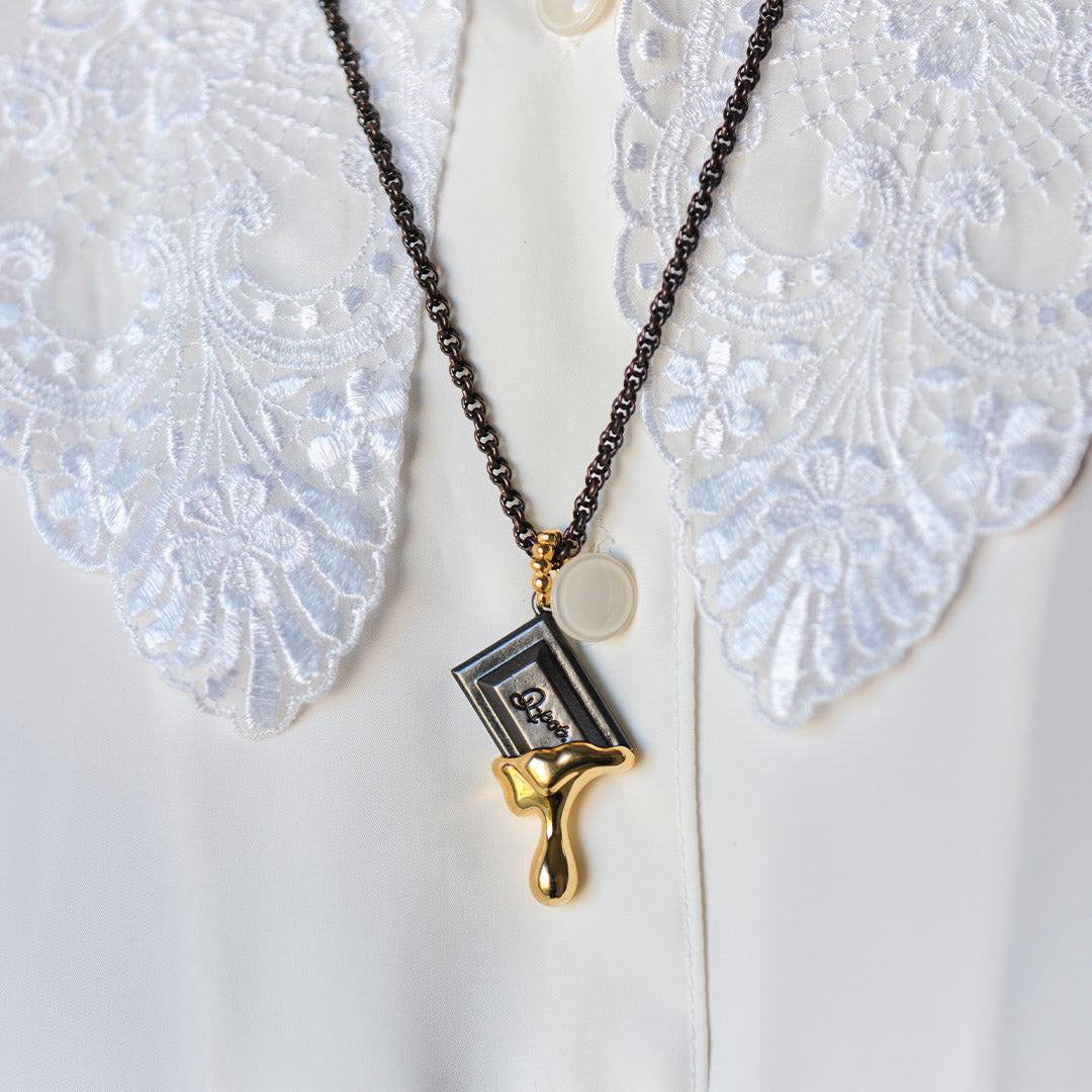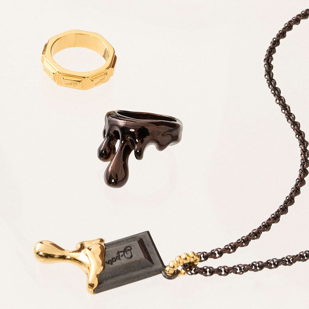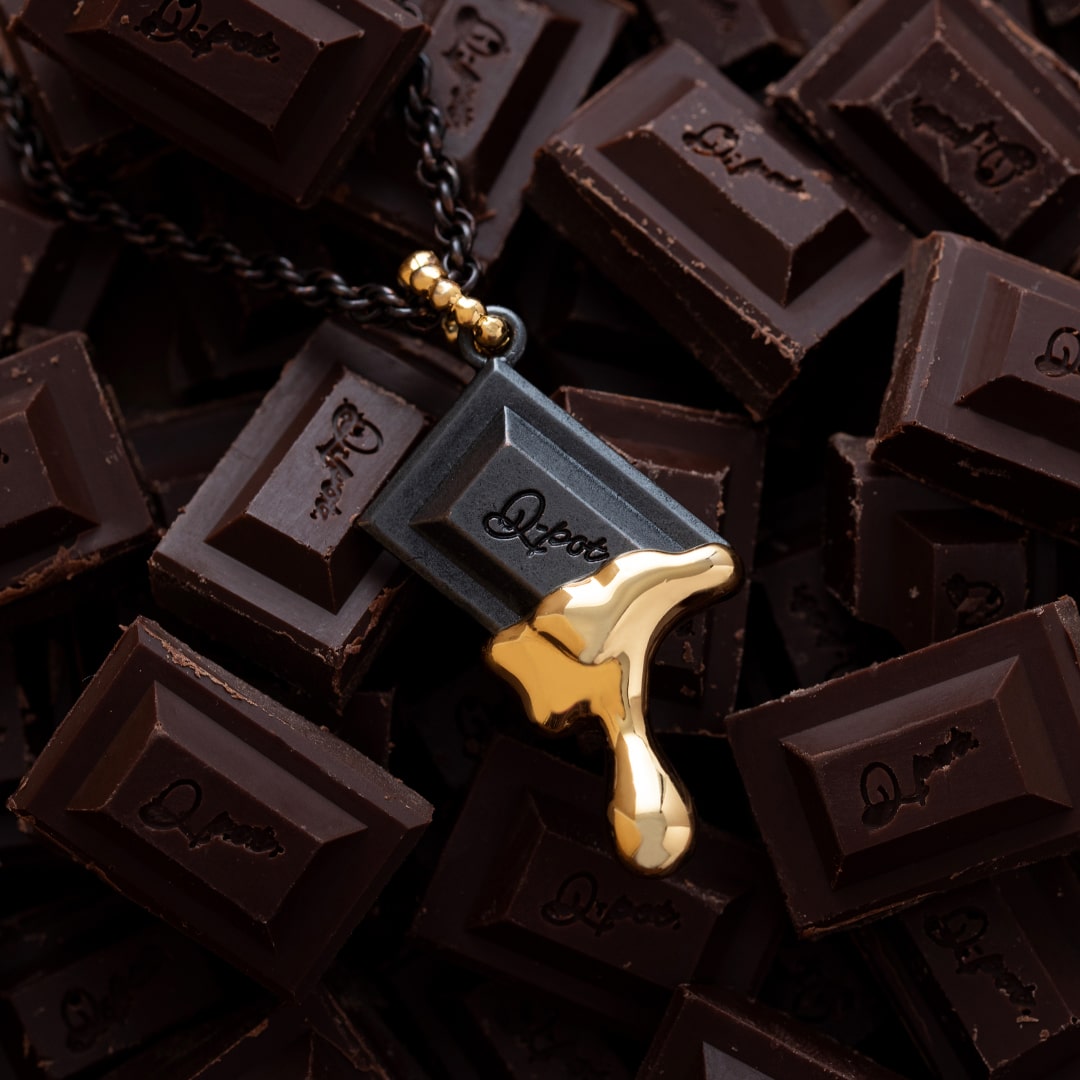 Piece of chocolate with Q-pot. logo engraved and dazzling dripping gold to express the moment of melting. The simple and sophisticated design goes well with a wide range of outfit. Enjoy Q-pot.'s wearable pop art!