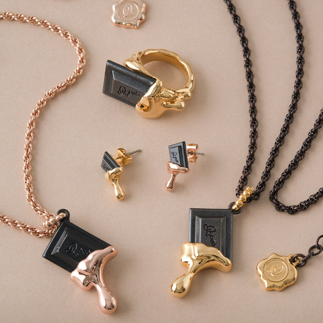 Piece of chocolate with Q-pot. logo engraved and dazzling dripping pink gold to express the moment of melting. The simple and sophisticated design goes well with a wide range of outfit. Enjoy Q-pot.'s wearable pop art!