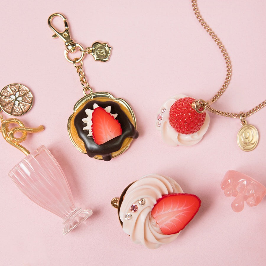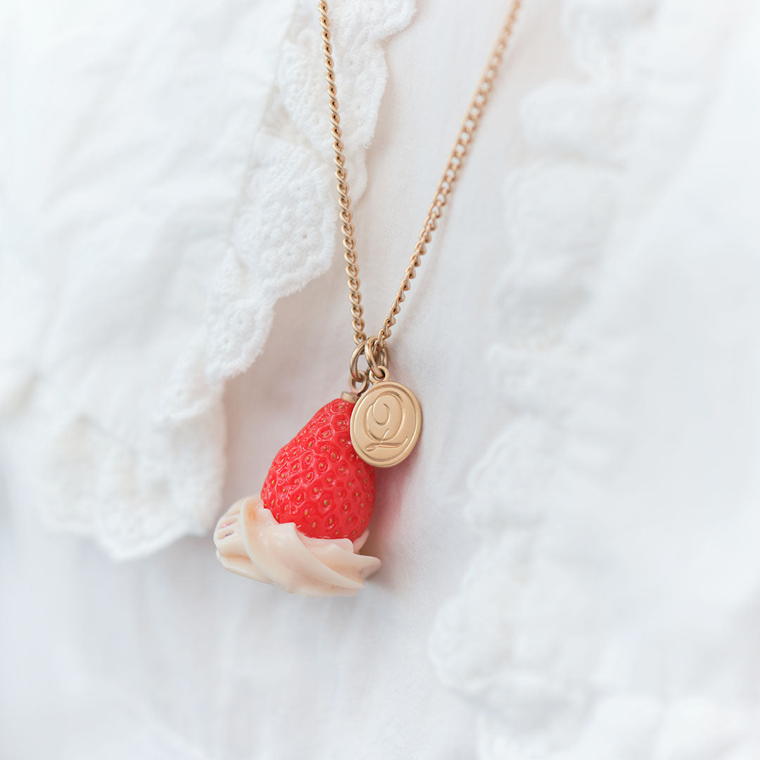 A necklace featuring a dollop of fluffy strawberry whipped cream topped with a whole, juicy strawberry. With its incredibly realistic and mouthwatering texture, this piece resembles an actual dessert. Every tiny seed on the strawberry has been meticulously crafted, showcasing exquisite attention to detail. Add a sweet touch to your outfit, just like decorating a cake! Made in Japan and carefully finished by craftsmen.