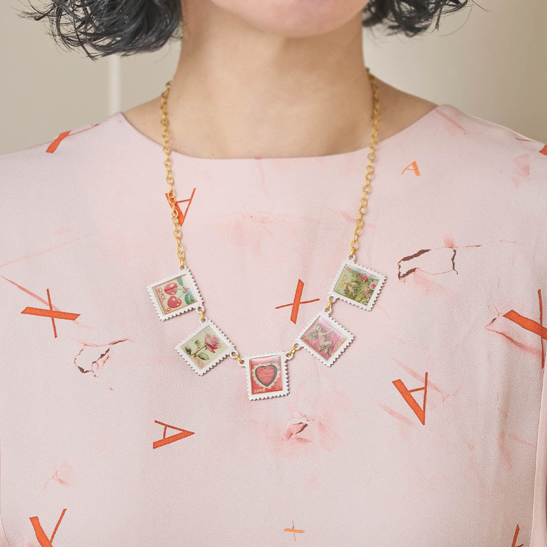 The centerpiece of this collection is a conceptual, statement-making necklace that links all five designs of the stamps. Attached to the necklace is a vibrant red sealing wax, carrying the meaning: "This feeling is a magic that can never be undone." The crimson hue symbolizes passion, life, and the very beat of a racing heart.