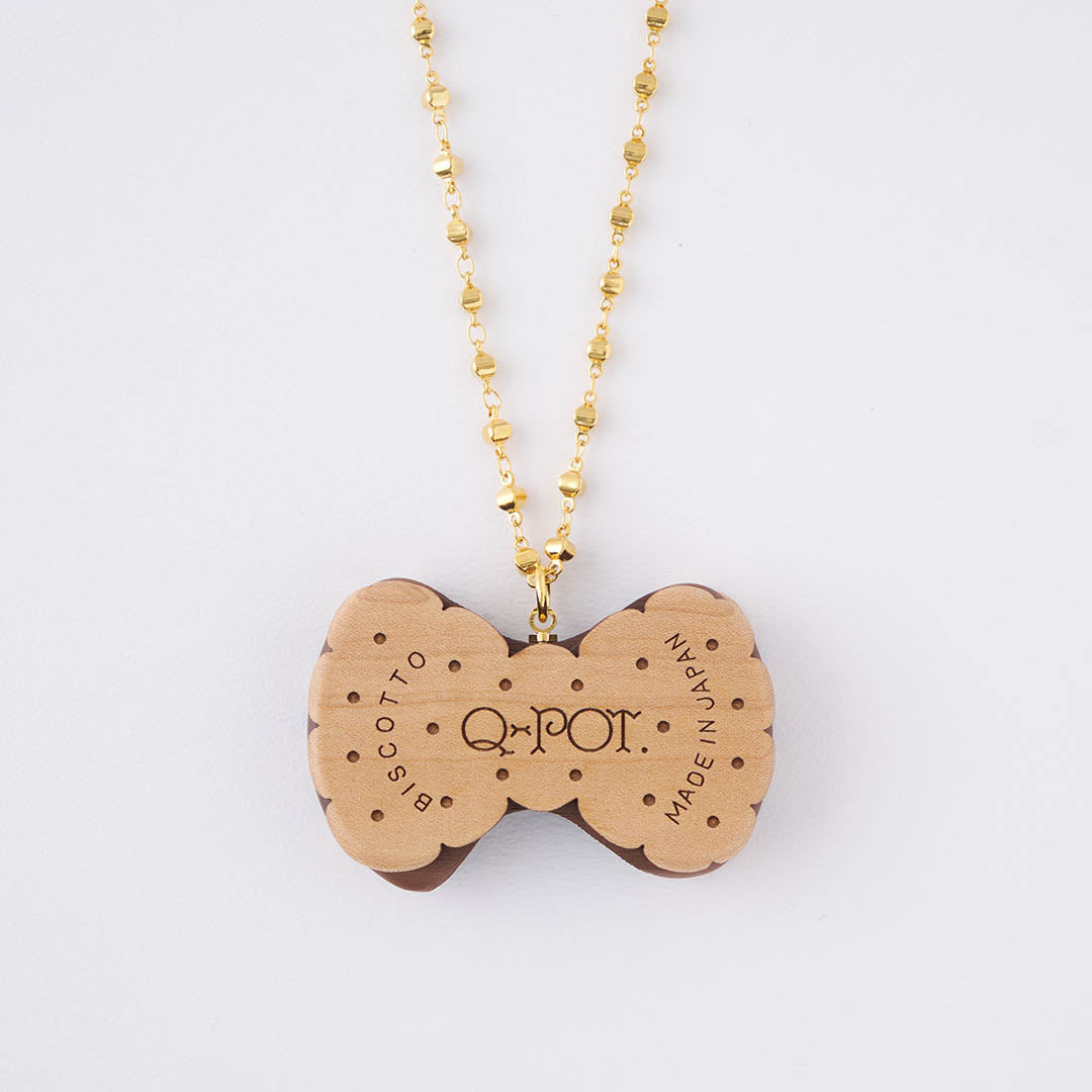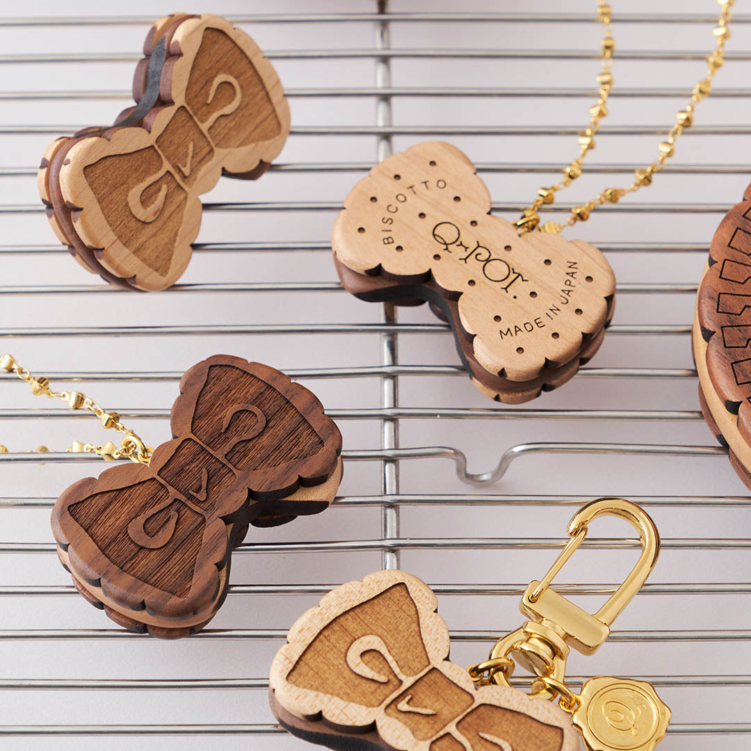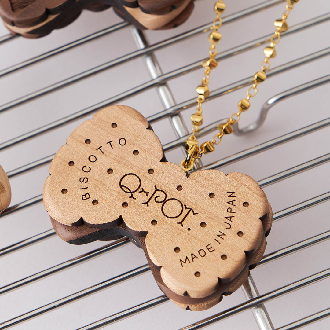 A ribbon-shaped biscuit is sandwiched with creamy filling, dripping with sweetness. Since no two wood grains are alike, each piece has a unique "baked" finish—just like real biscuits! The back is engraved with the Q-pot. logo.