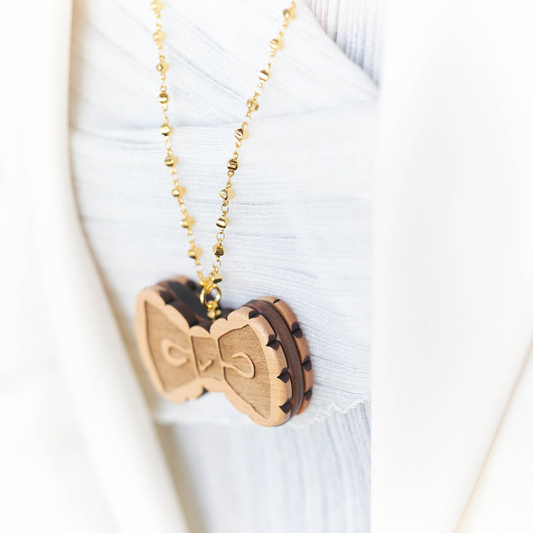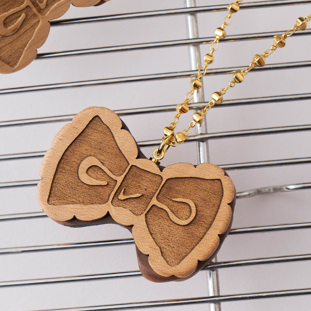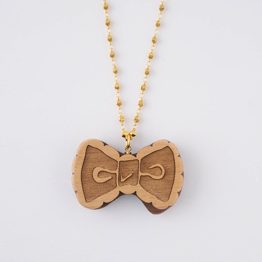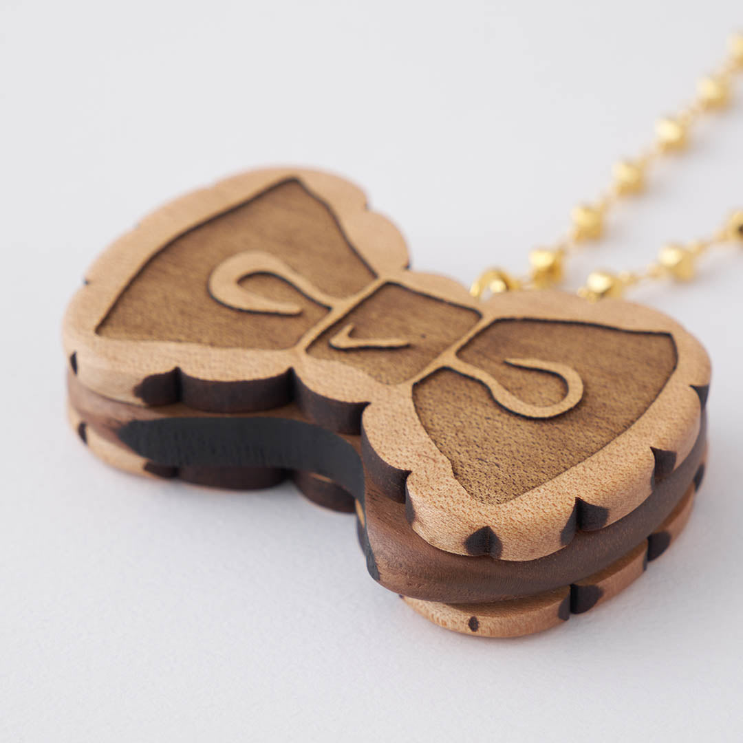 A ribbon-shaped biscuit is sandwiched with creamy filling, dripping with sweetness. Since no two wood grains are alike, each piece has a unique "baked" finish—just like real biscuits! The back is engraved with the Q-pot. logo.
