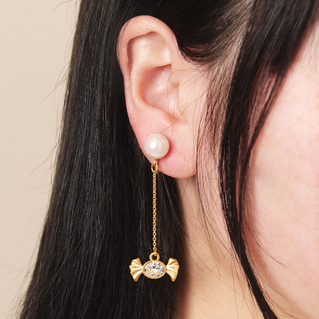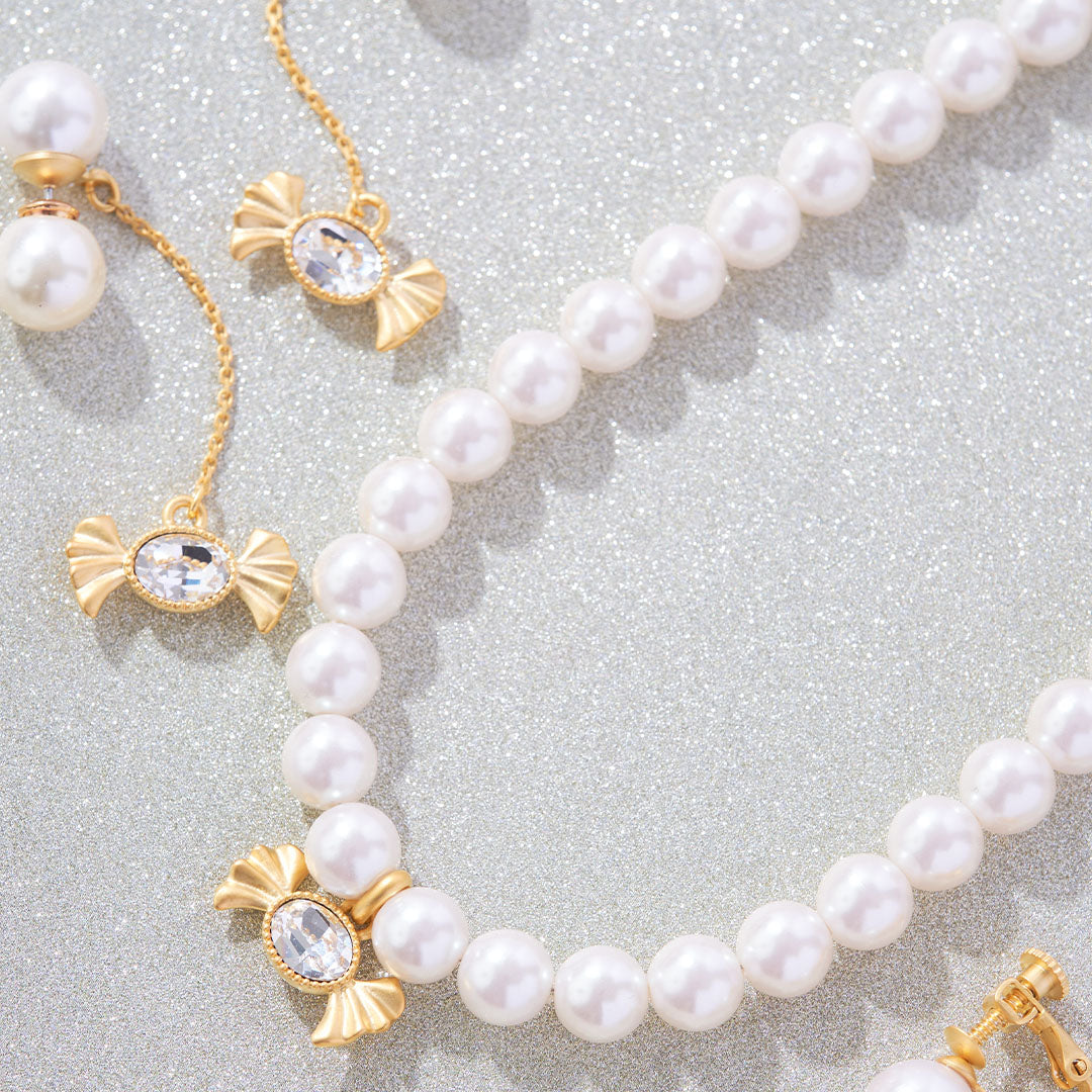 At the heart of candy gleams a delicate crystal glass, shimmering like a silver dragée. The way it catches and reflects light like a fine jewel creates a truly enchanting glow. These romantic pearl pieces are versatile essentials, adding a brilliant touch to both daily wear and dressed-up styles.