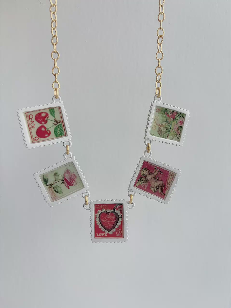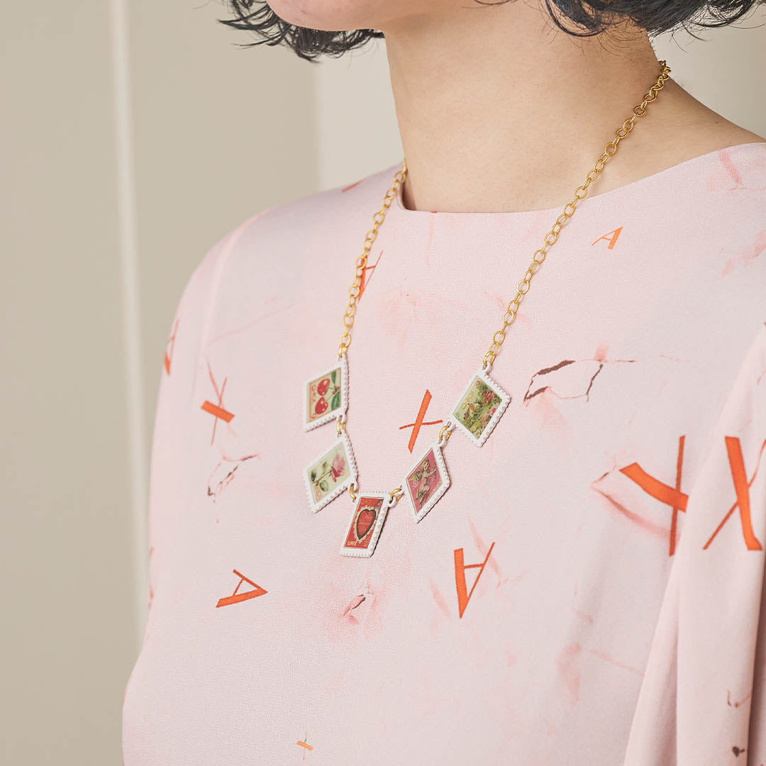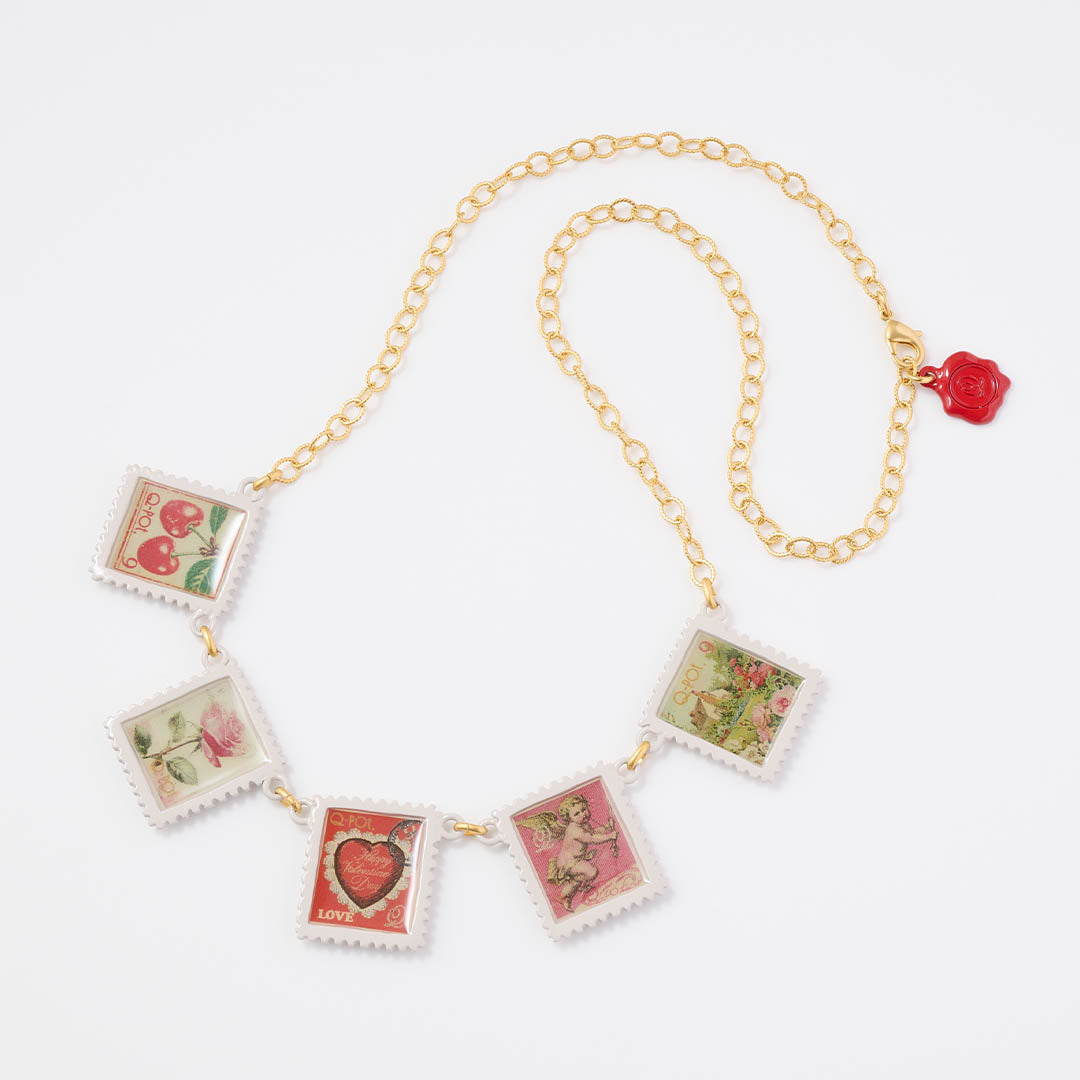 The centerpiece of this collection is a conceptual, statement-making necklace that links all five designs of the stamps. Attached to the necklace is a vibrant red sealing wax, carrying the meaning: "This feeling is a magic that can never be undone." The crimson hue symbolizes passion, life, and the very beat of a racing heart.