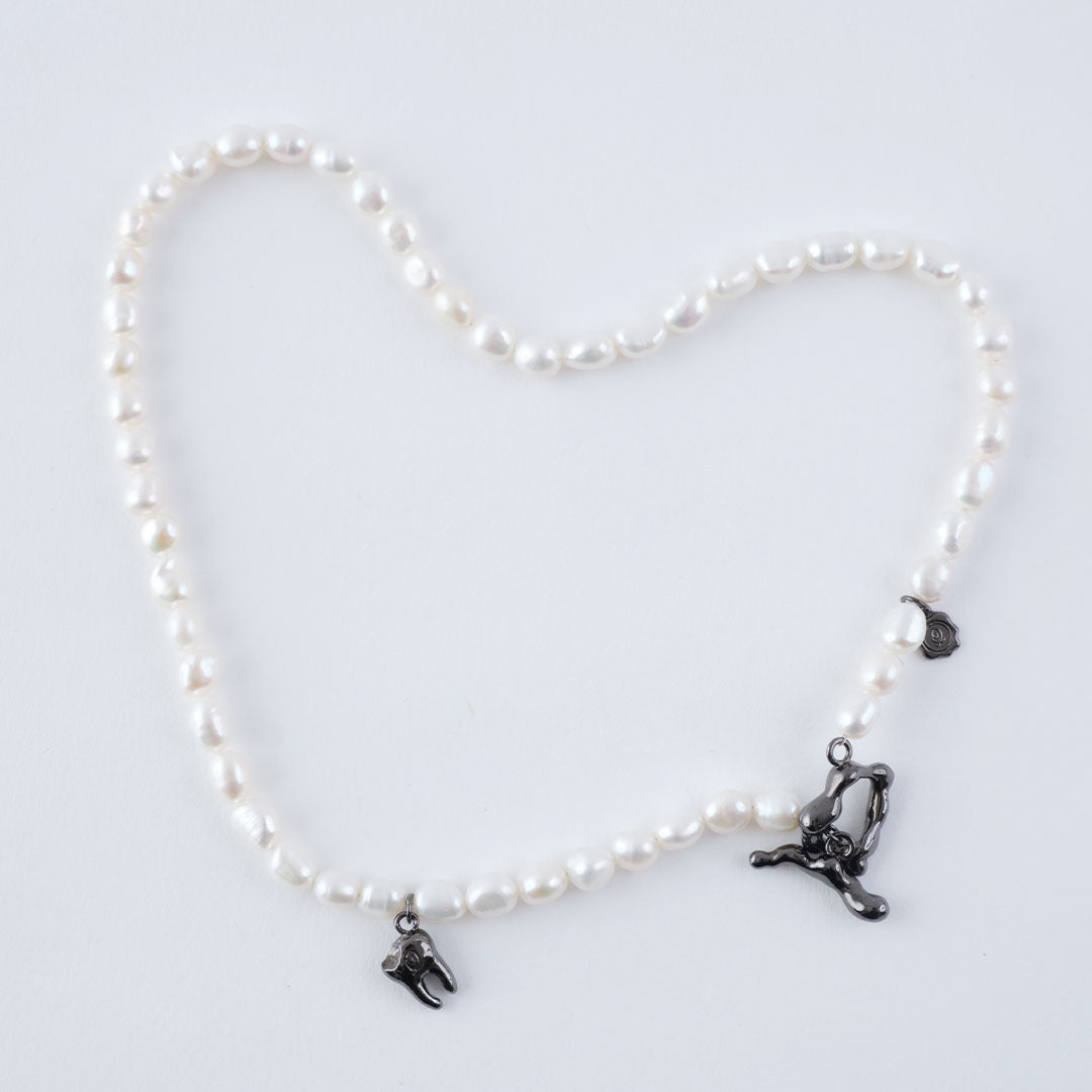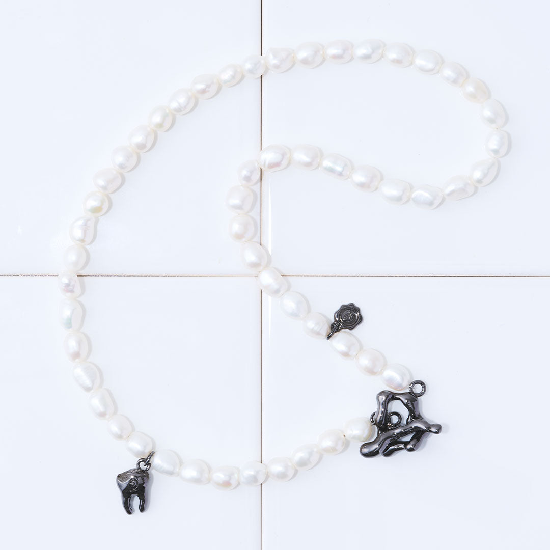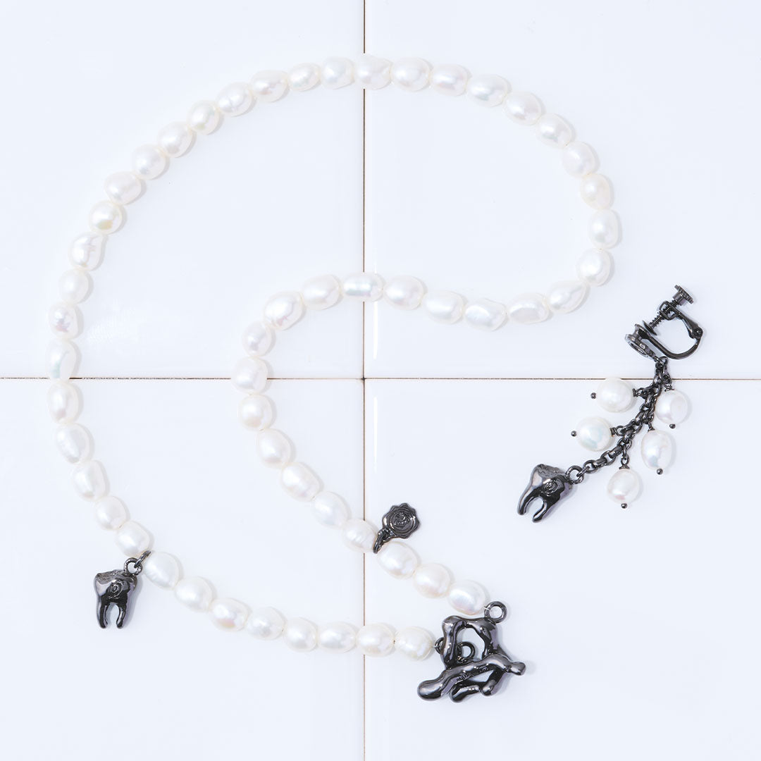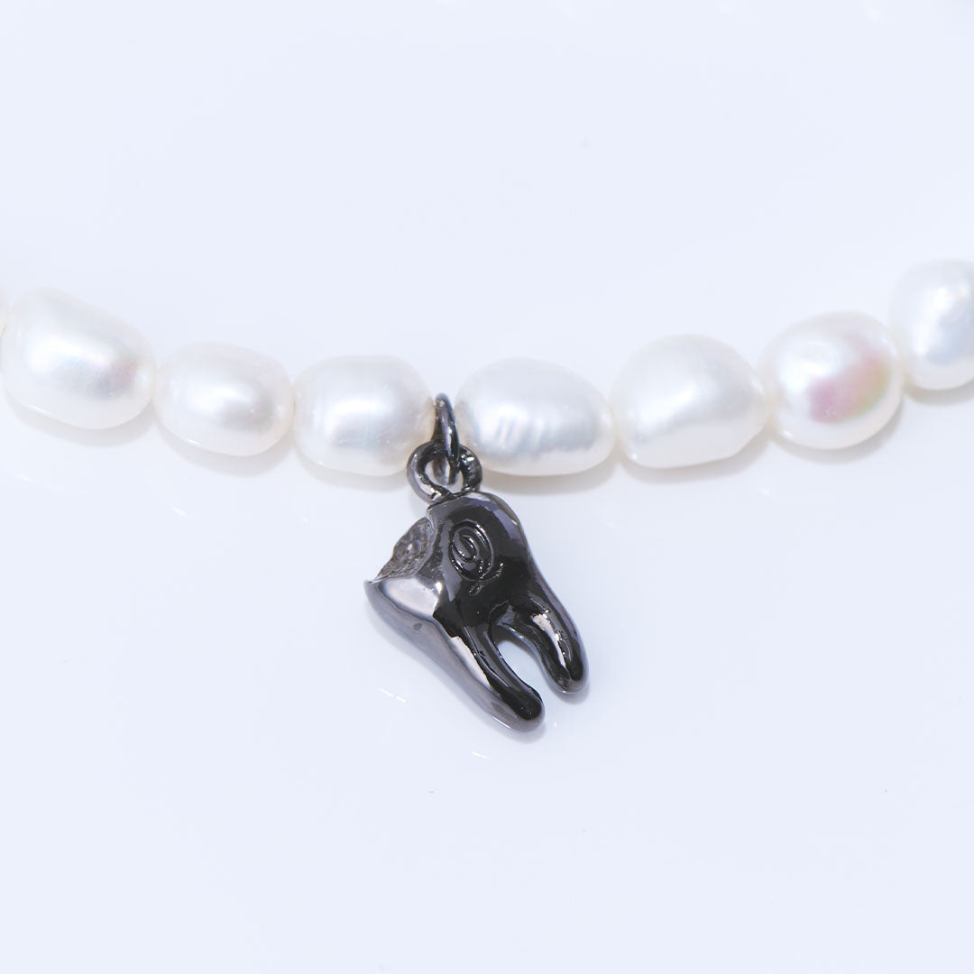The tooth motif, iconic to Q-pot., is featured in this stylish natural stone necklace, blending the elegance of pearls with the surrealism of a tooth. Baroque freshwater pearls are strung like perfect teeth, adorned with a piece of bad tooth with cavity.