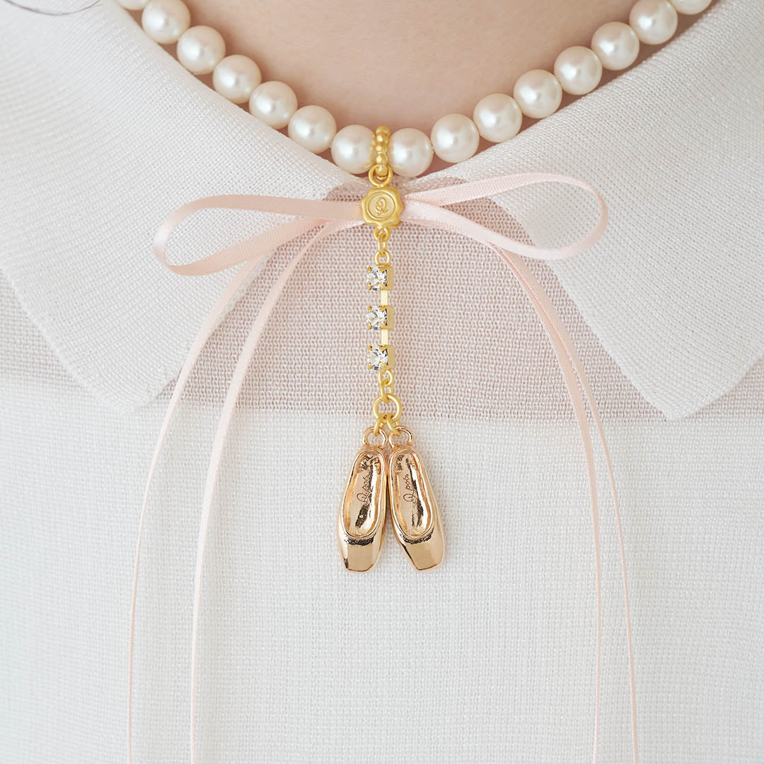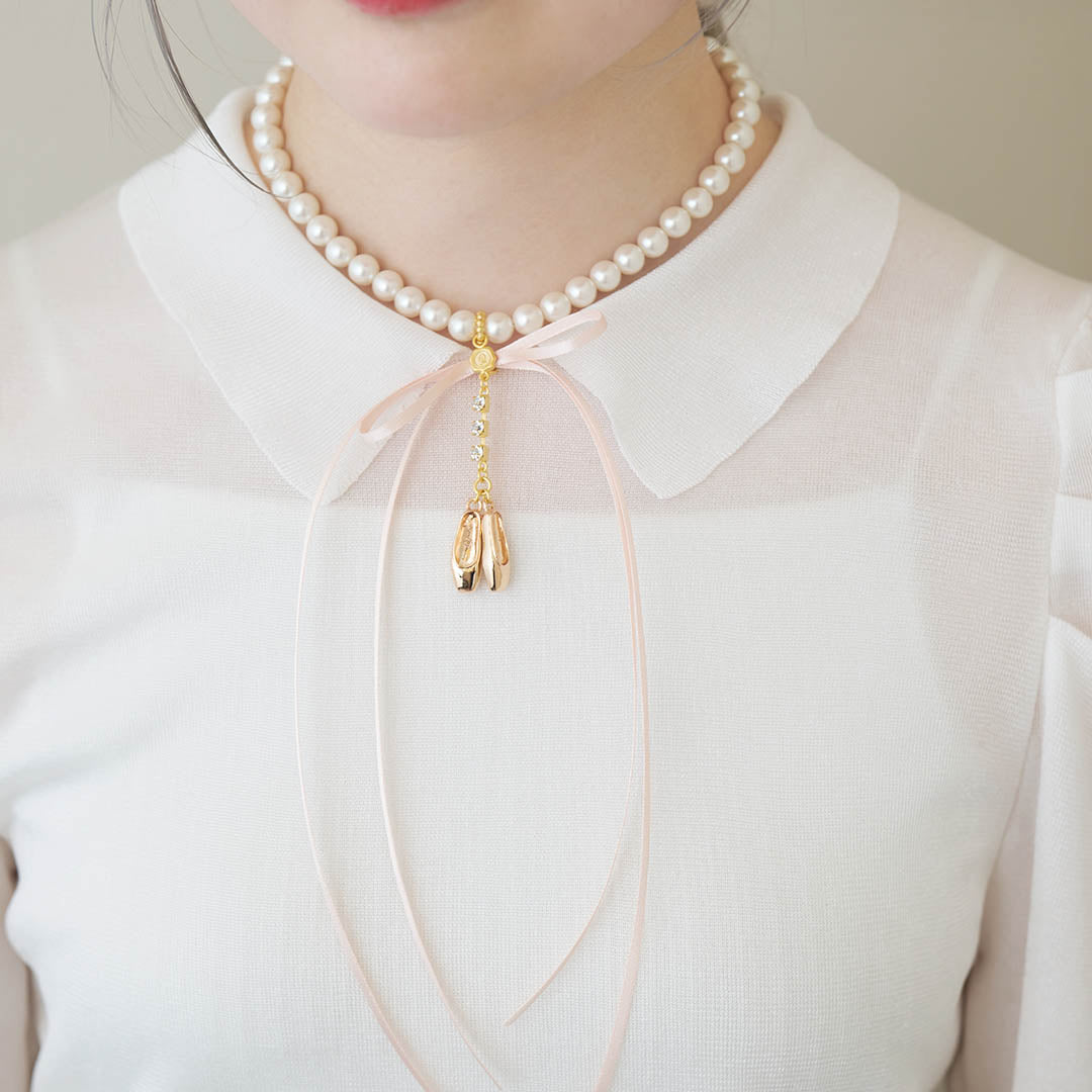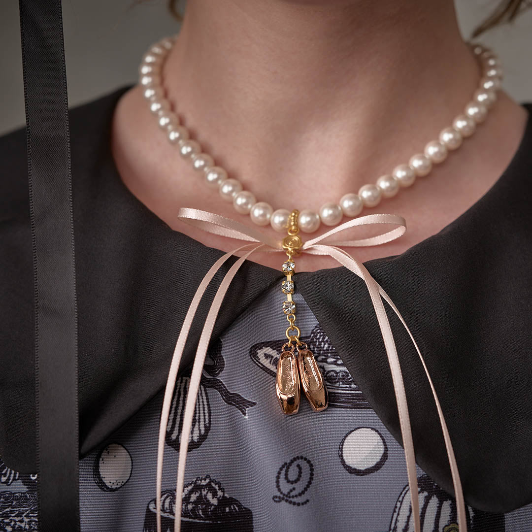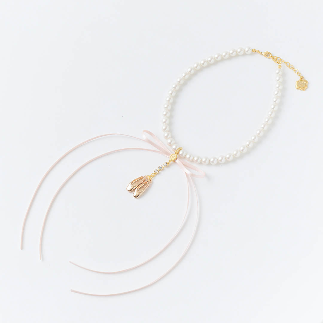 A statement necklace strung with softly glowing milky-white pearls, featuring the beloved motif of pointe shoes—a timeless symbol of ballerinas. Swaying rhinestones add a romantic sparkle, while the delicately arched satin ribbons, layered twofold, gracefully evoke the elegance and poise of a ballerina in motion.