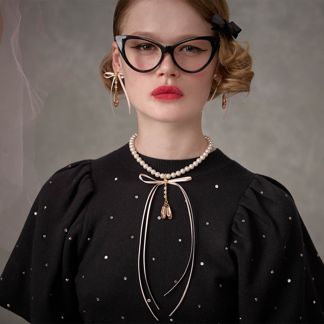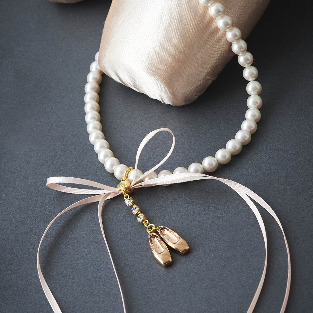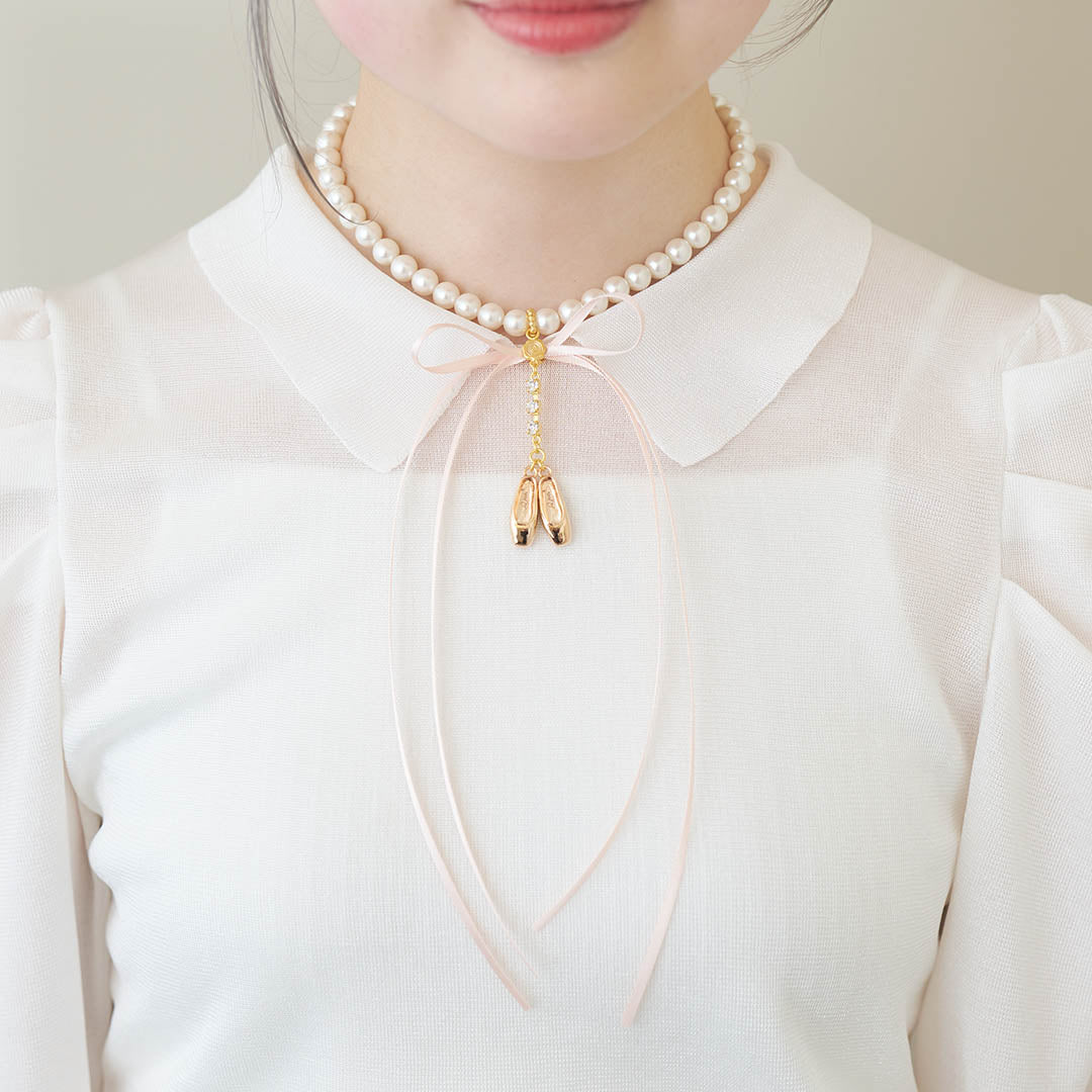 A statement necklace strung with softly glowing milky-white pearls, featuring the beloved motif of pointe shoes—a timeless symbol of ballerinas. Swaying rhinestones add a romantic sparkle, while the delicately arched satin ribbons, layered twofold, gracefully evoke the elegance and poise of a ballerina in motion.