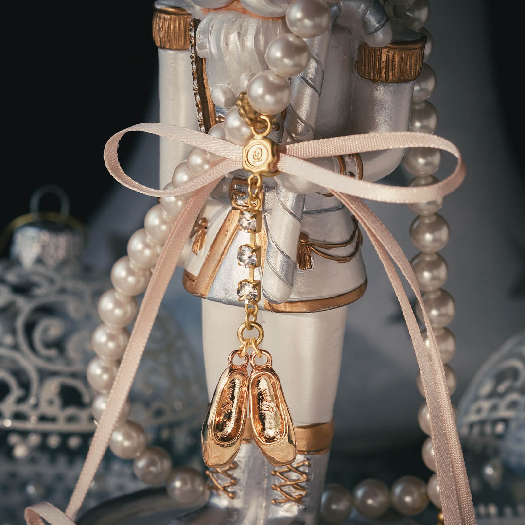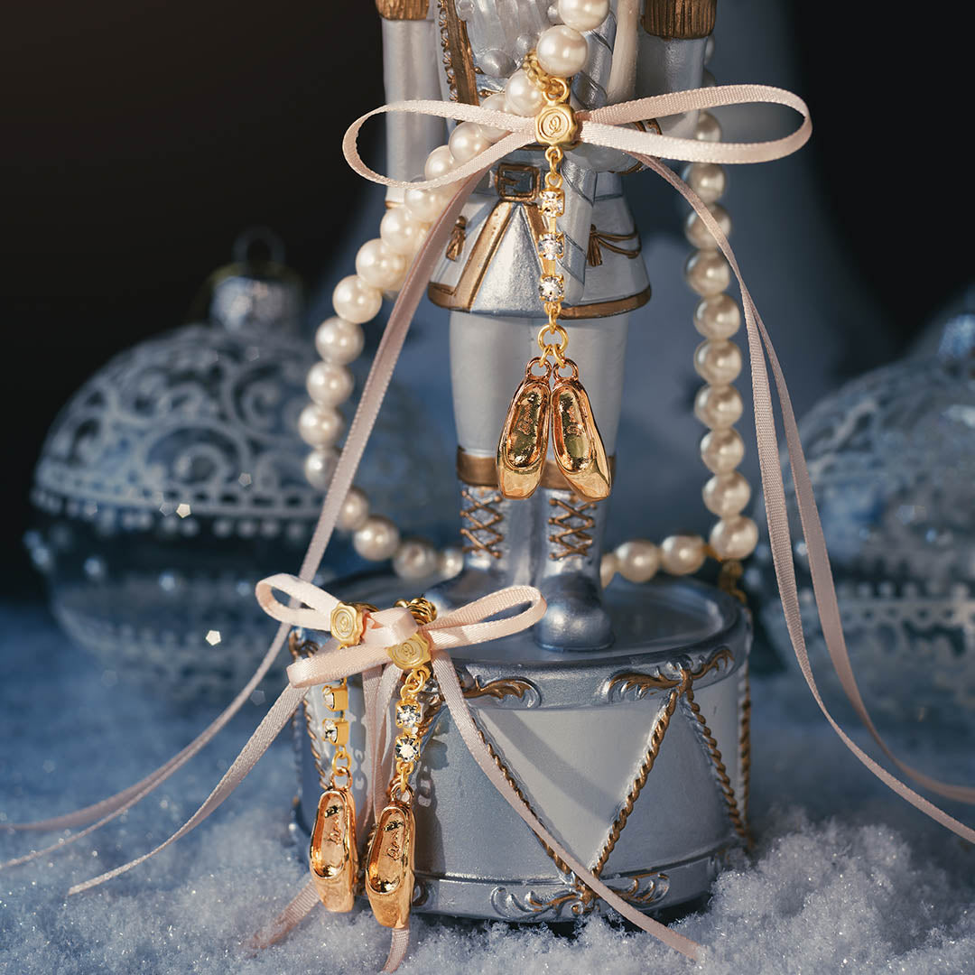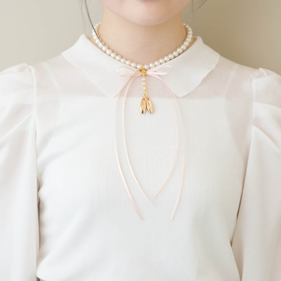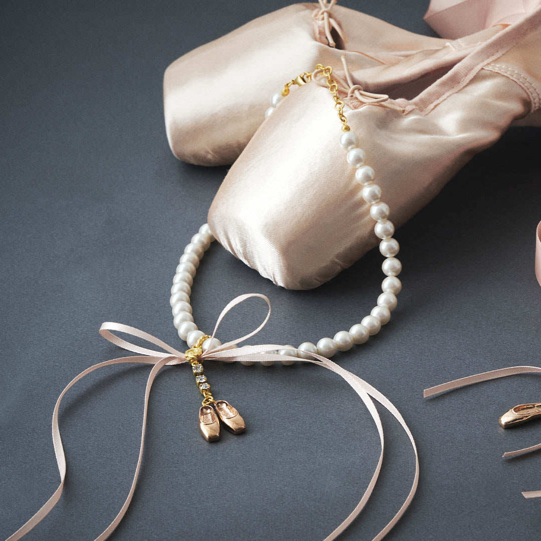 A statement necklace strung with softly glowing milky-white pearls, featuring the beloved motif of pointe shoes—a timeless symbol of ballerinas. Swaying rhinestones add a romantic sparkle, while the delicately arched satin ribbons, layered twofold, gracefully evoke the elegance and poise of a ballerina in motion.