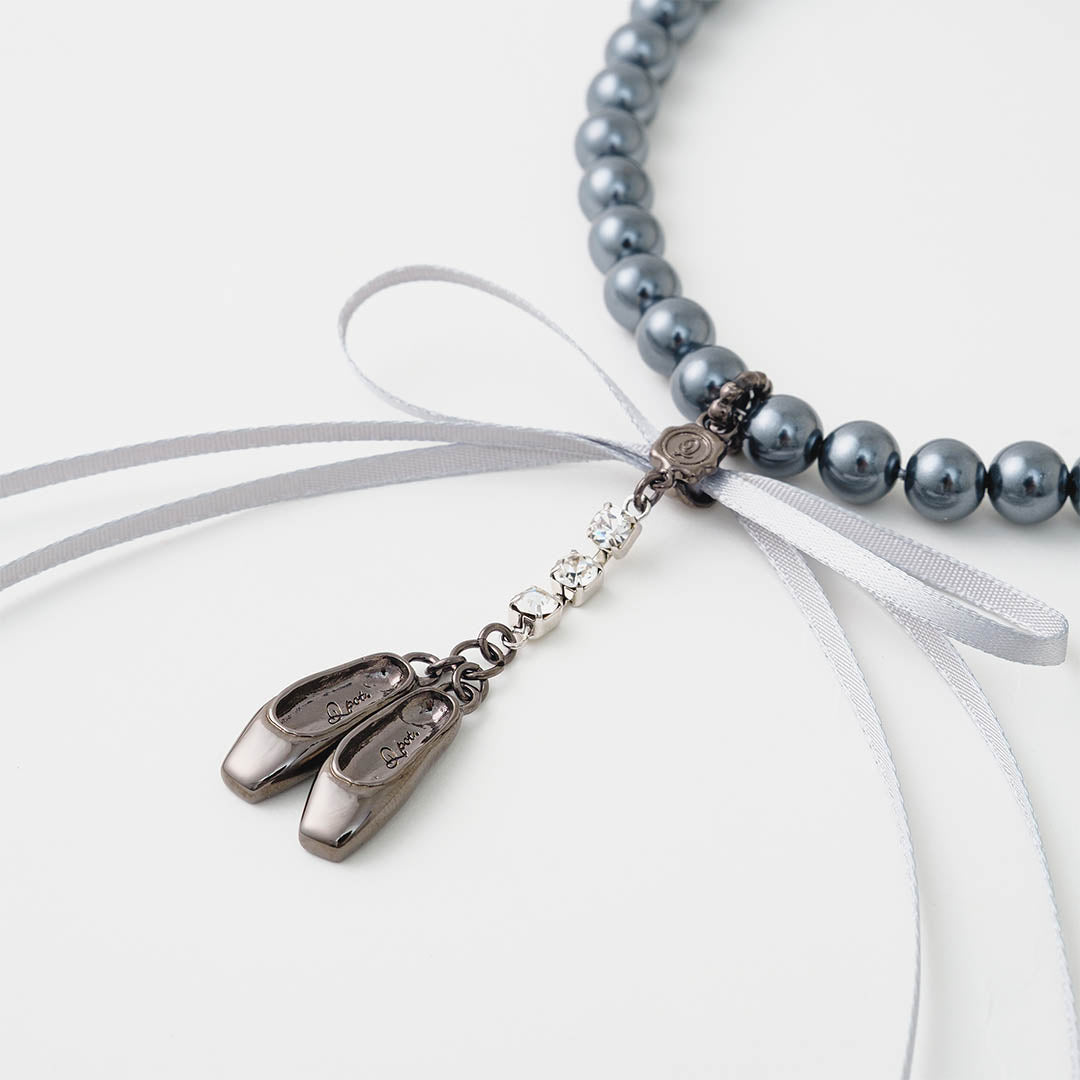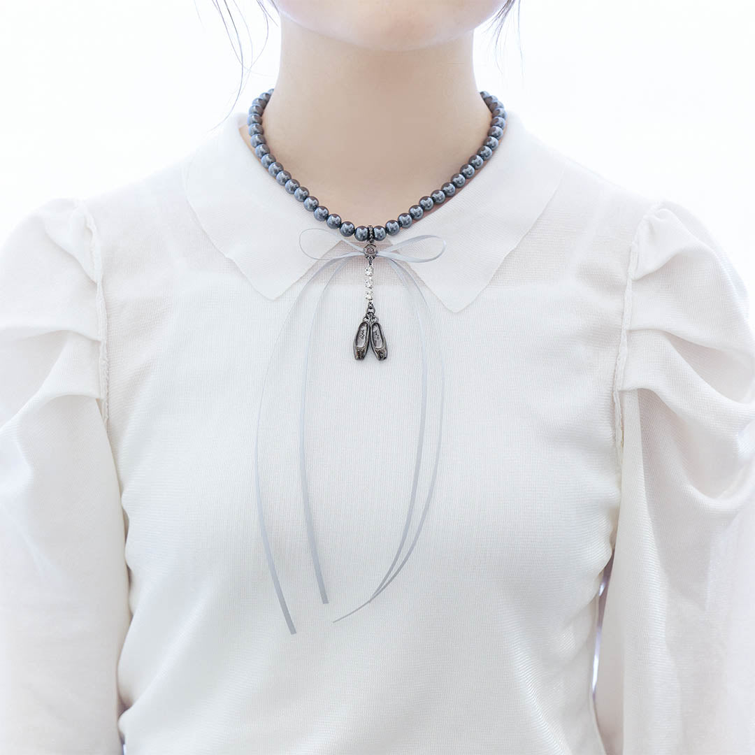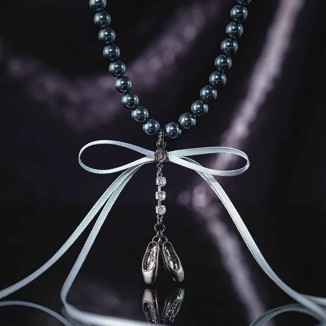 A statement necklace inspired by Black Swan strung with jet black pearls, featuring the beloved motif of pointe shoes—a timeless symbol of ballerinas. Swaying rhinestones add a romantic sparkle, while the delicately arched satin ribbons, layered twofold, gracefully evoke the elegance and poise of a ballerina in motion.