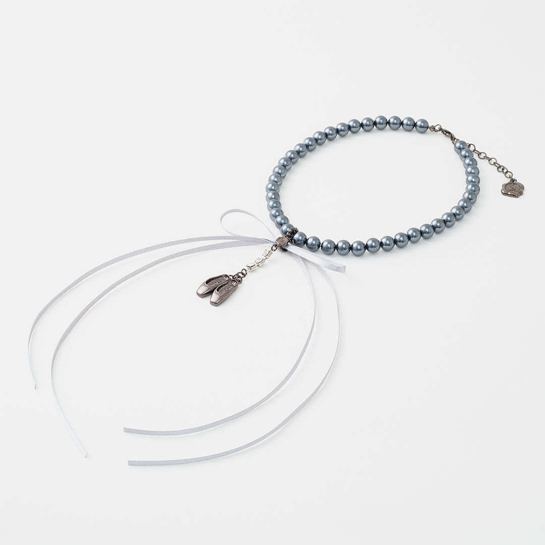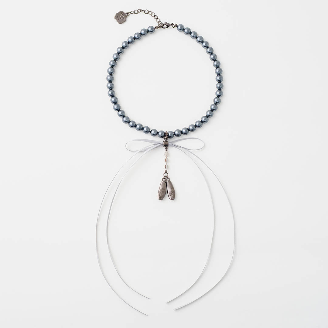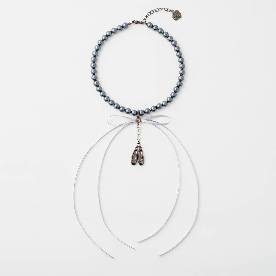 A statement necklace inspired by Black Swan strung with jet black pearls, featuring the beloved motif of pointe shoes—a timeless symbol of ballerinas. Swaying rhinestones add a romantic sparkle, while the delicately arched satin ribbons, layered twofold, gracefully evoke the elegance and poise of a ballerina in motion.