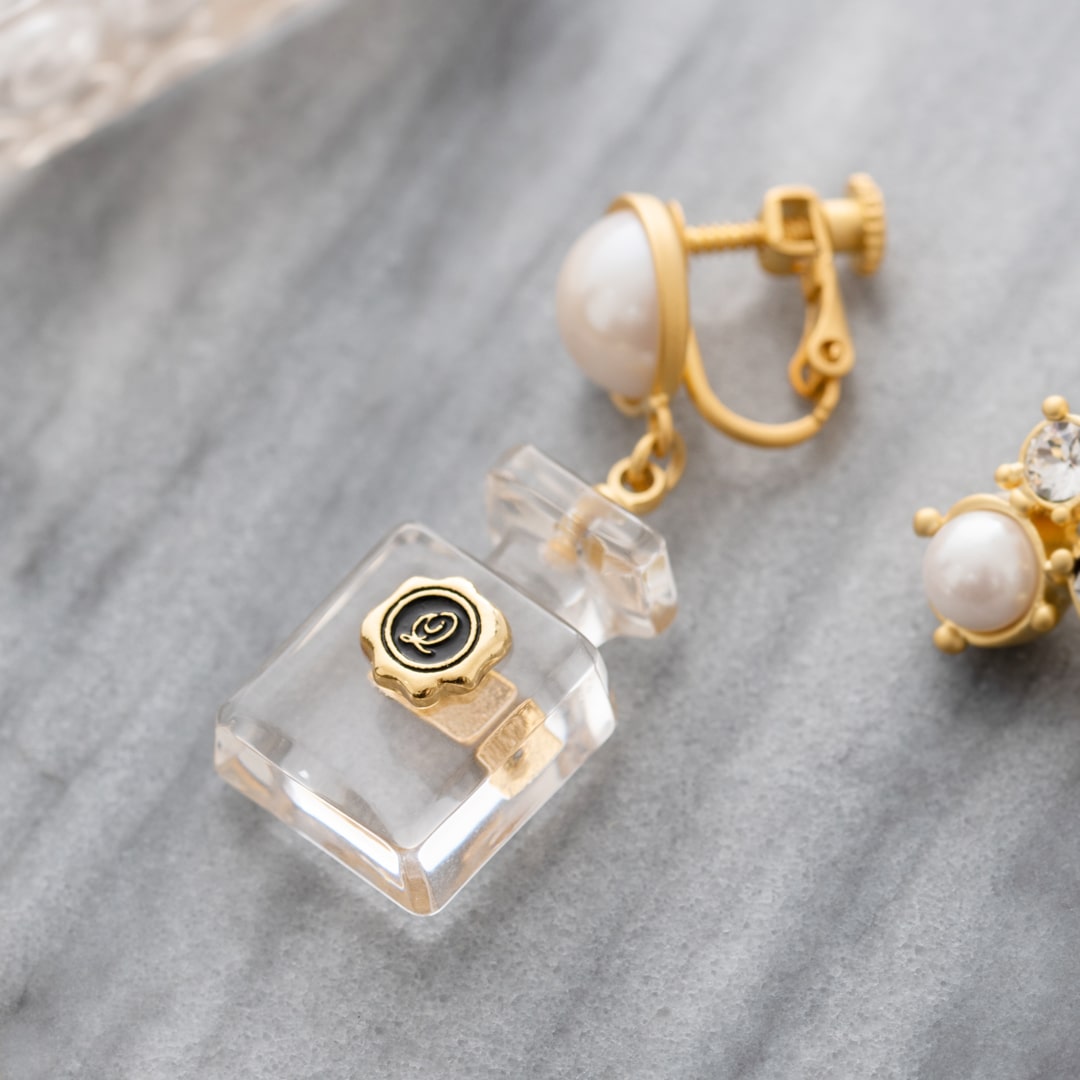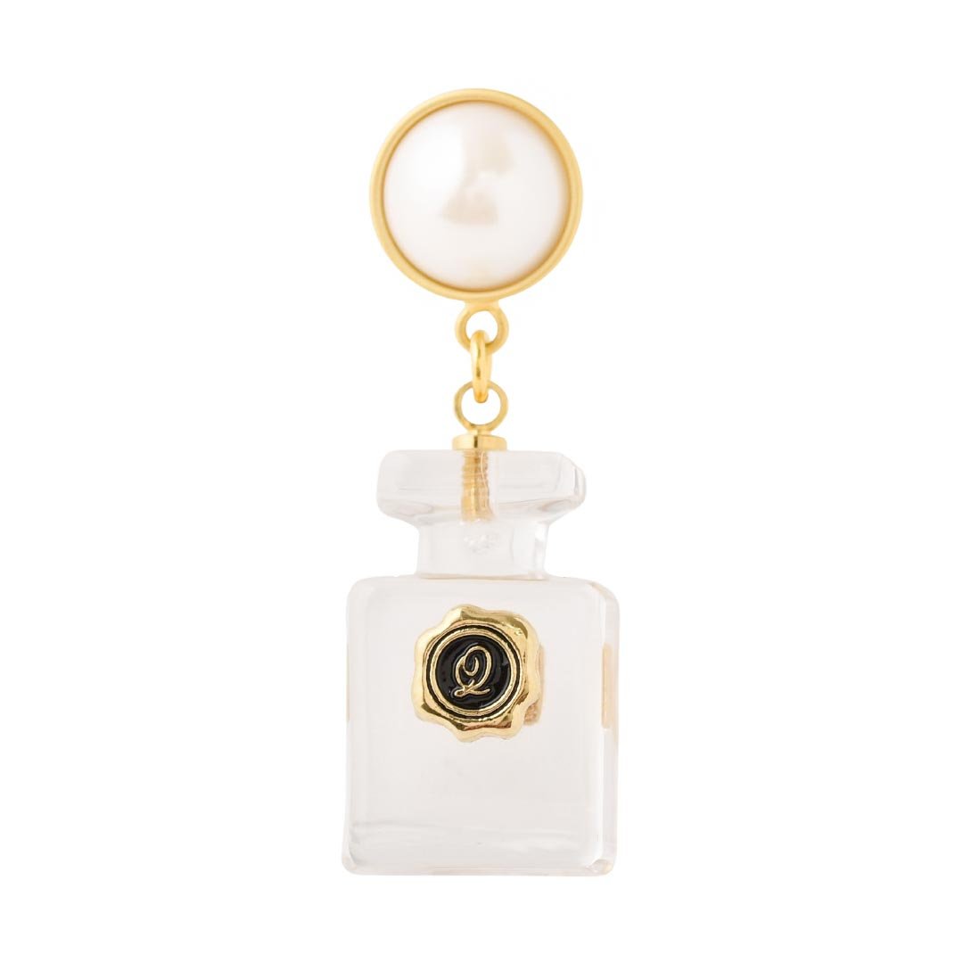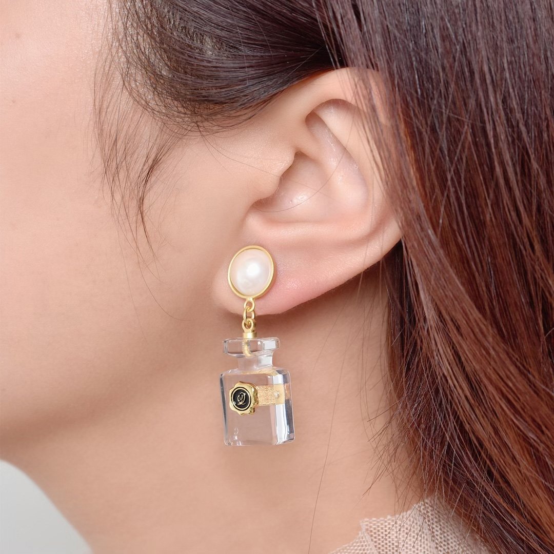 A small perfume bottle shimmers in an elegantly shining pearl. Decorate your ears with perfume bottle jewelry. Made in Japan and carefully finished by craftsmen.