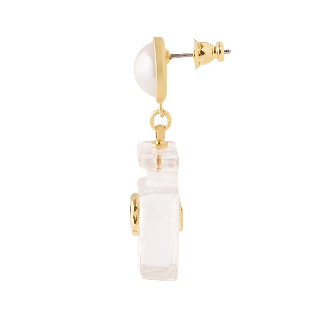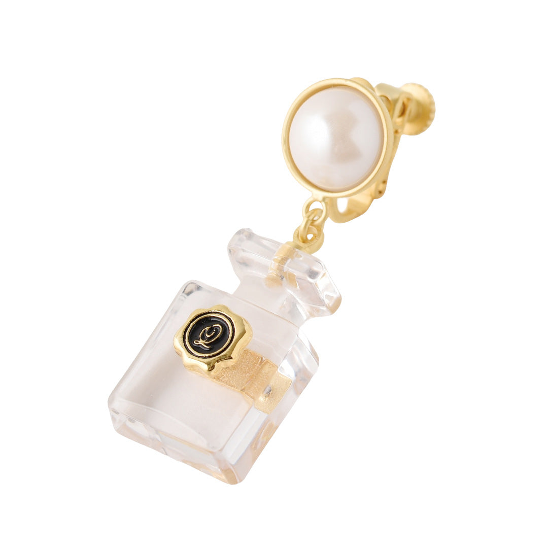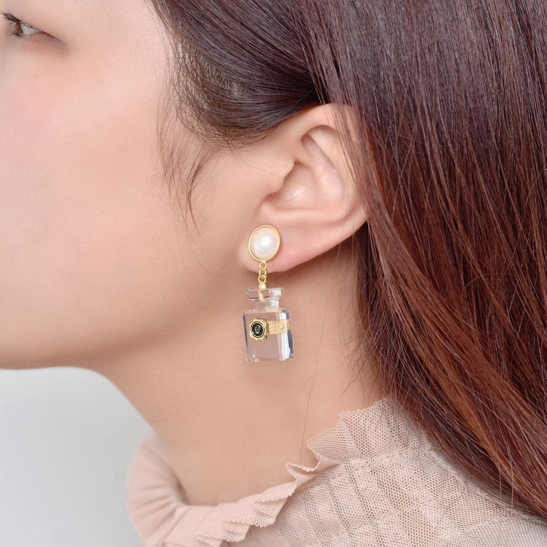 A small perfume bottle shimmers in an elegantly shining pearl. Decorate your ears with perfume bottle jewelry. Made in Japan and carefully finished by craftsmen.