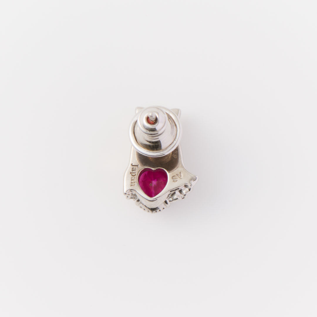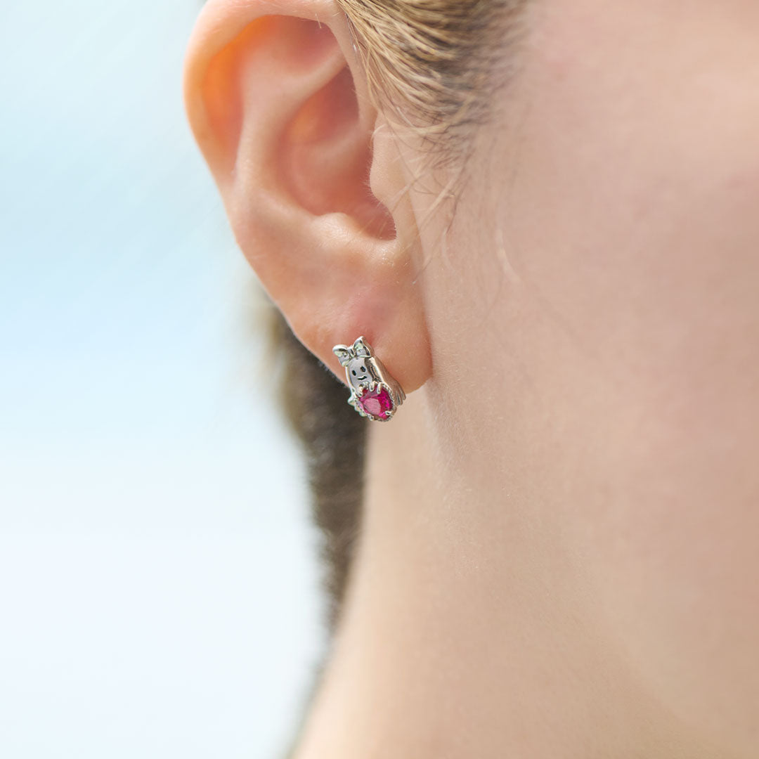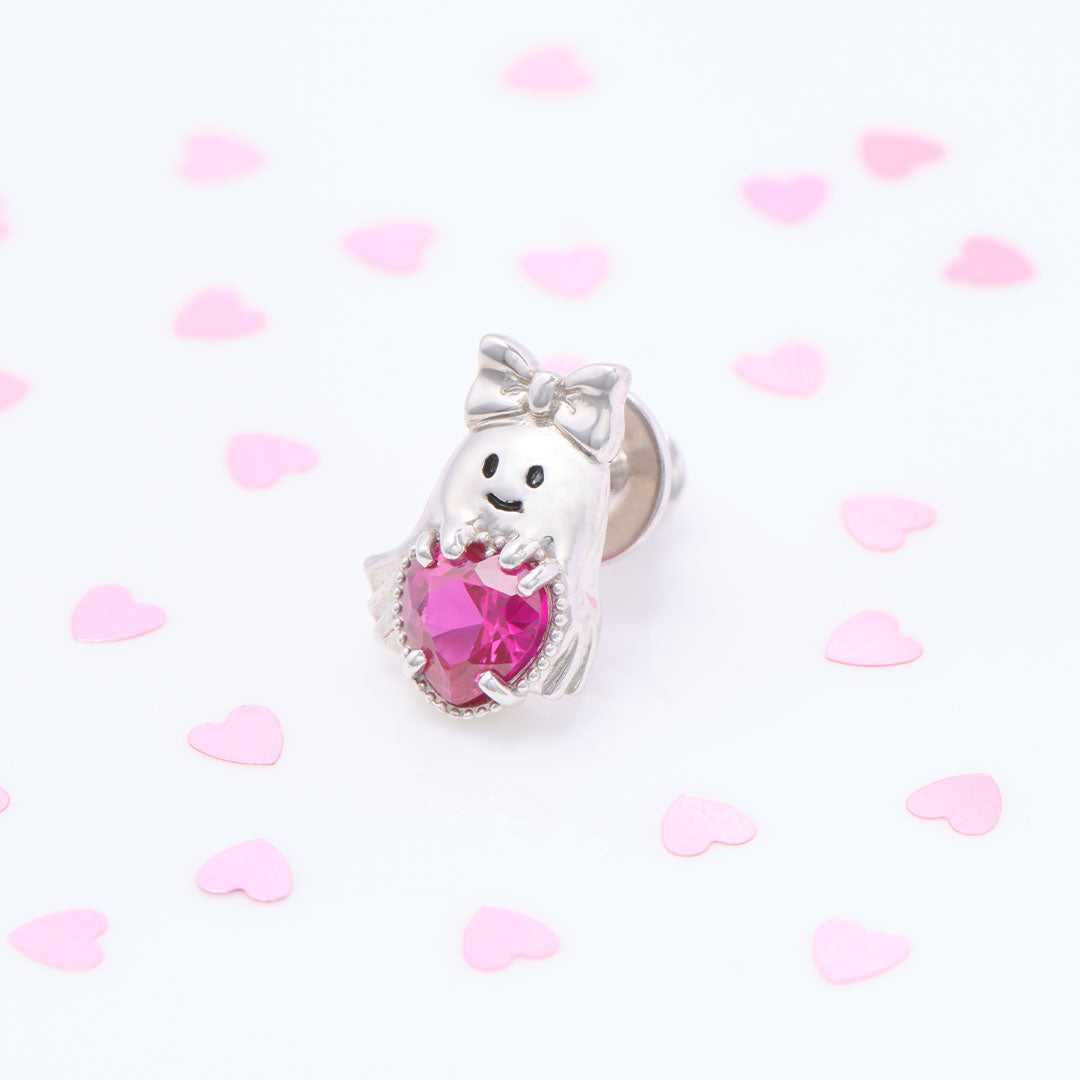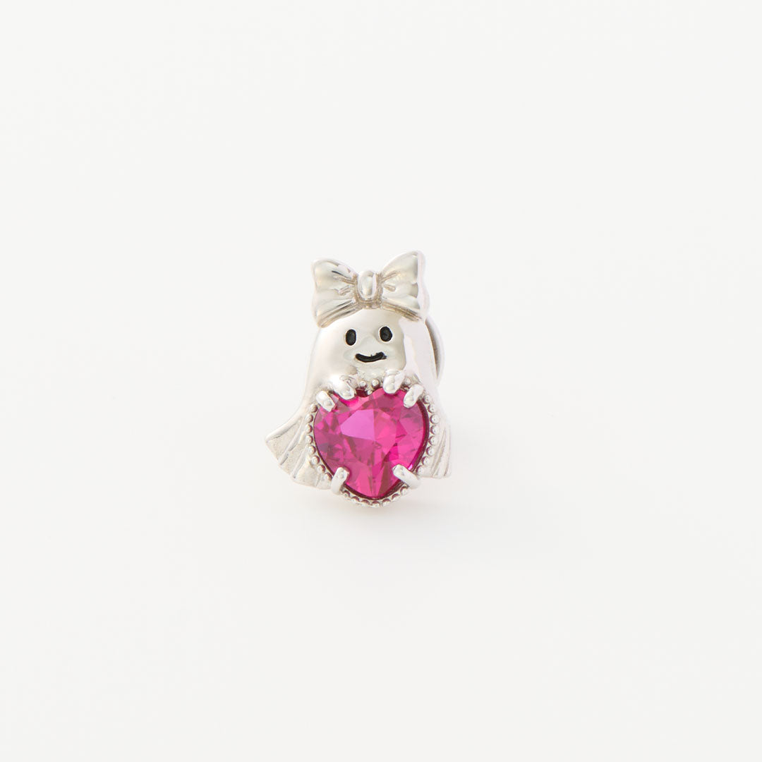Q-pot.’s smallest ever "Ghost Q" is all dressed up with a big ribbon, charmingly hugging a heart with an adorable expression. The heart, sparkling like candy, is made of a sophisticated synthetic ruby. The intricate frame surrounding the heart adds a luxurious touch. The delicate details of fluttering sheet as if the Ghost Q is floating in the air.
