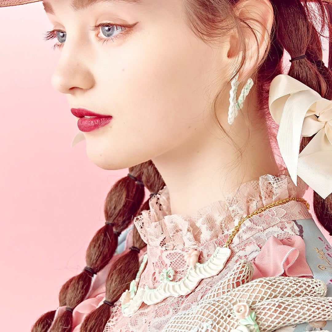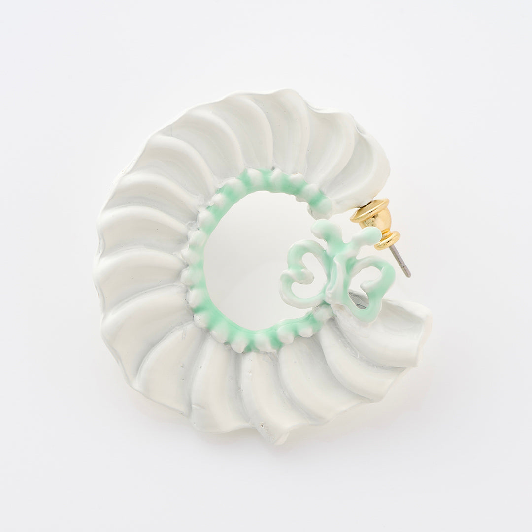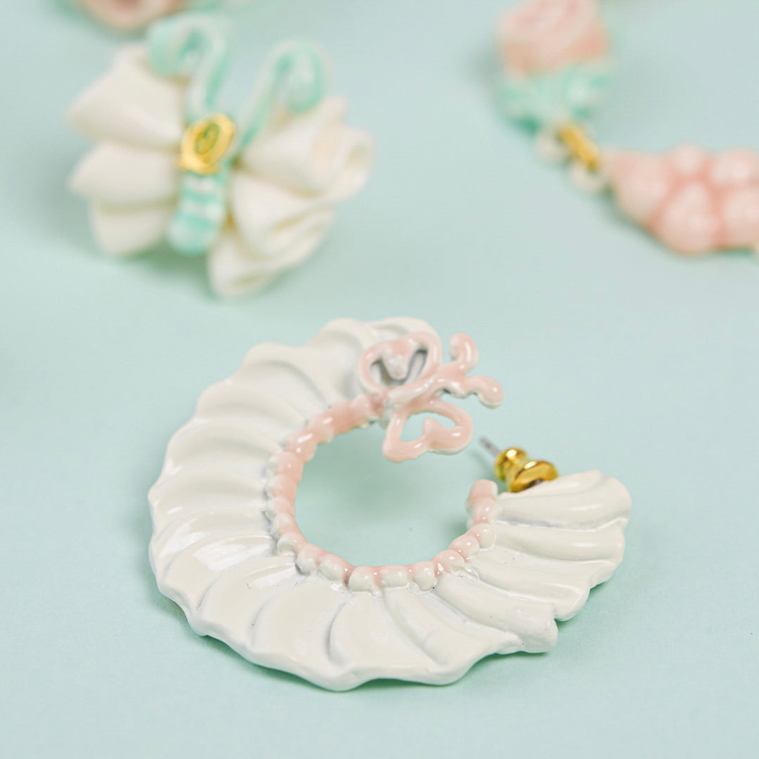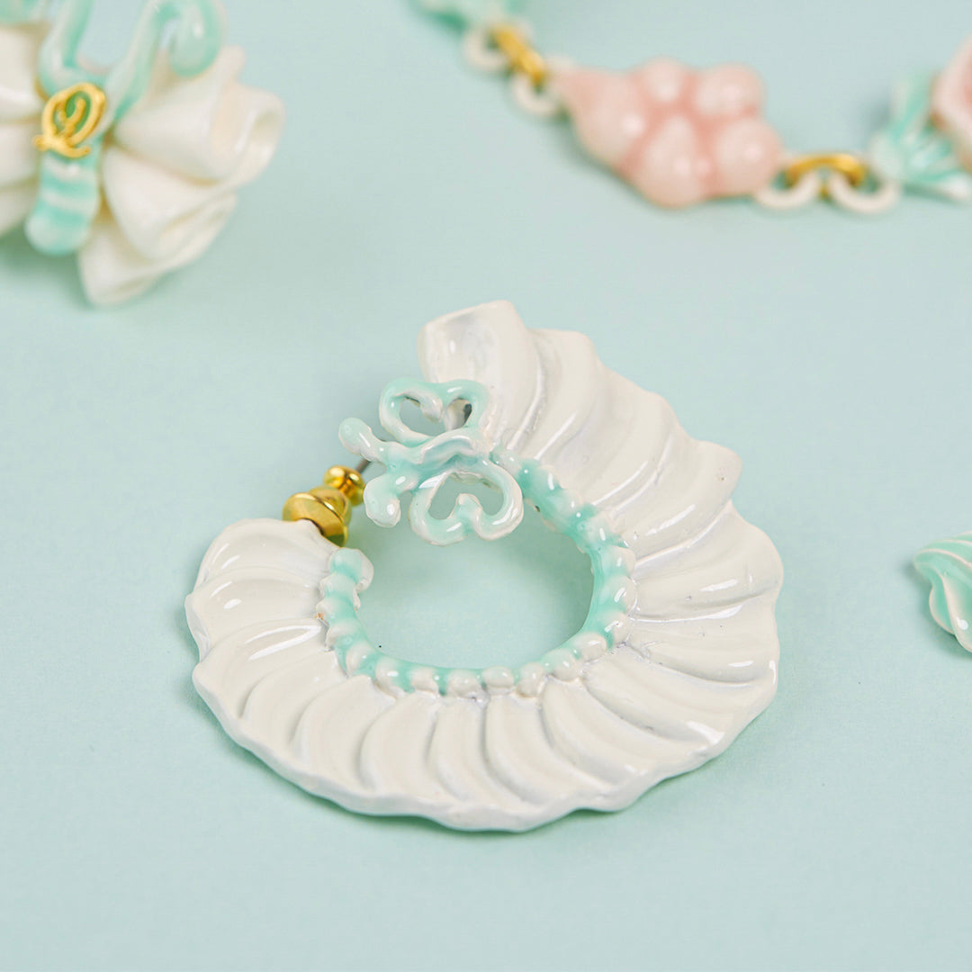 A pair earrings decorated with frill cream with a light step like a waltz curve and butterflies like a rest. You can enjoy pink and mint in a bicolor set.
