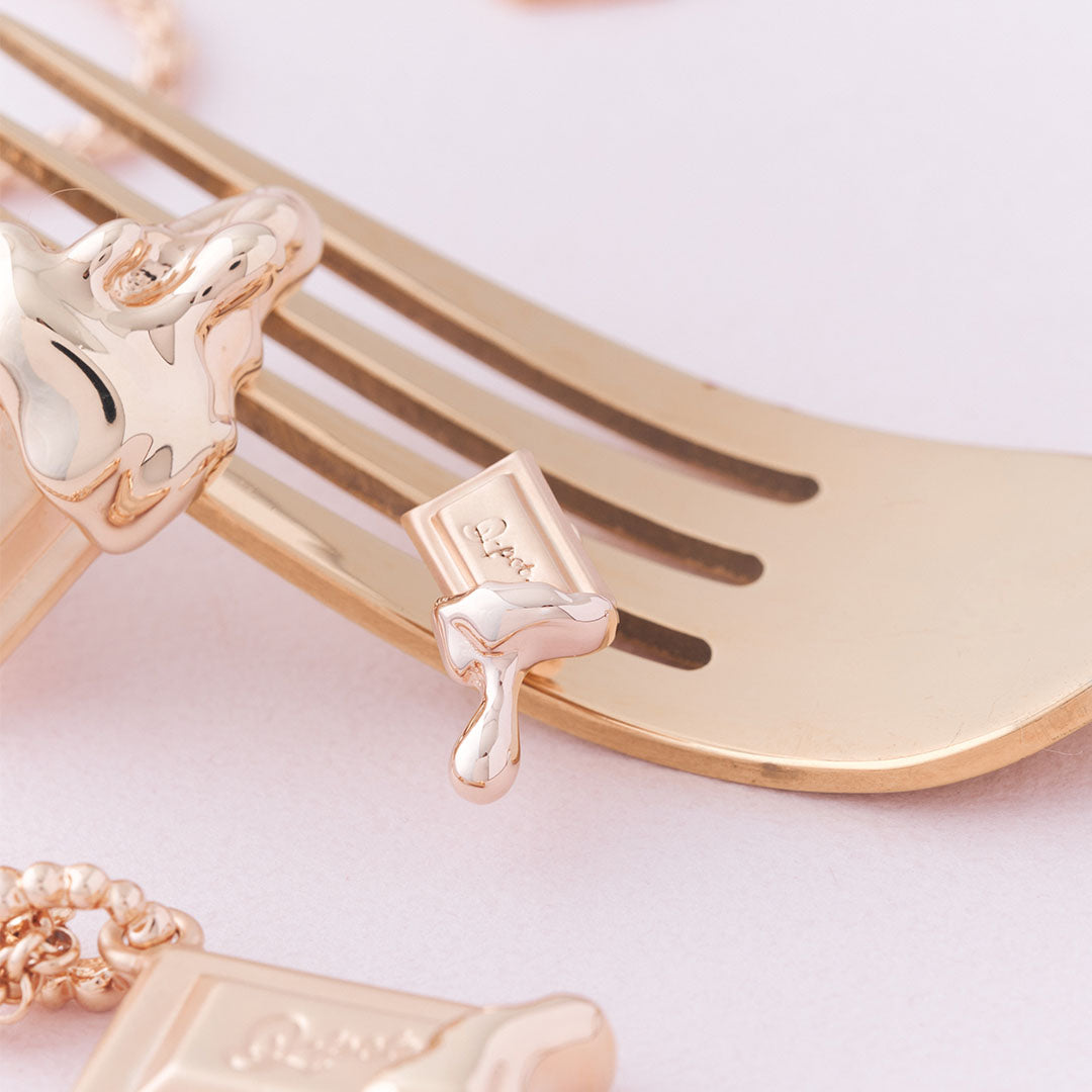 Piece of chocolate with Q-pot. logo engraved and dazzling ping gold dripping to express the moment of melting. The simple and sophisticated design goes well with a wide range of outfit. Enjoy Q-pot.'s wearable pop art!