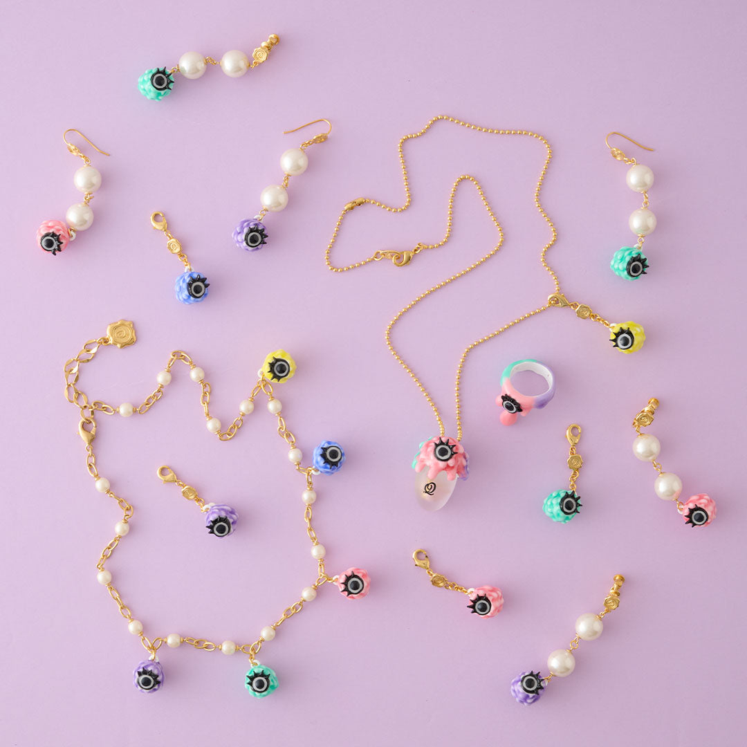 The melted sweets monsters have come together to start a fun-filled party. Emitting sweet scents, they gather every night to perform a mysterious dance that no one has ever seen before. The earring gently sways by your ears, available in three colors and sold individually, you can mix and match your favorite combinations. Take your favorite monster with you as you hit the Halloween streets!