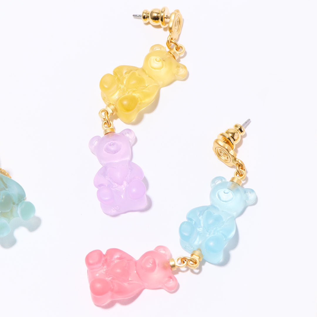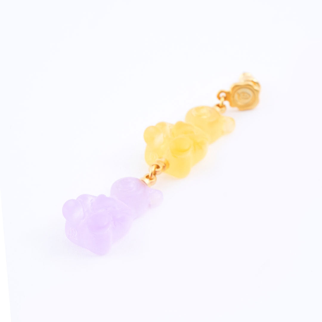 The earring featuring a sequence of soda and strawberry bears is adorable as they sway gently by the ears. The colorful bears add a playful touch to the ears.