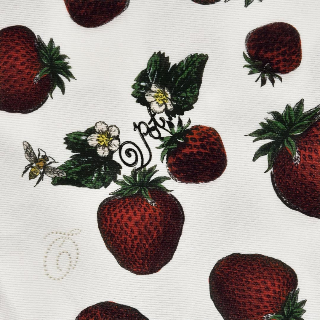 Q-pot. logo subtly hidden within the strawberry vines and Queen Bee flying around, a unique and vintage-style original textile.