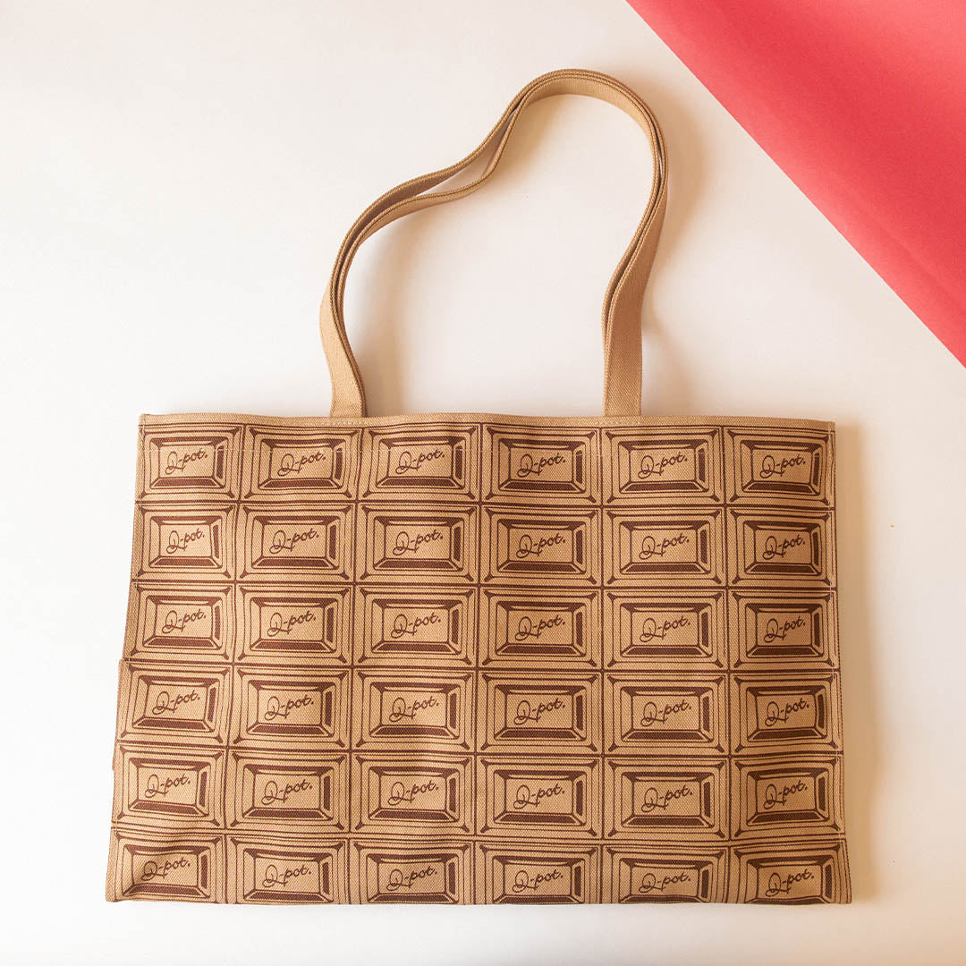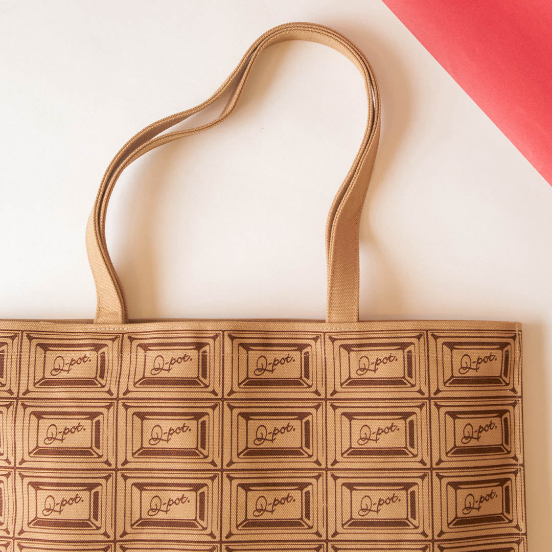 The large canvas tote bag is fully decorated with chocolate bar with the Q-pot. logo, and with great capacity and an inner pocket attached. It will be useful for days with large luggage and travel. Made of sturdy and thick canvas fabric, it can be used for a long time.