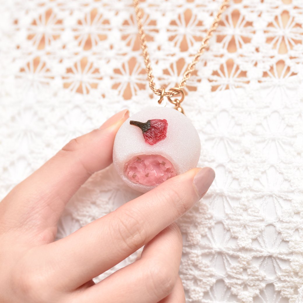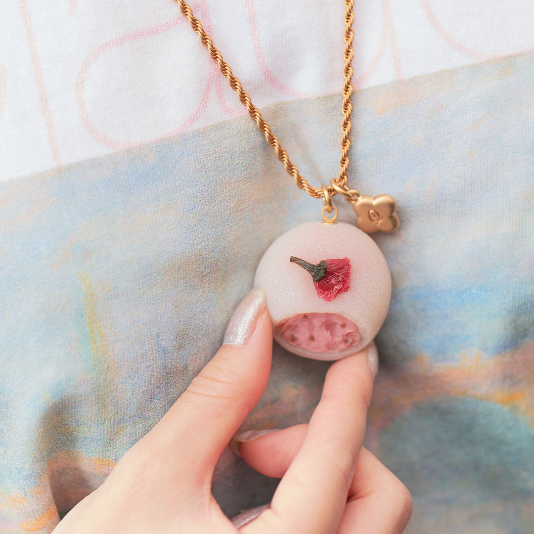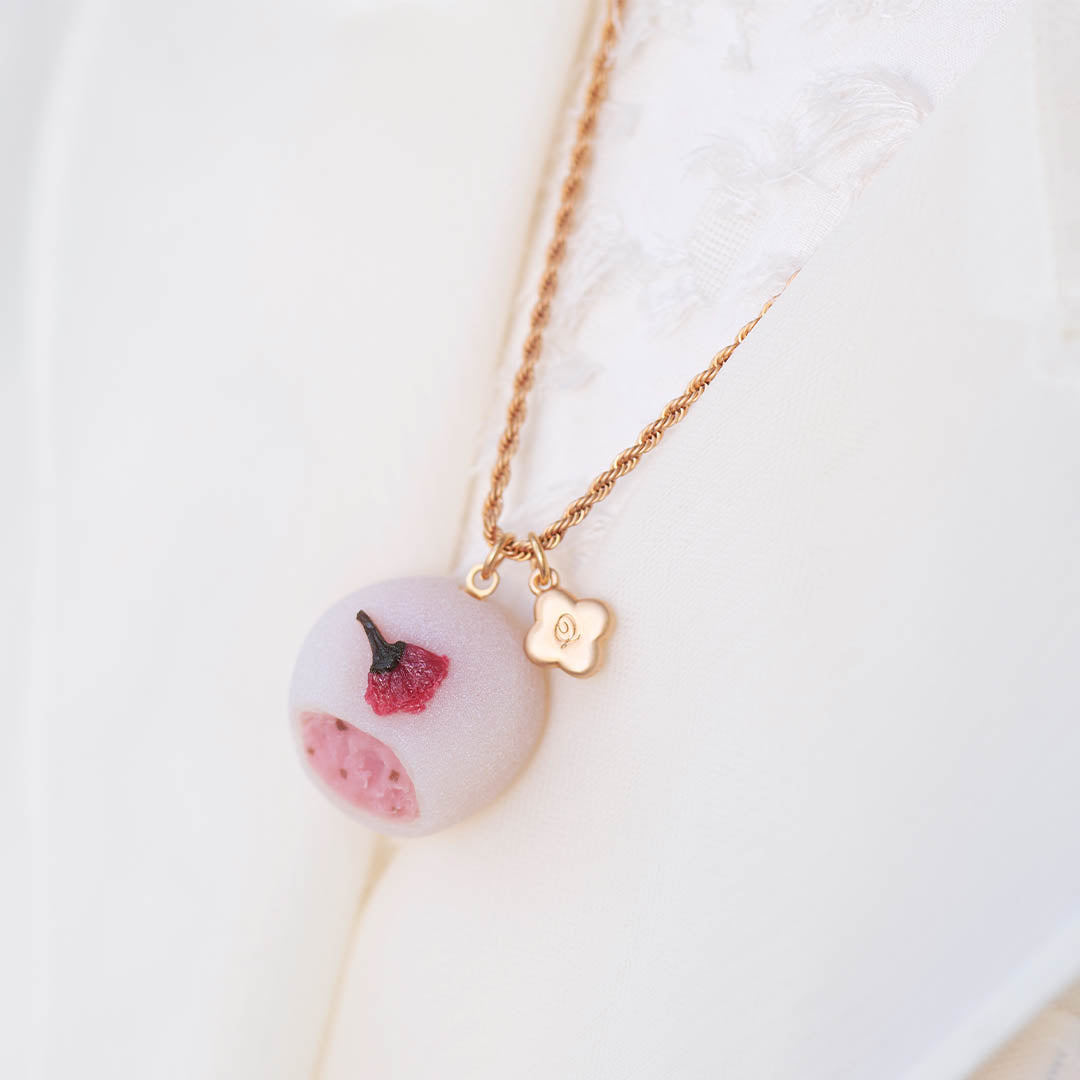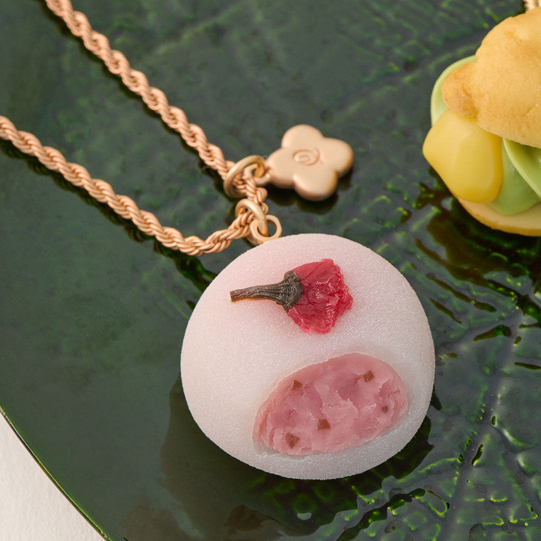 The salty leaf of sakura and the sweetness of white bean paste match in a harmony. Sakura bean paste and soft mochi around it, with a salt pickled cherry blossom on it. The detail of it is so charming that you can’t ignore. The sakura bean paste can be saw through the mochi, which makes it looks so real. Attached with a pink gold charm looks like Japanese family crest with it.