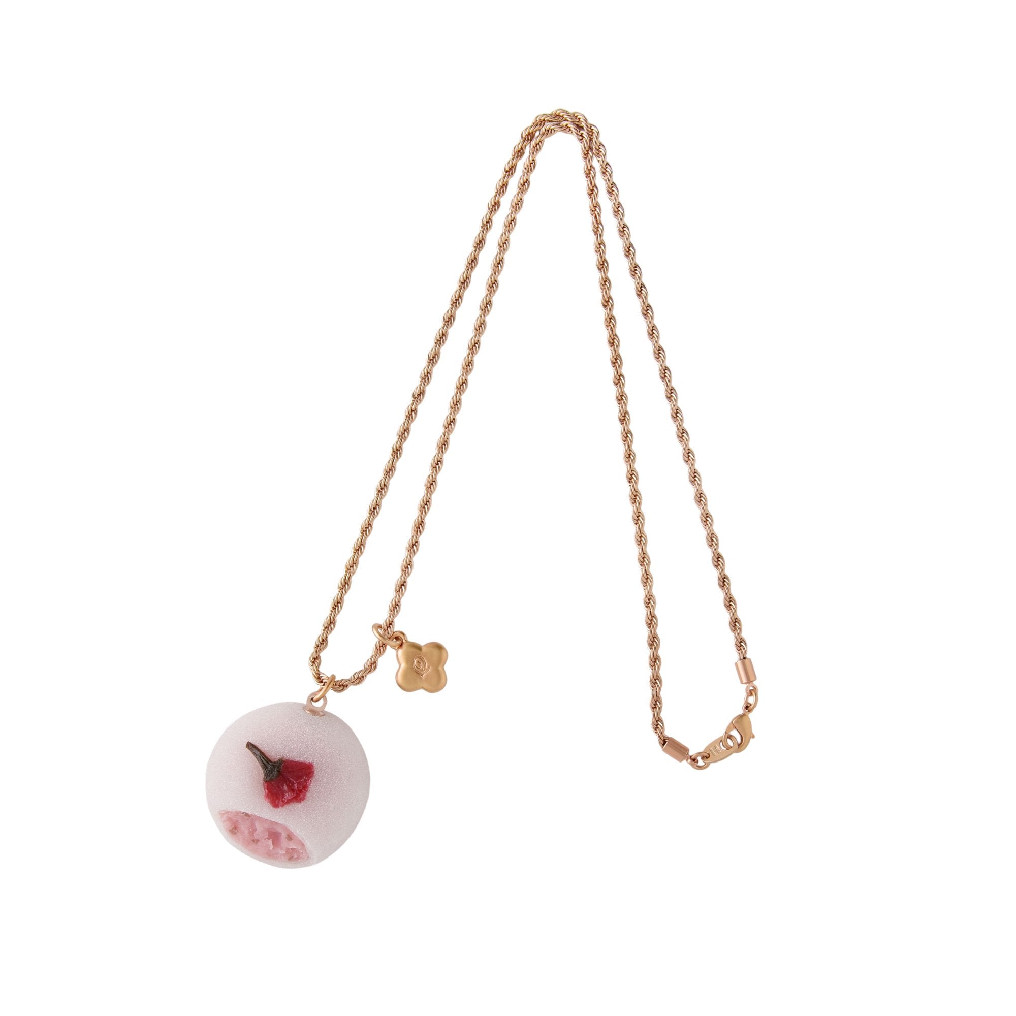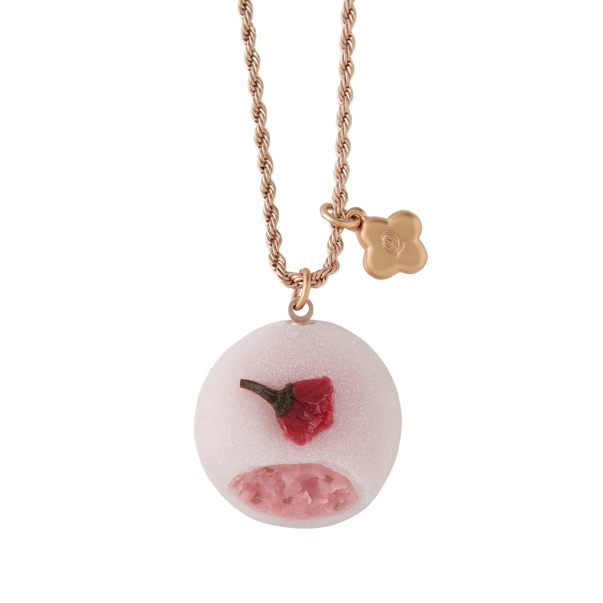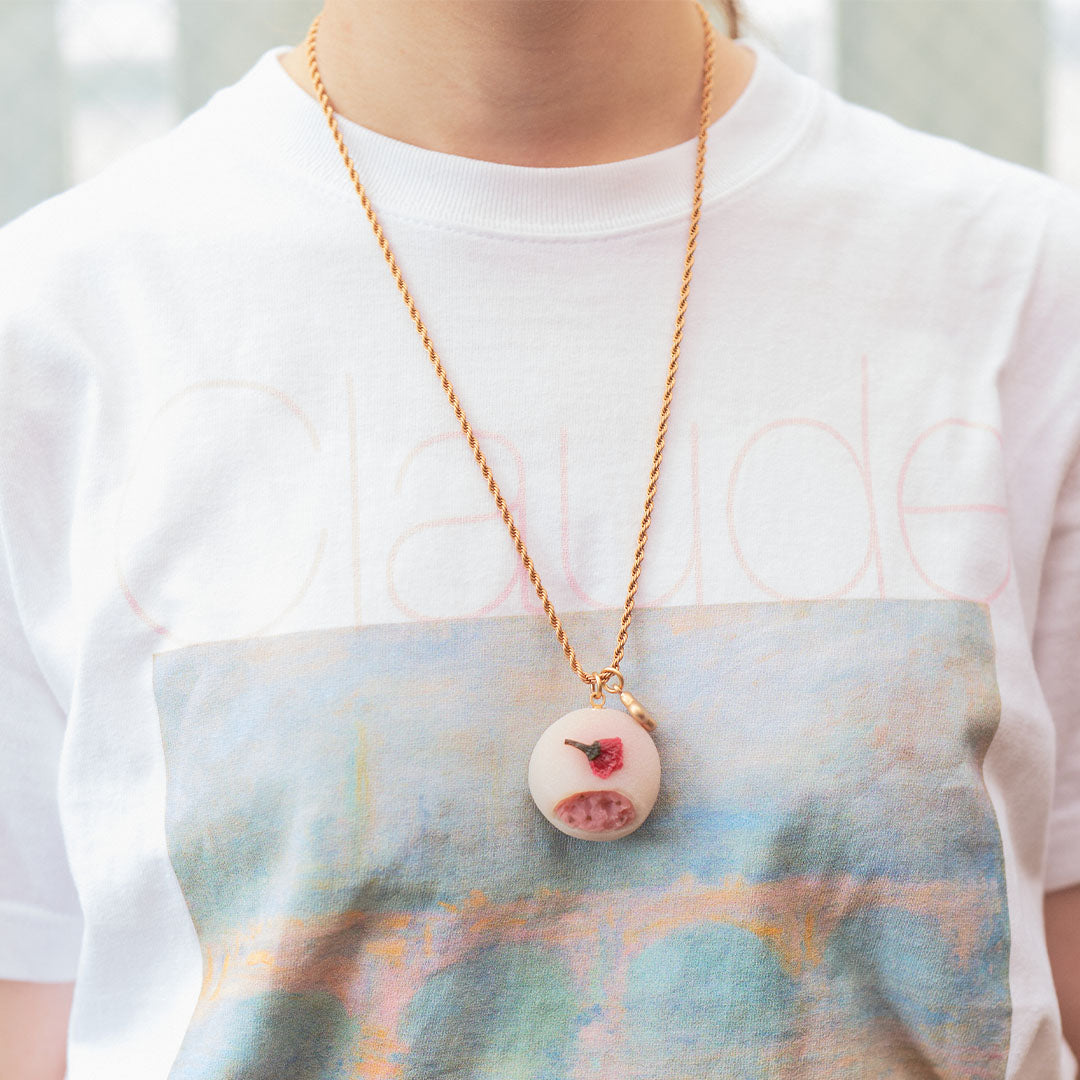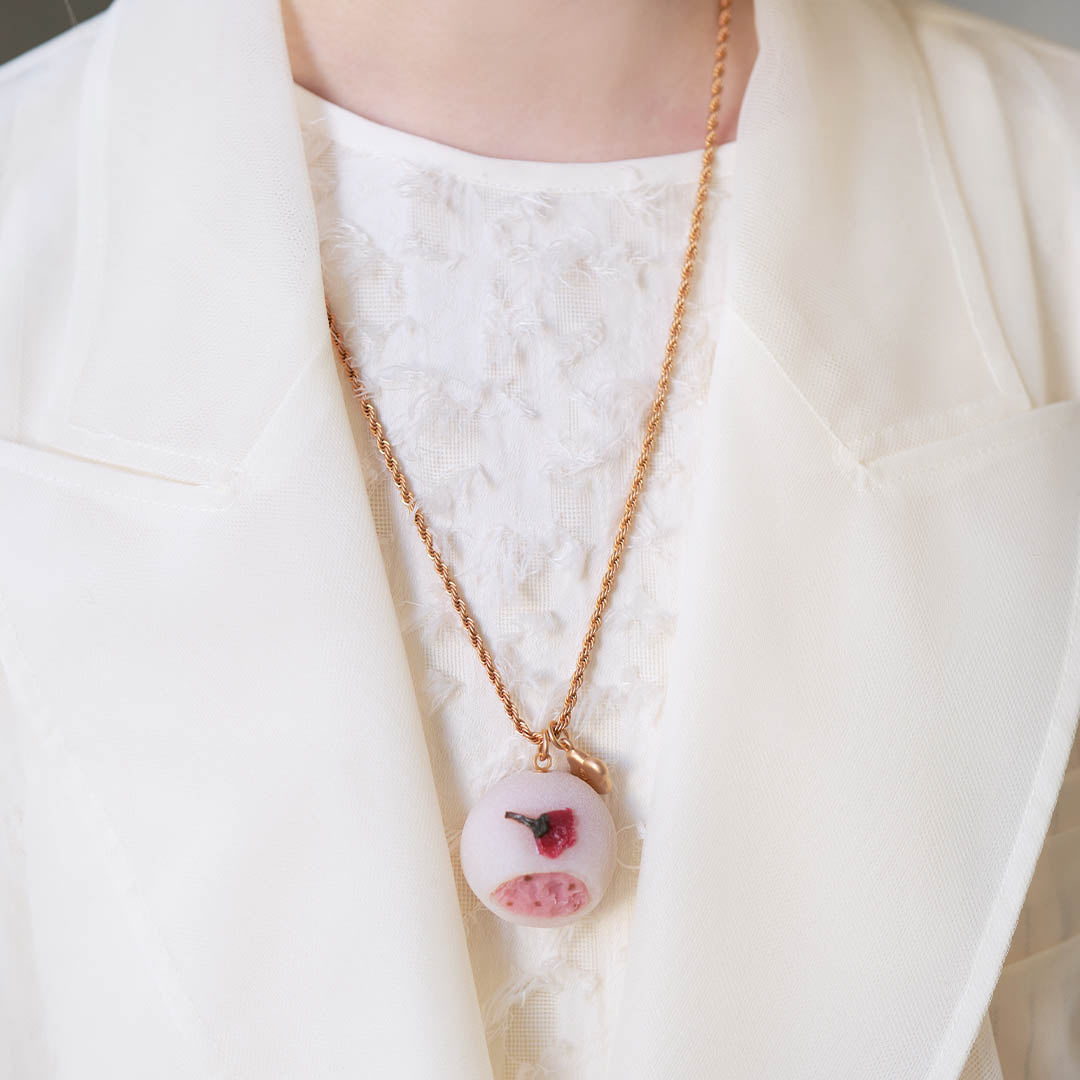 The salty leaf of sakura and the sweetness of white bean paste match in a harmony. Sakura bean paste and soft mochi around it, with a salt pickled cherry blossom on it. The detail of it is so charming that you can’t ignore. The sakura bean paste can be saw through the mochi, which makes it looks so real. Attached with a pink gold charm looks like Japanese family crest with it.