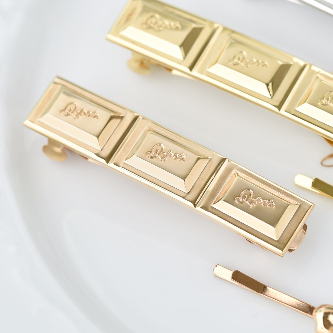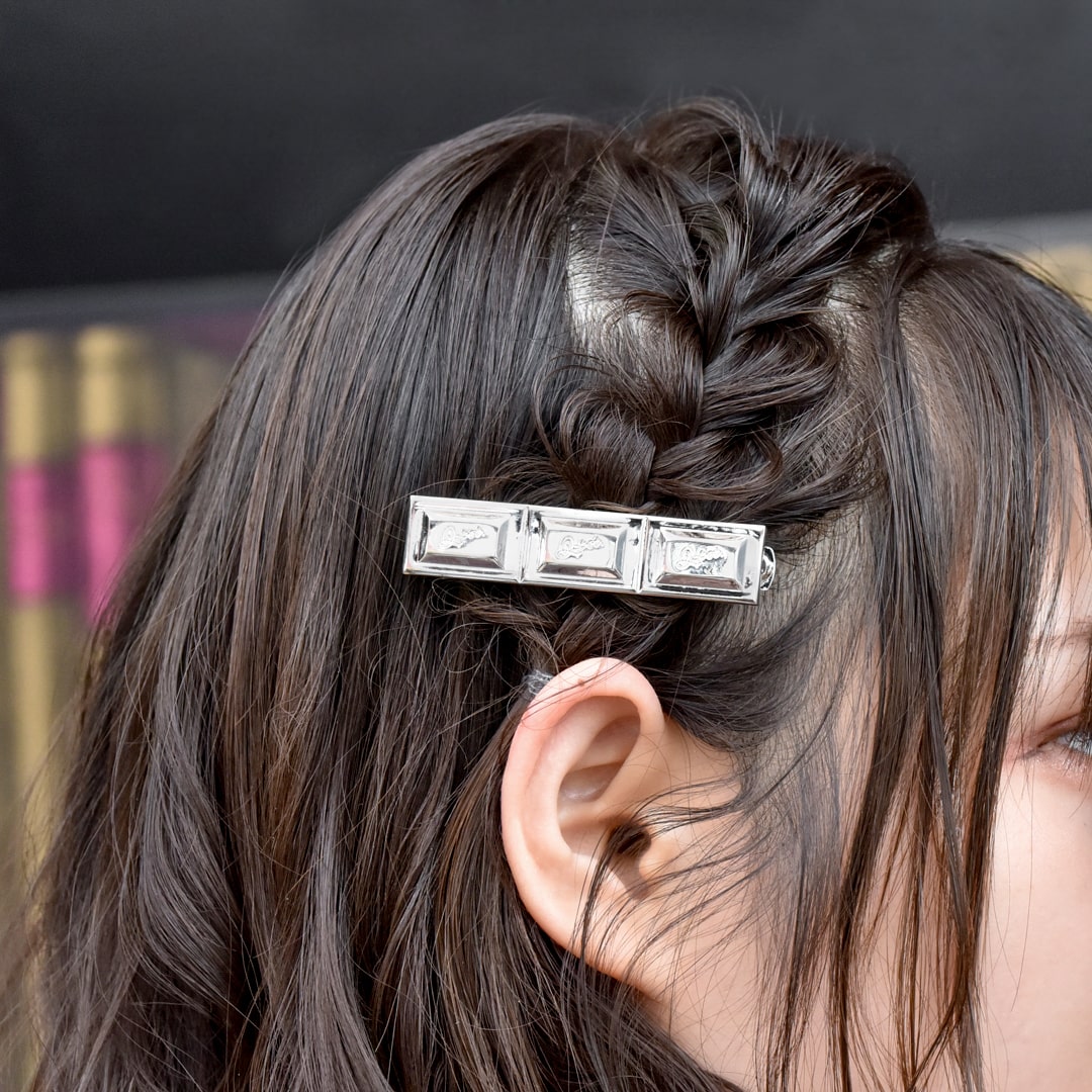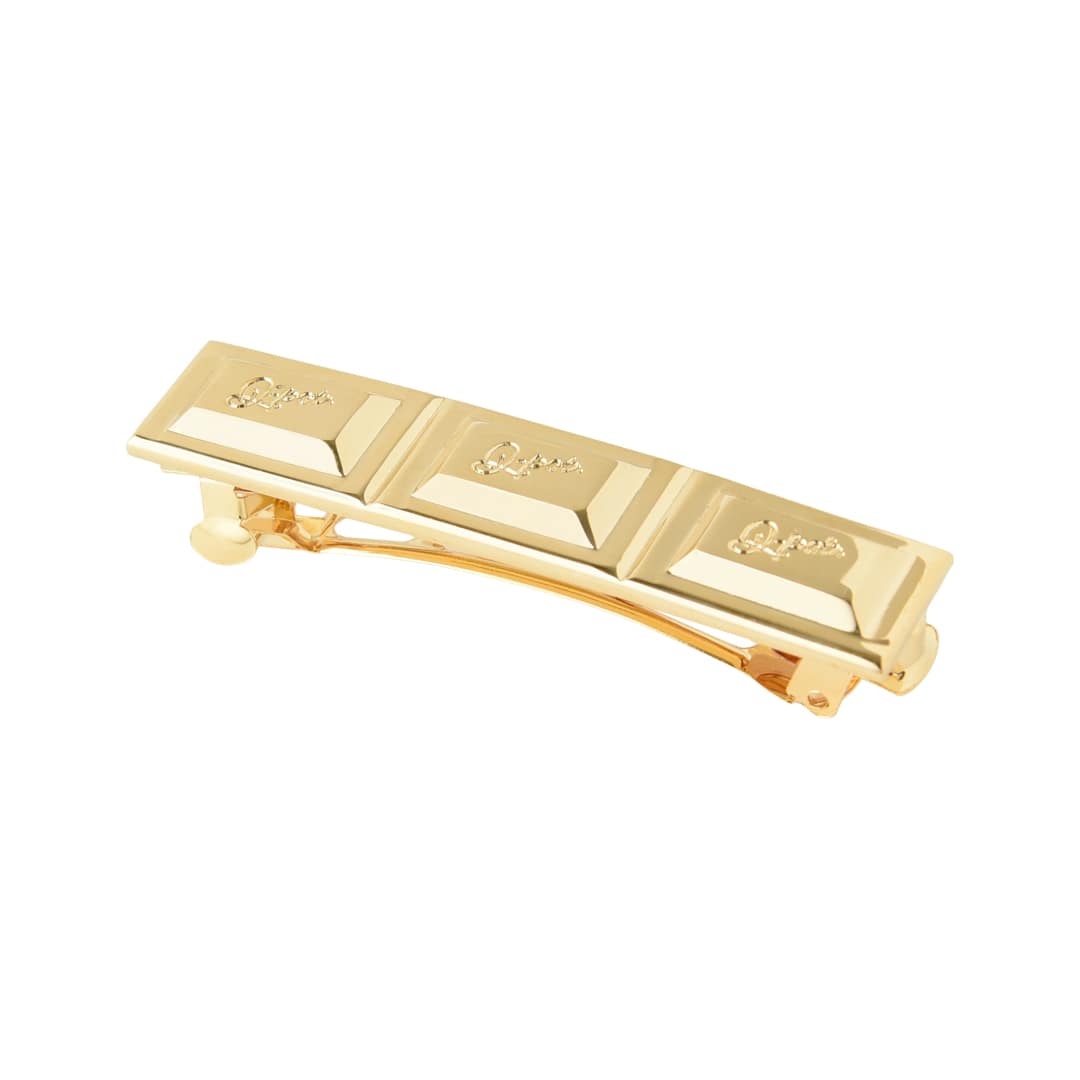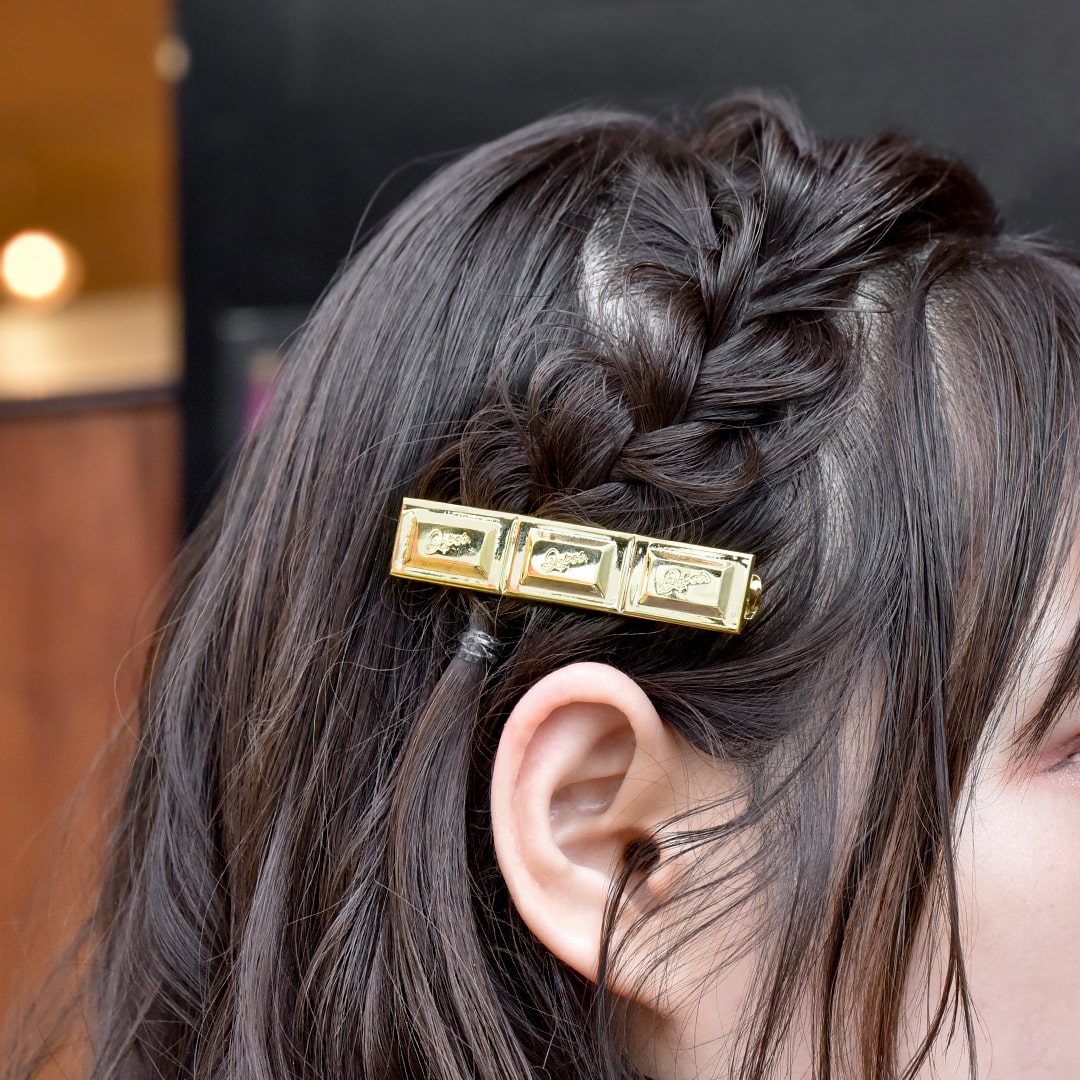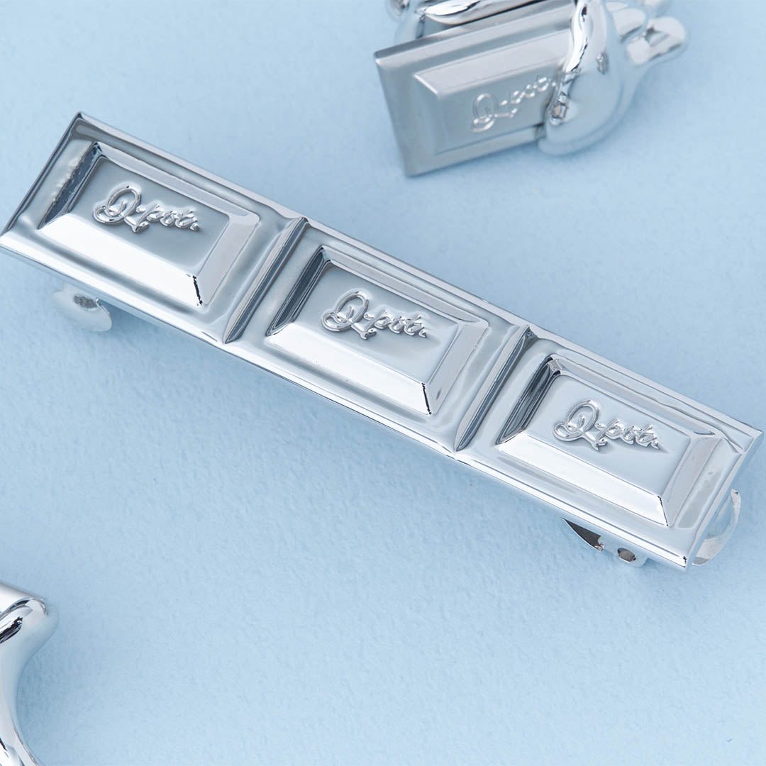 The barrette with a glossy texture featuring Q-pot. logo engraved just like a real one. Elevate your style by simply wearing it and add a touch of playfulness to your outfit.