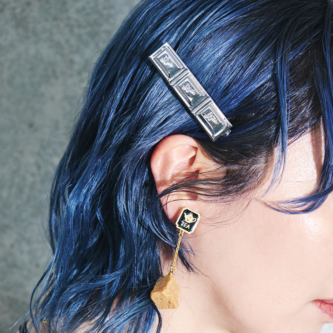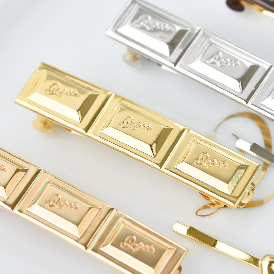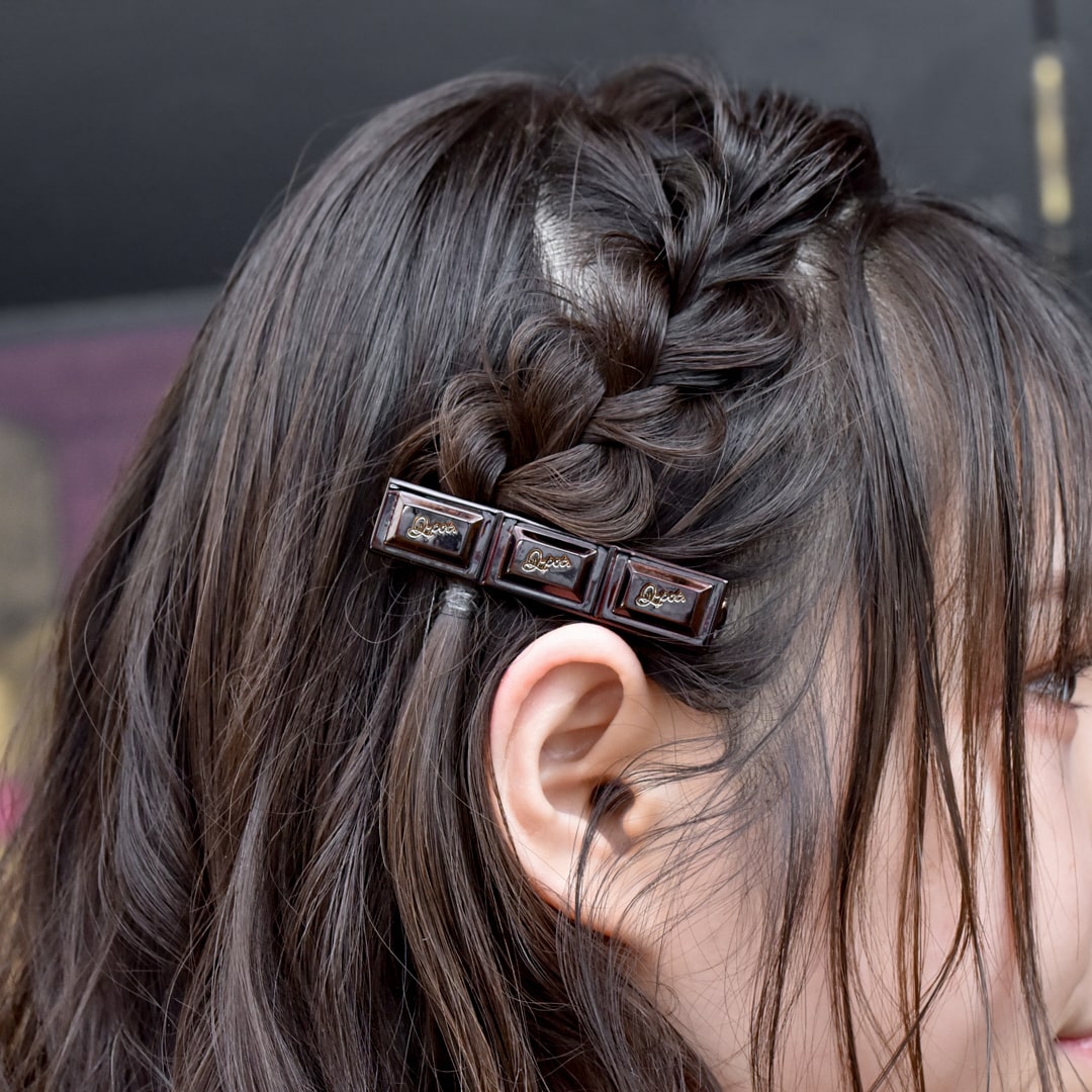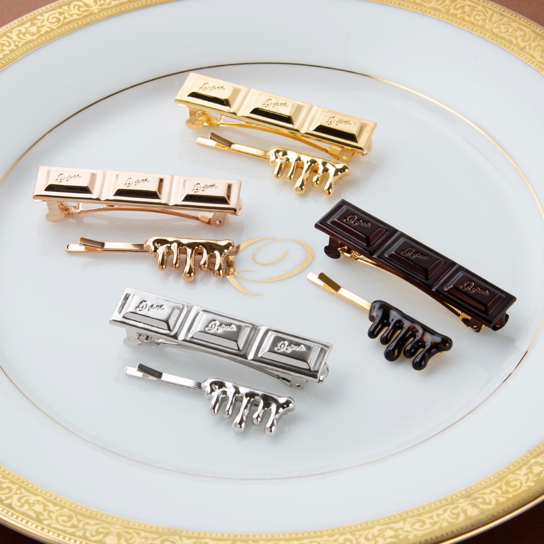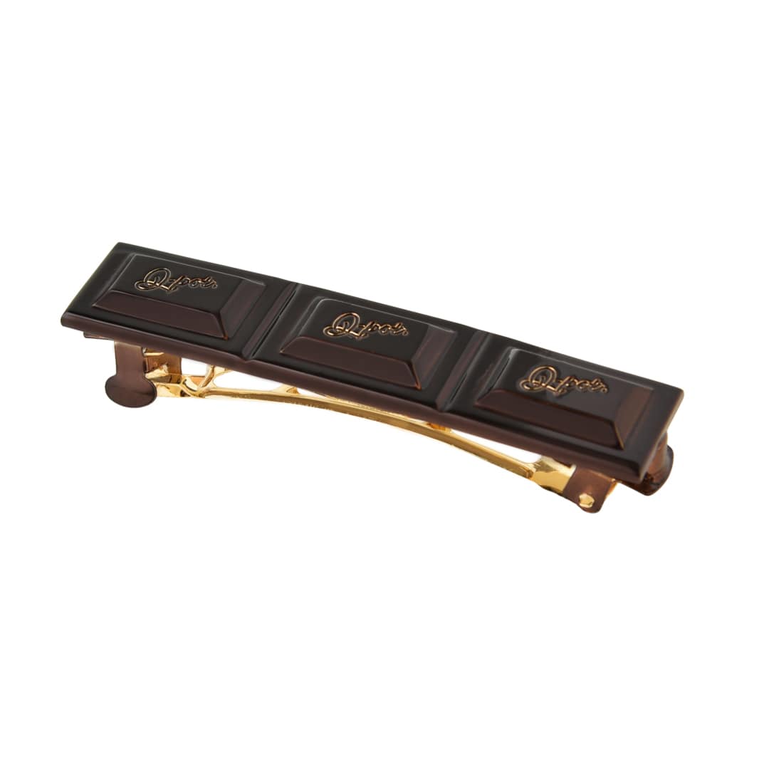 The barrette with a glossy texture featuring Q-pot. logo engraved just like a real one. Elevate your style by simply wearing it and add a touch of playfulness to your outfit.
