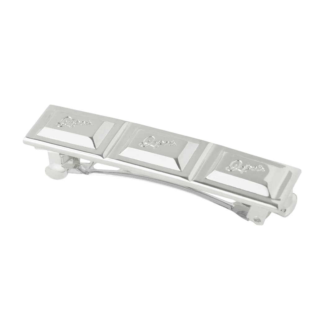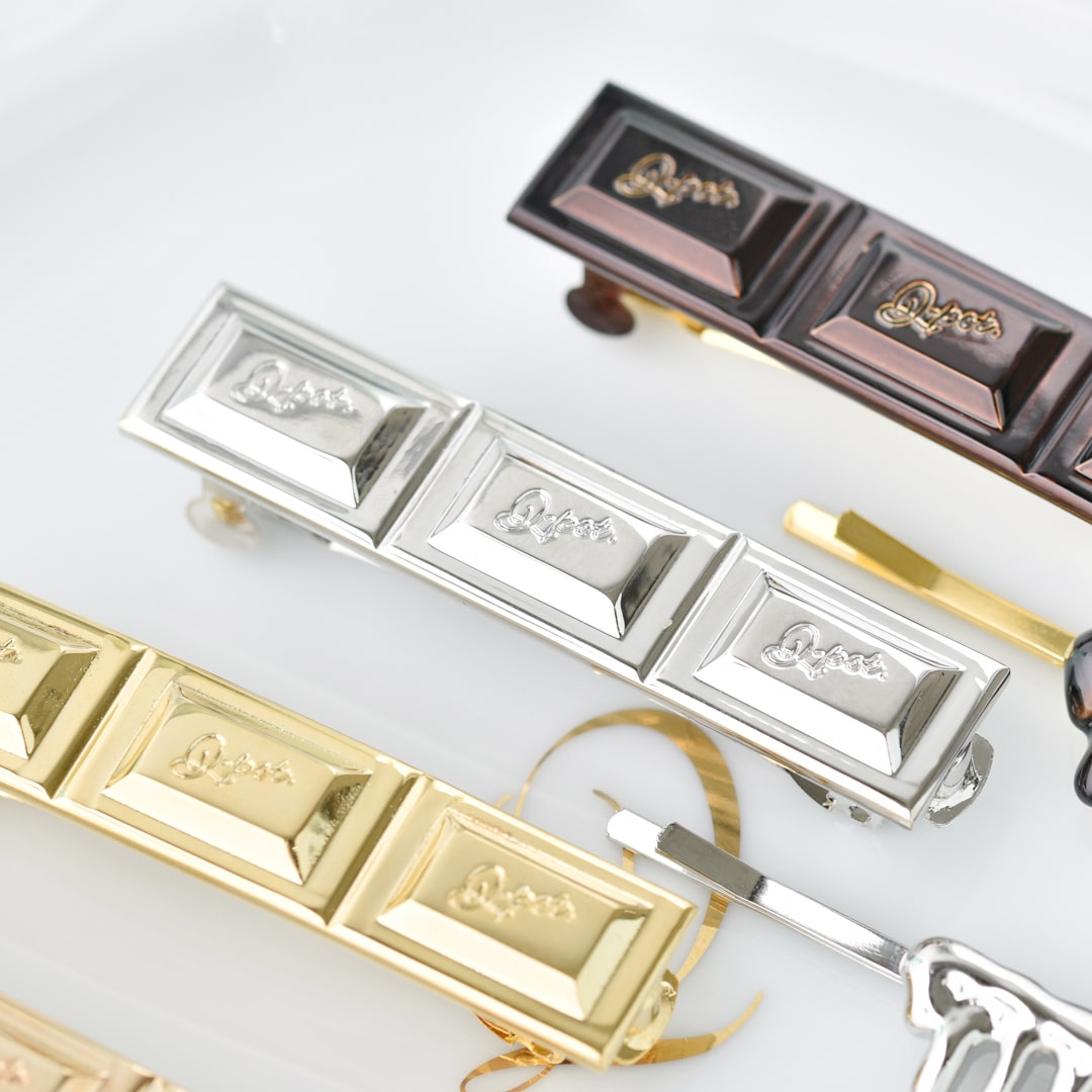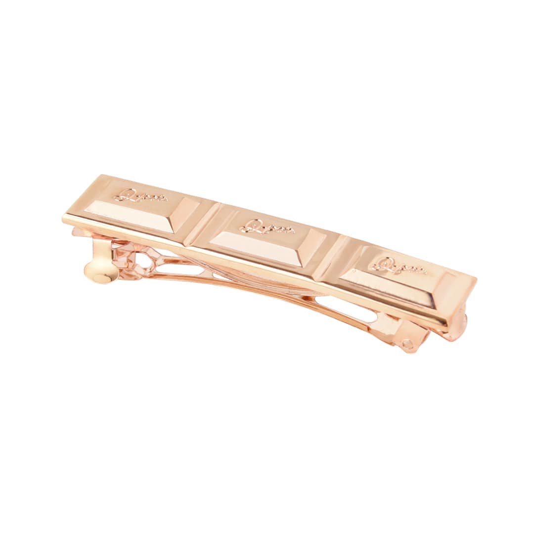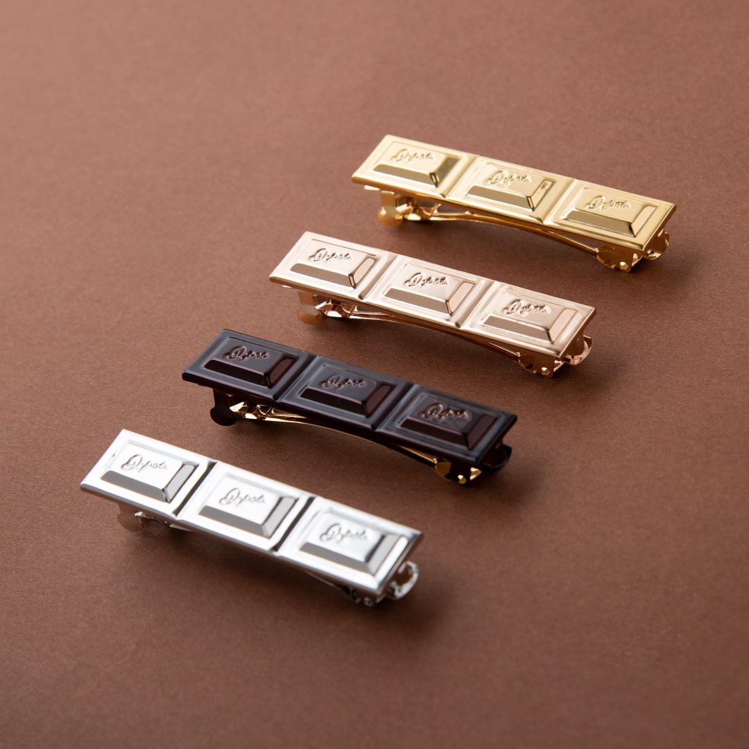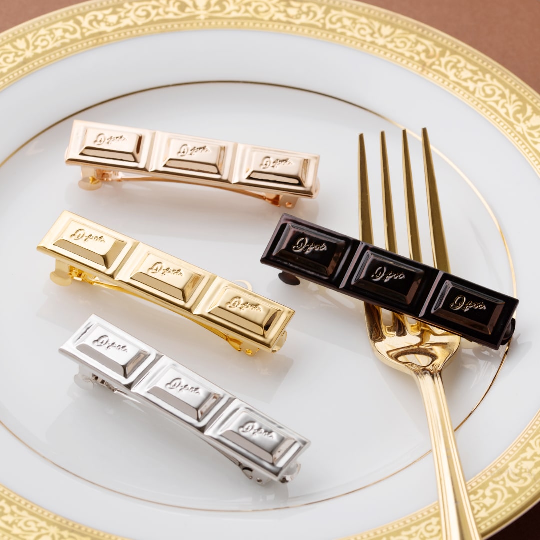 The barrette with a glossy texture featuring Q-pot. logo engraved just like a real one. Elevate your style by simply wearing it and add a touch of playfulness to your outfit.