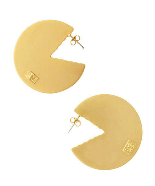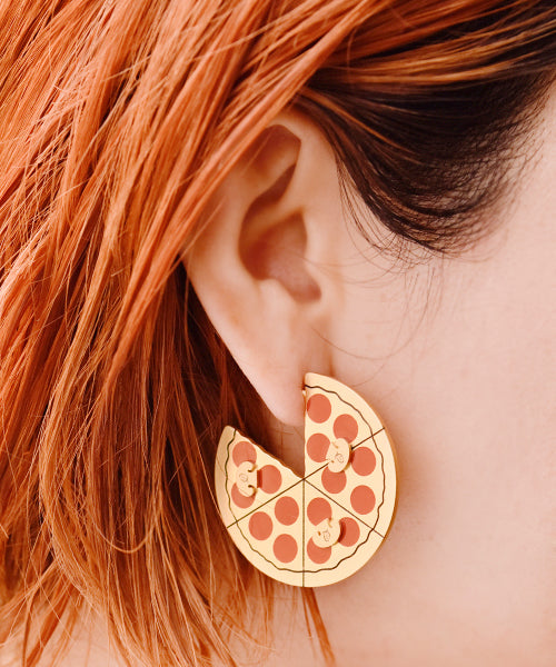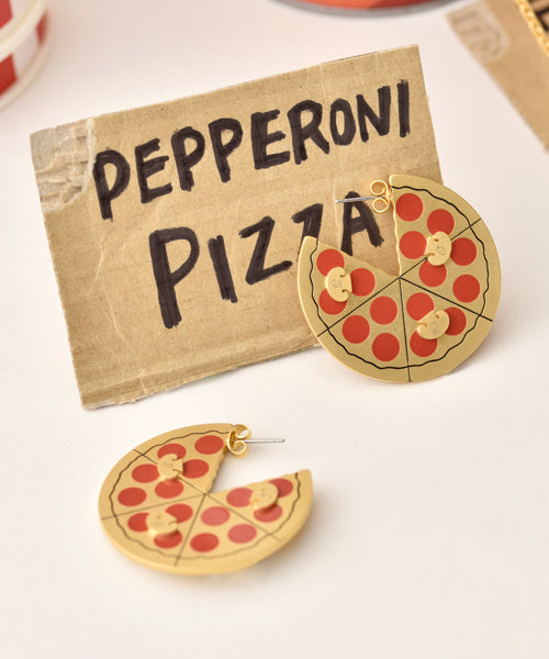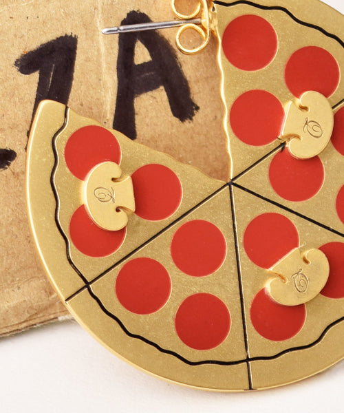 Powerful pepperoni pizza earrings that a piece of cut is already eaten by someone!? A funny design topped with salami and small mushrooms.