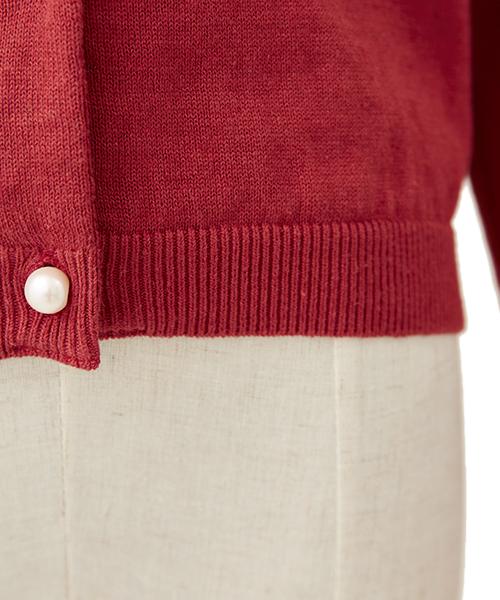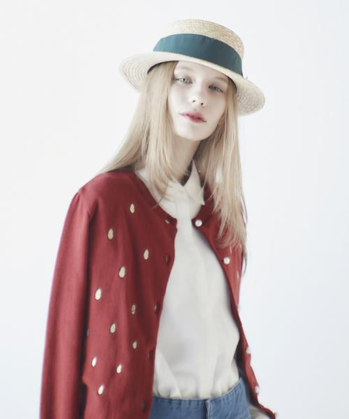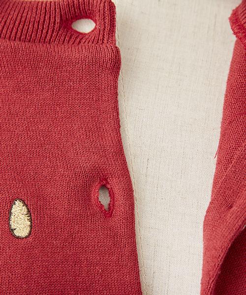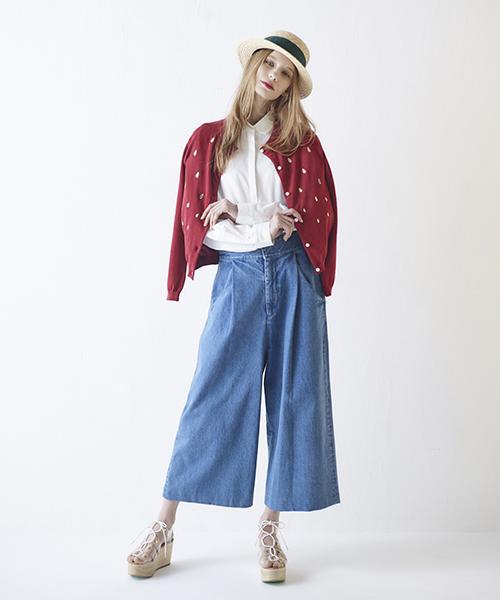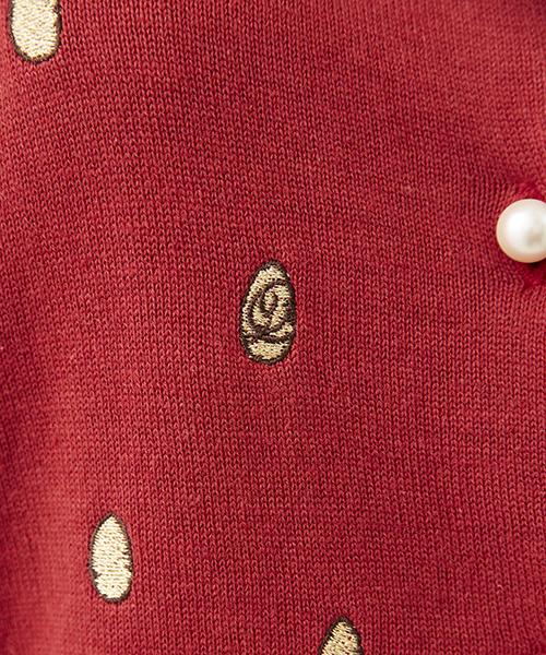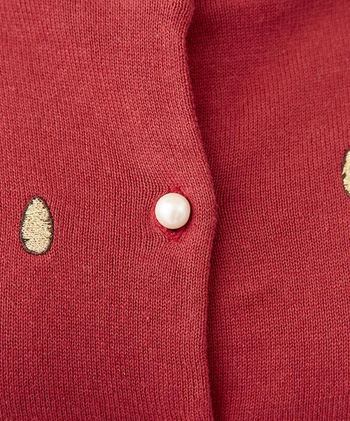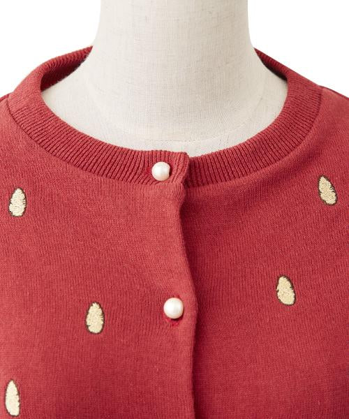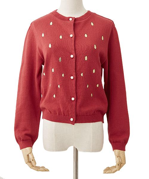 Gold embroidery elegantly expresses the seeds of strawberries. The cardigan is a Q-pot. style outfit that is simple yet playful.