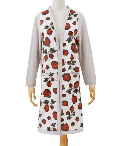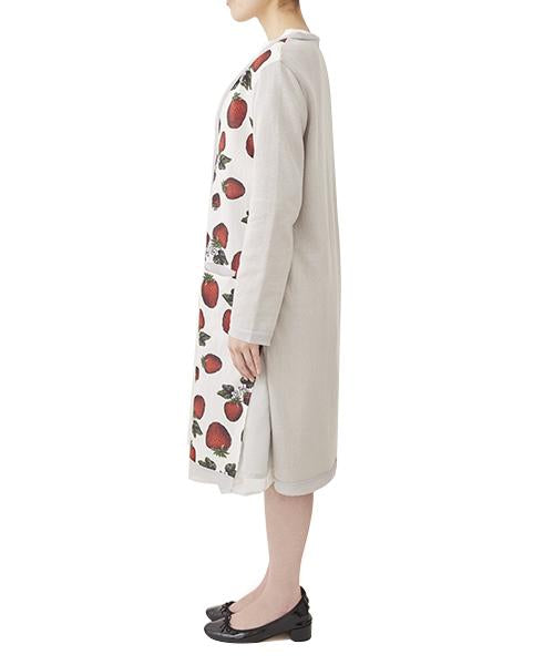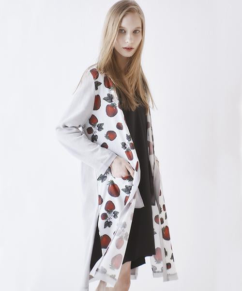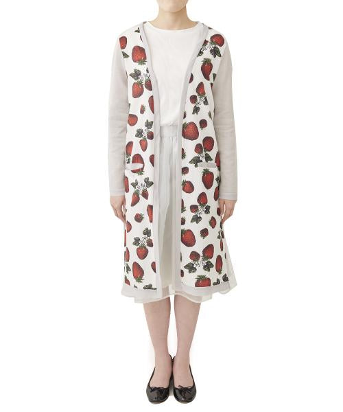 The long cardigan with a strawberry-patterned textile that is eye-catching yet with an relaxing mood. The front and cuffs are lined with soft chiffon, it is a special piece that gives you a sense of exhilaration every time you wear on. The linen-blend cardigan that feels comfortable against the skin. The long length makes it fashionable to cover your body shape.