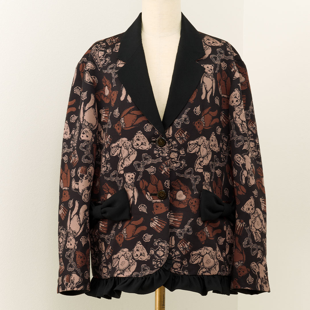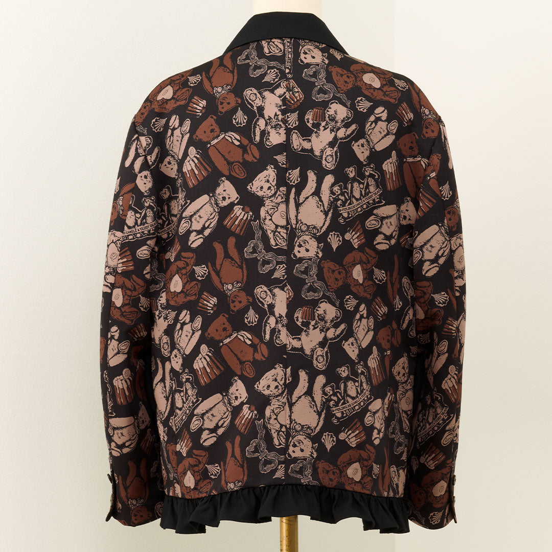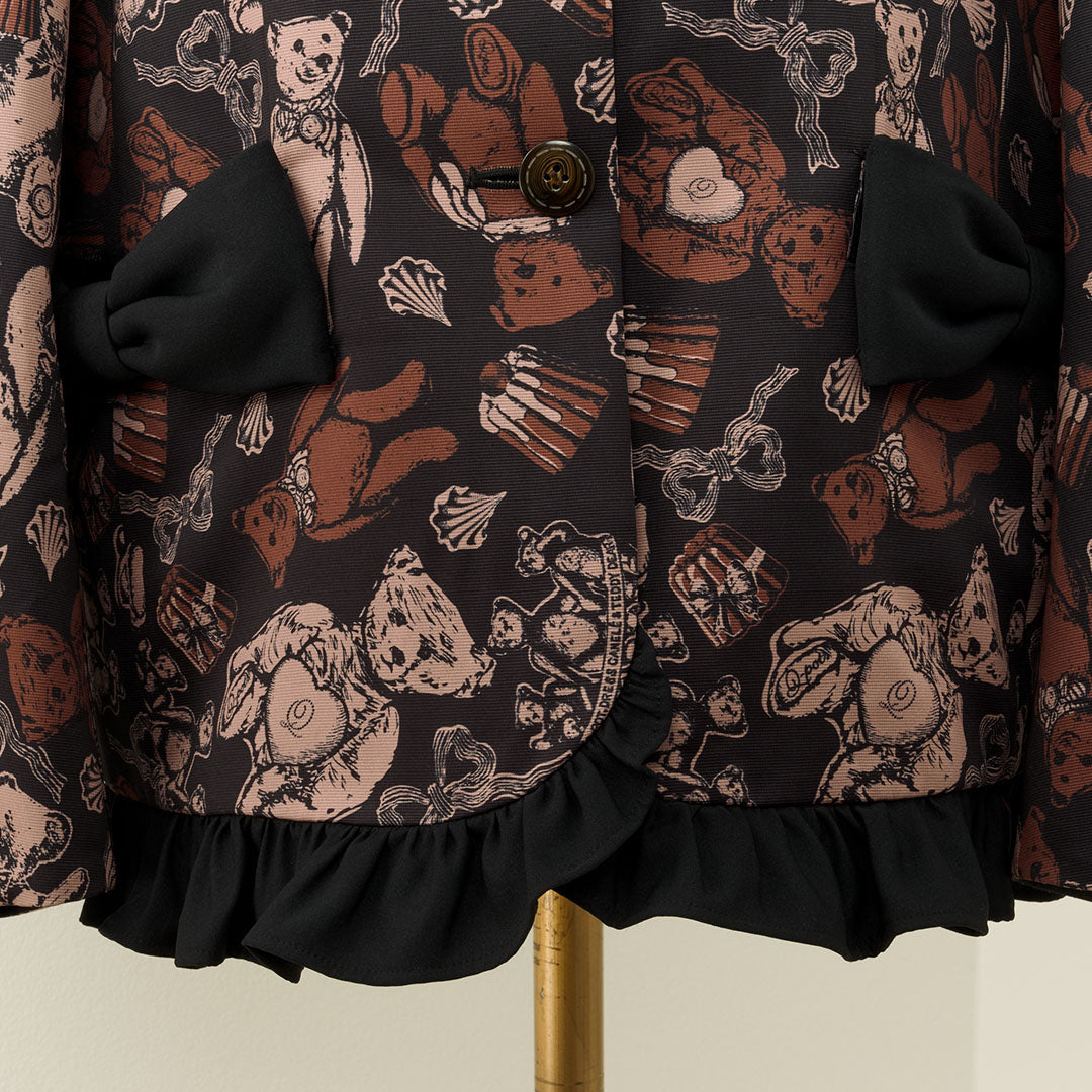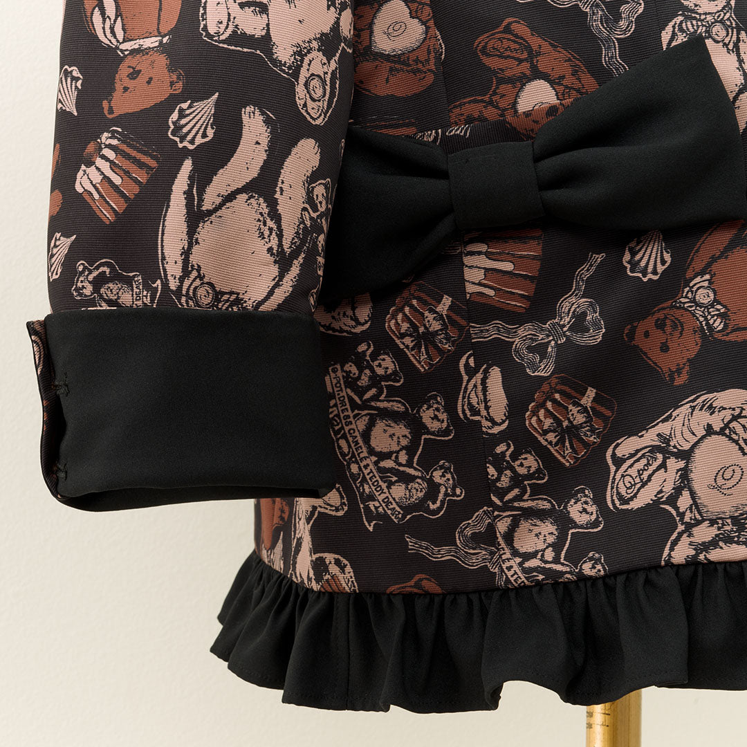 This elegant jacket, with its eye-catching ribbon, features a classic and formal silhouette infused with romantic elements like frills at the hem. The antique buttons, inspired by teddy bears, have a charming stitch-like design that adds a playful touch. The cuffs can be worn as is or folded back.