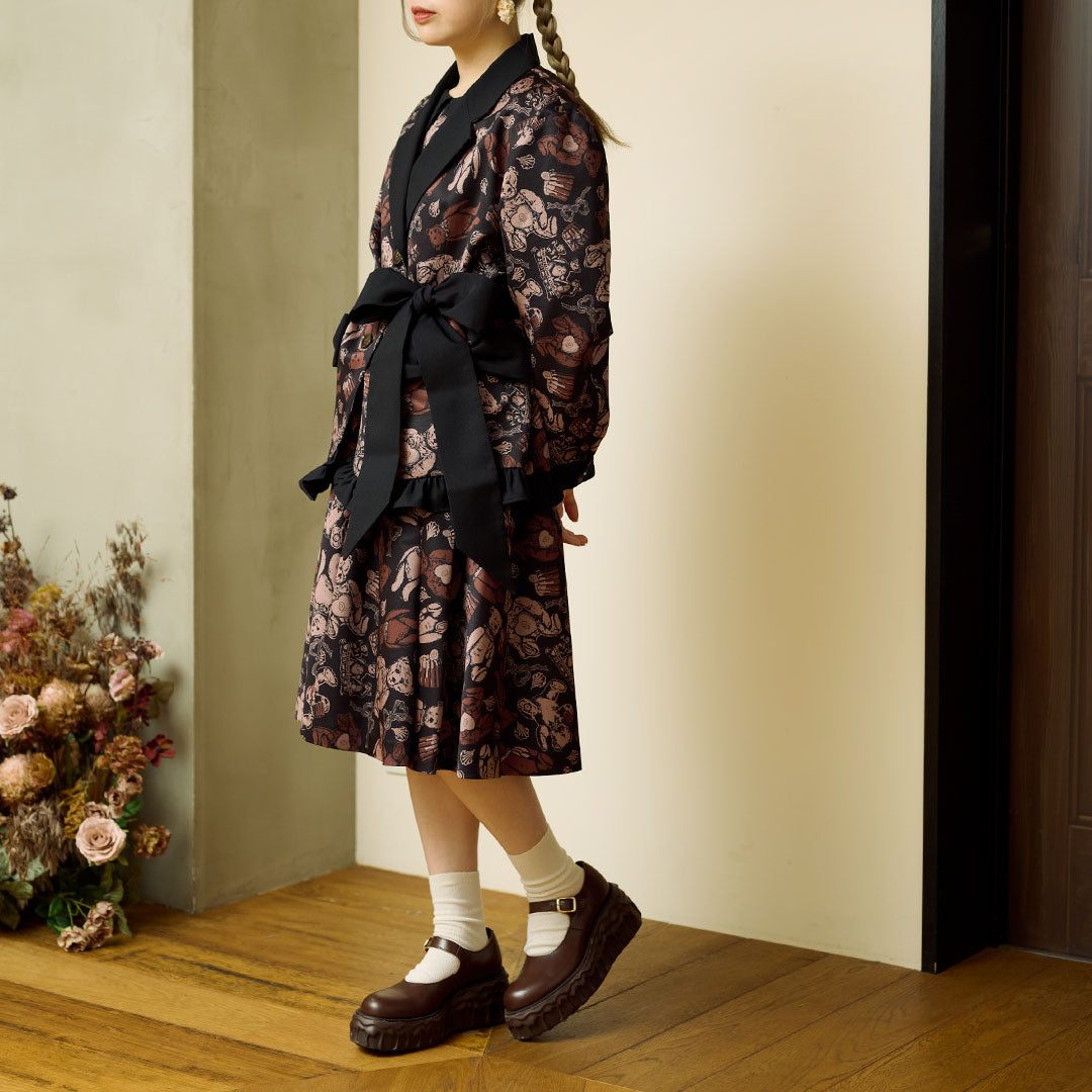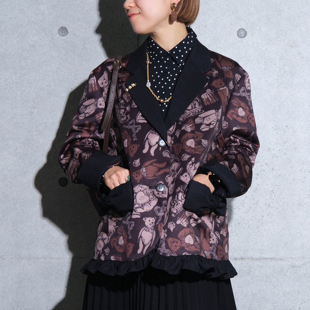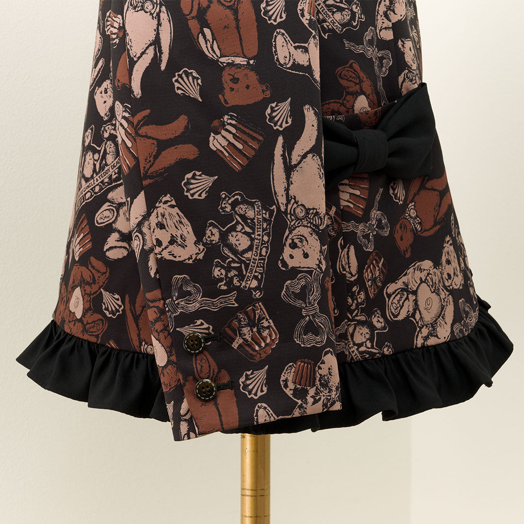 This elegant jacket, with its eye-catching ribbon, features a classic and formal silhouette infused with romantic elements like frills at the hem. The antique buttons, inspired by teddy bears, have a charming stitch-like design that adds a playful touch. The cuffs can be worn as is or folded back.