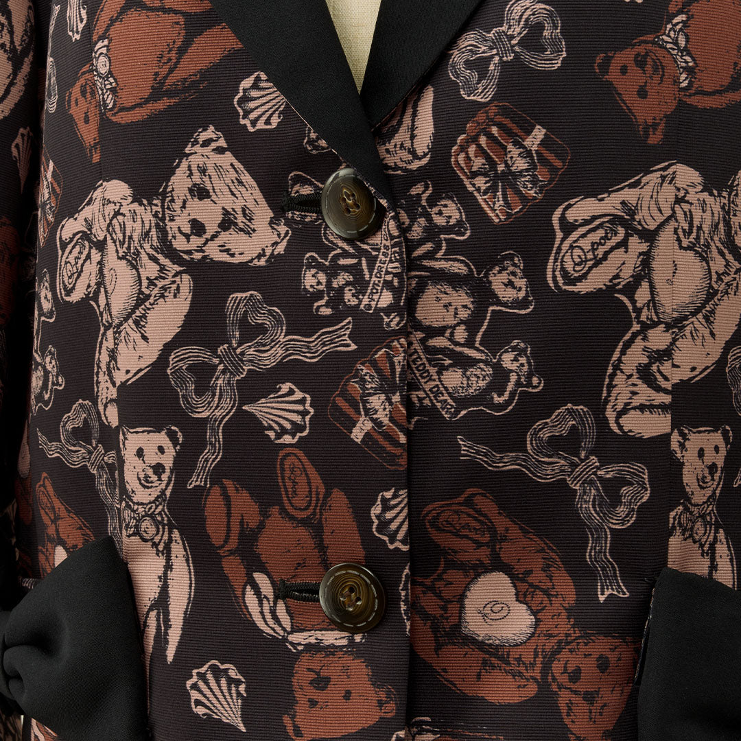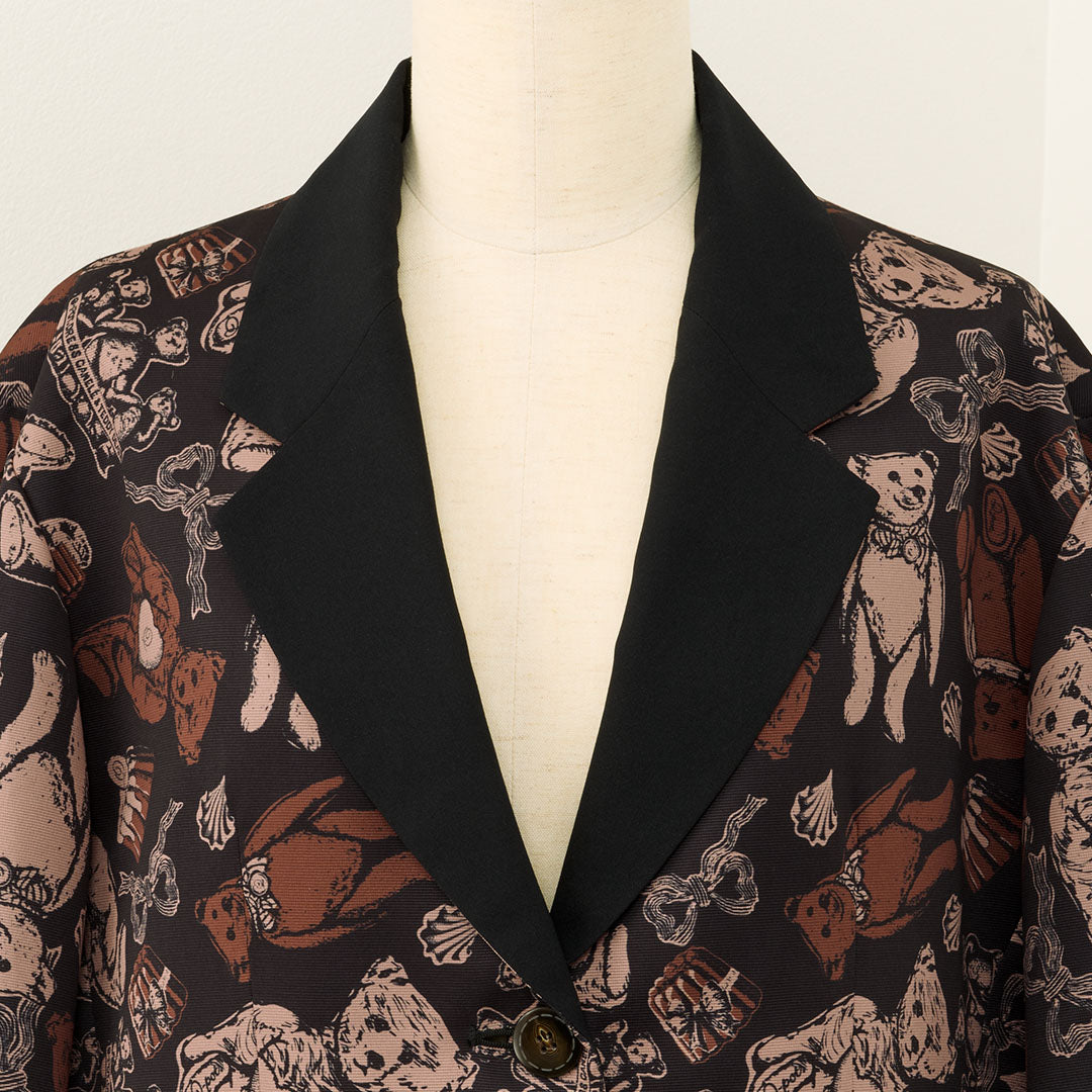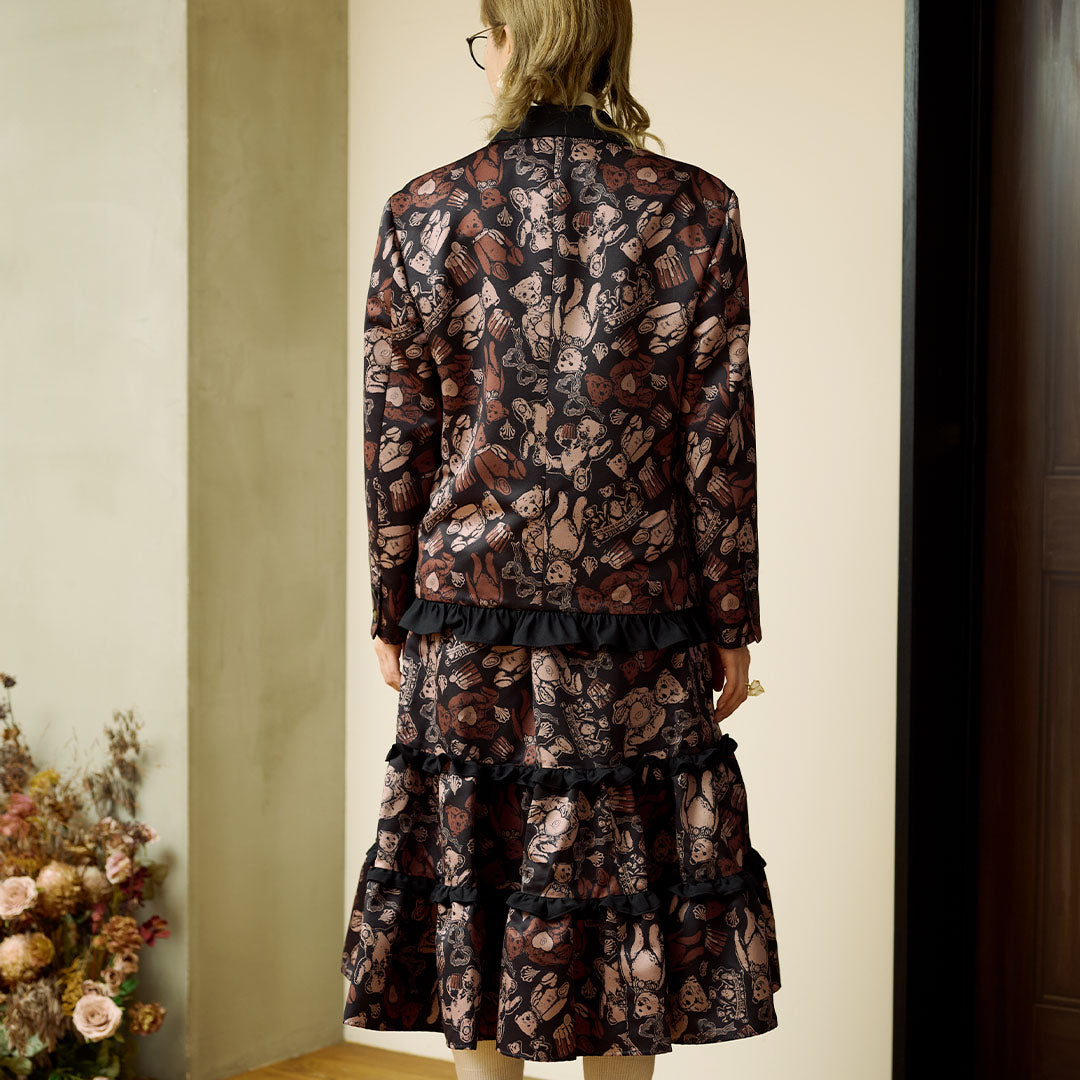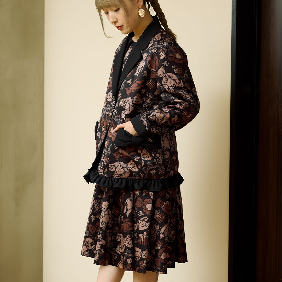 This elegant jacket, with its eye-catching ribbon, features a classic and formal silhouette infused with romantic elements like frills at the hem. The antique buttons, inspired by teddy bears, have a charming stitch-like design that adds a playful touch. The cuffs can be worn as is or folded back.