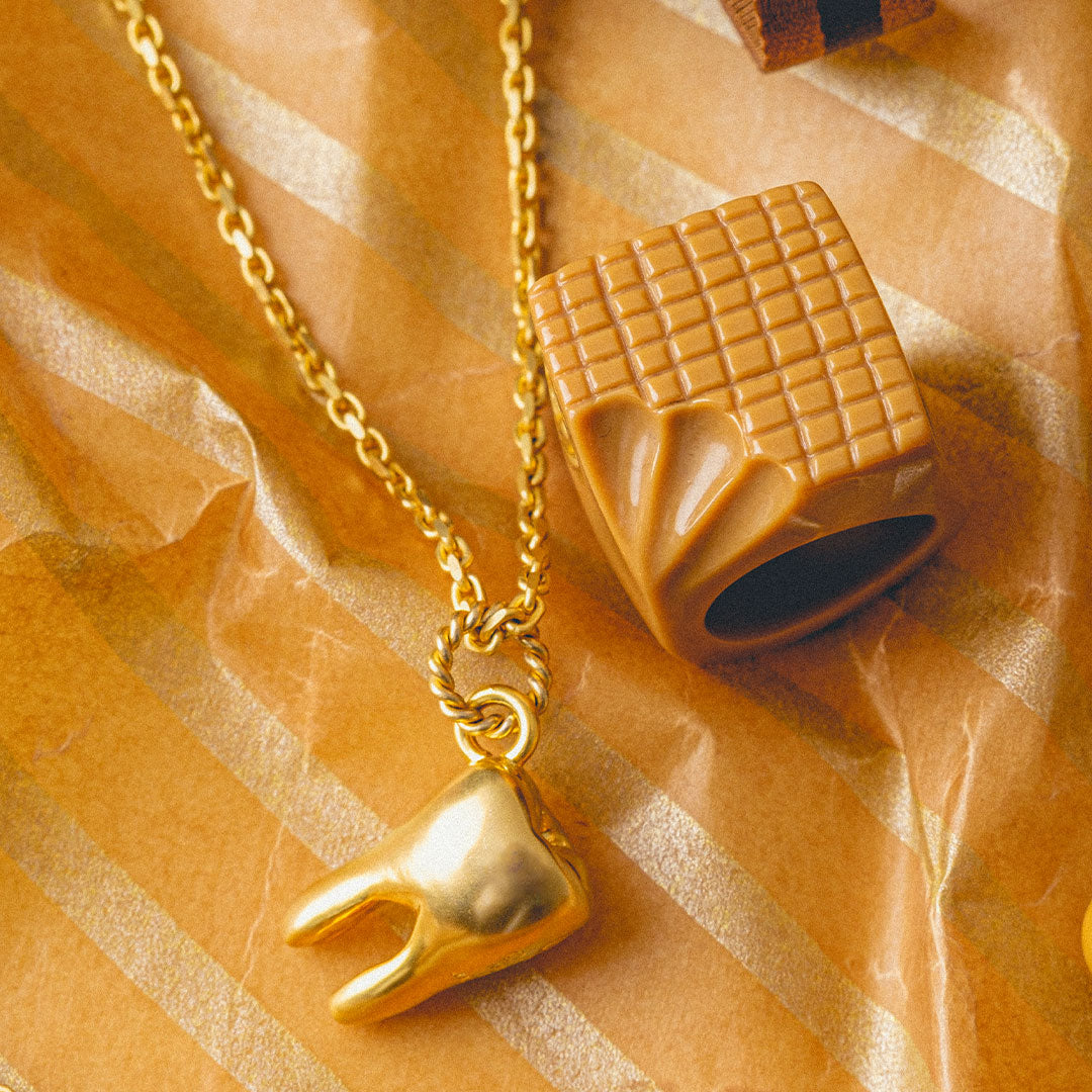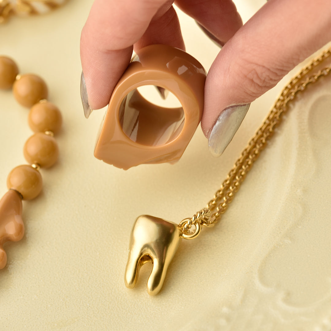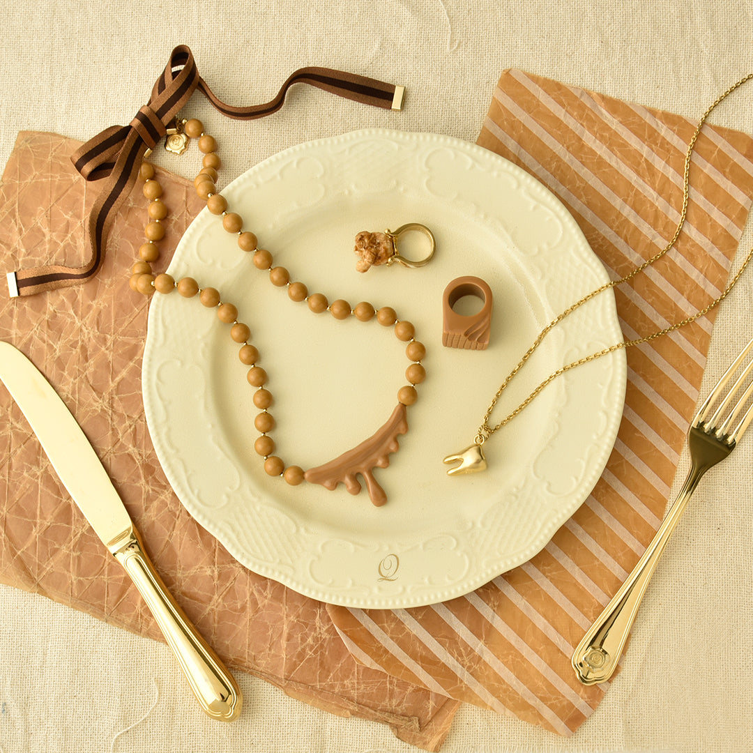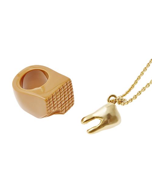 Enjoy a perfect harmony of a golden tooth and bitter sweet caramel! With a magnet inside, when you bring the caramel ring and tooth necklace close together, they actually stick together! Jewelries with moderately sweet caramel motif, it's fun to wear them in a set or share with someone♡