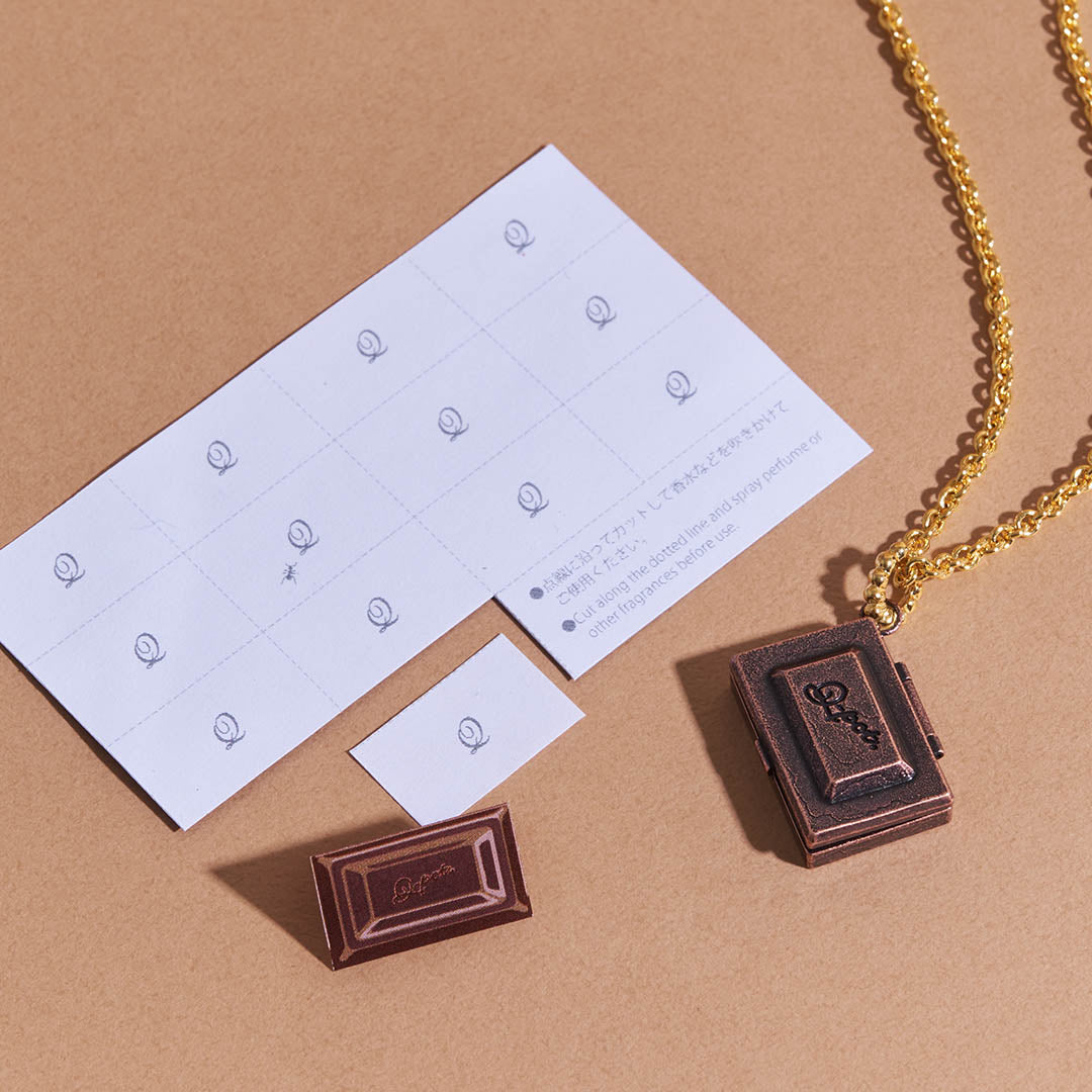 The locket-style chocolate charm can be opened and allows you to insert a small paper inside. By cutting a piece from the included chocolate-shaped card and applying solid perfume or eau de toilette, you can enjoy wearing your favorite scent along with the accessory.