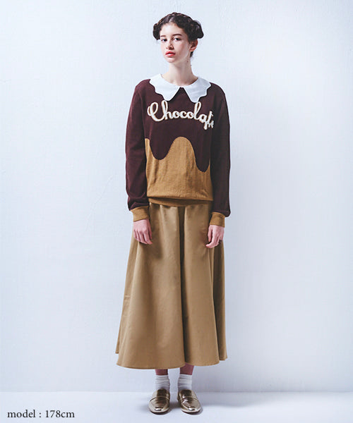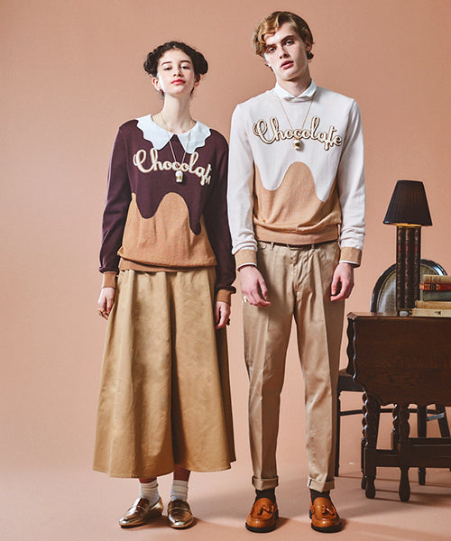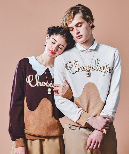 Knit is must item for autumn season, here is a playful one for you! This is designed of 2 melty chocolate flavor chocolate and milk. Which one do you choose? Embroidery of “Chocolate” is chenille, please enjoy the quality.