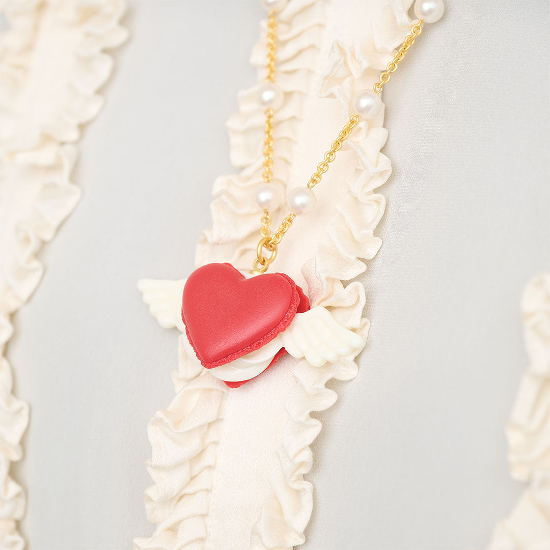 This sweet and charming macaron features a plump, heart-shaped shell, filled generously with fluffy whipped cream and topped with pure white feathers made of sugar. The chain is decorated with pearls like the ornaments.