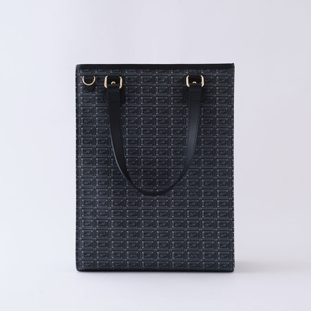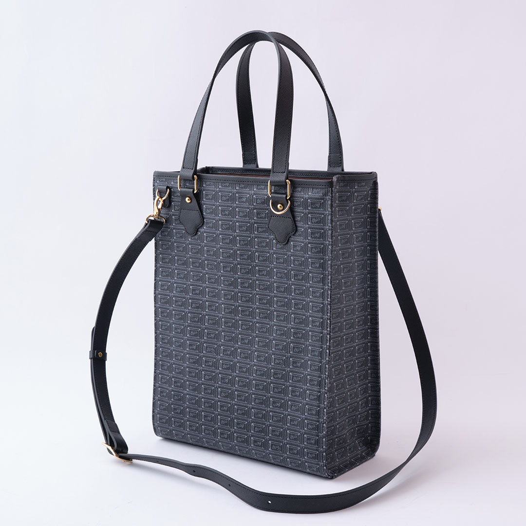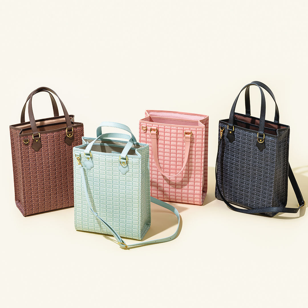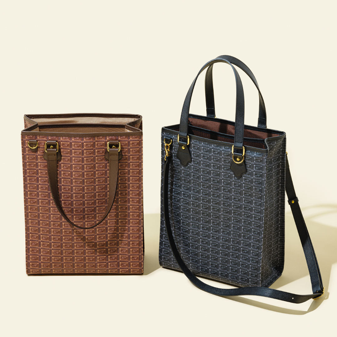 This square-shaped tote bag takes inspiration from a bar of chocolate, blending playful design with practical craftsmanship. Made in Japan from PVC-coated canvas and genuine leather, it features a detachable strap that lets you wear it your way — handheld, over the shoulder, or crossbody.