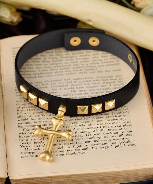 Bone Cross Leather Choker (Matt Gold)【Japan Jewelry】