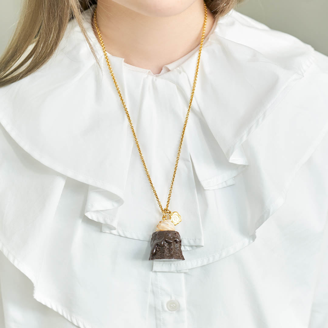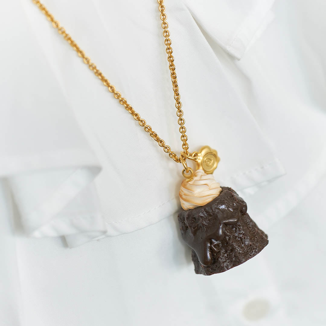 The traditional French pastry, Canelé, has been transformed into a classic, elegant accessory. The bittersweet chocolate canelé is generously drizzled with rich, melted chocolate sauce and topped with a finishing touch of perfectly toasted meringue.