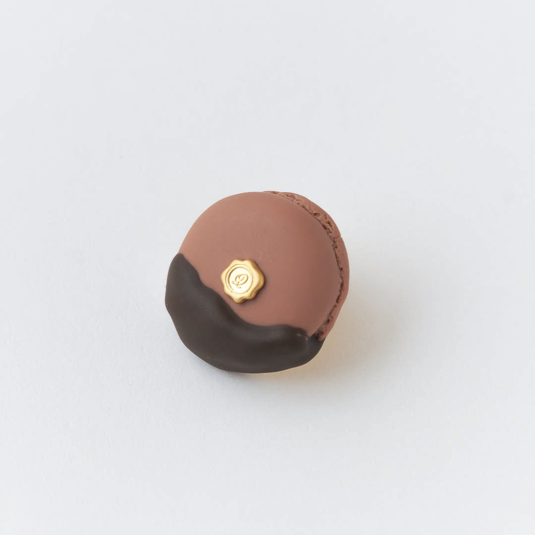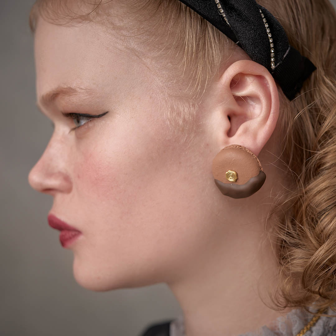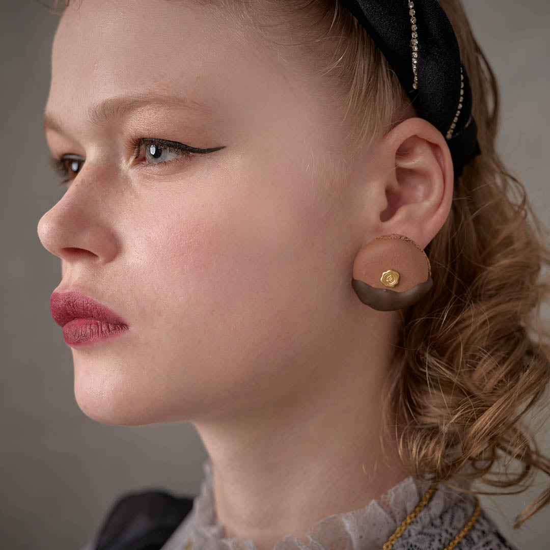 Macaron, one of the traditional French confection has been transformed into an elegant accessory. This earring features a crisp, well-baked macaron shell dipped in luscious, melted chocolate. A luxurious gold seal adds a sophisticated touch. The textured surface of the macaron shell and the smooth, flowing chocolate are crafted to look deliciously realistic.