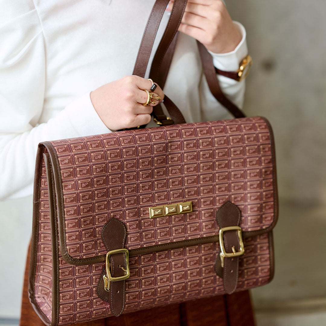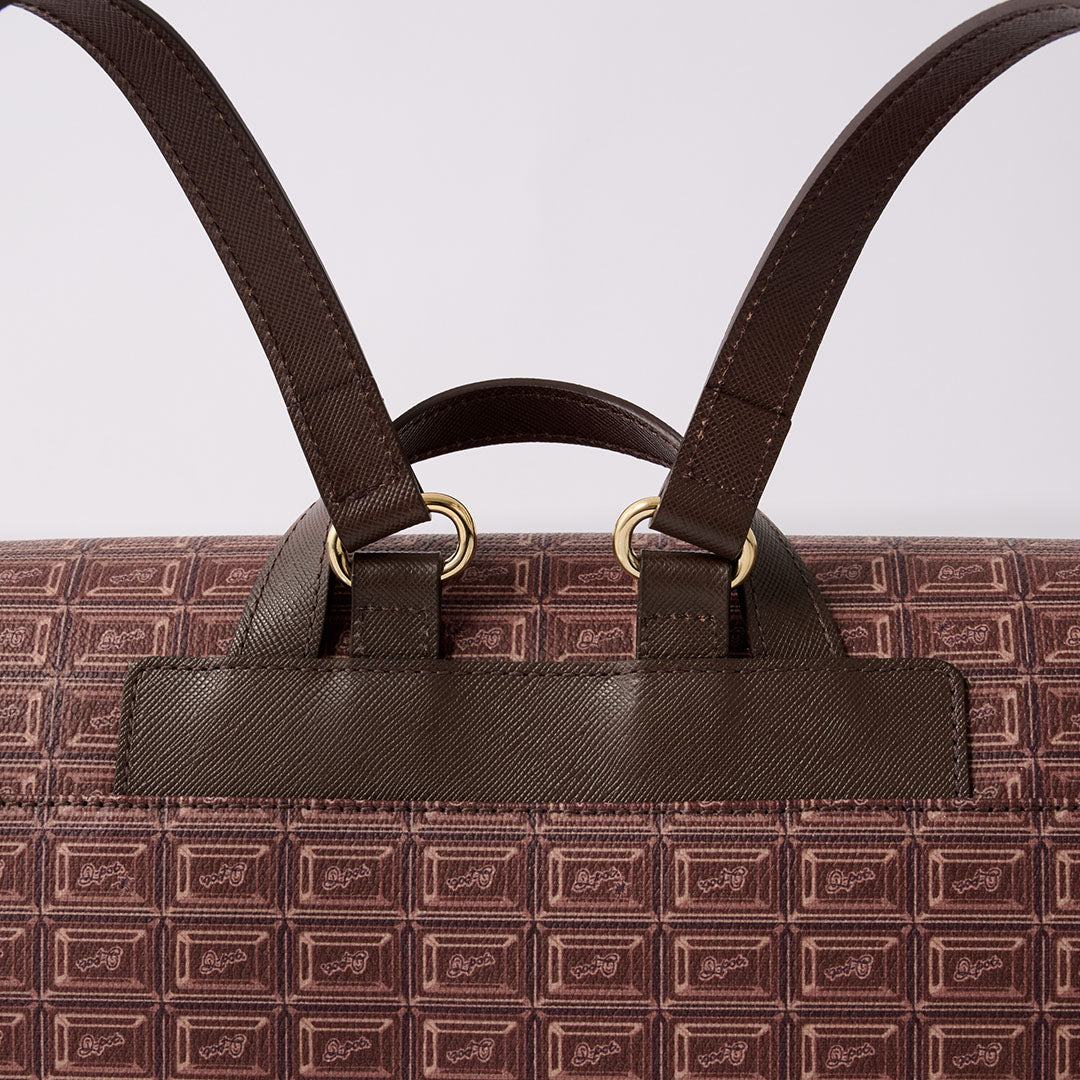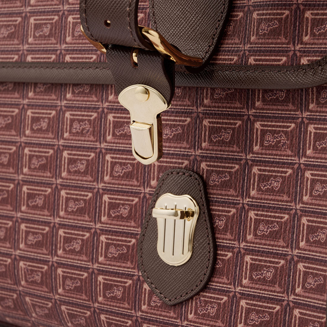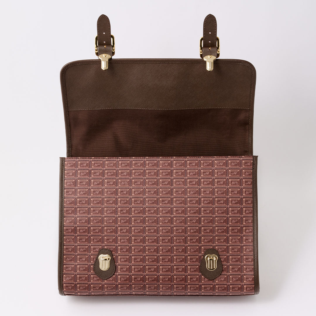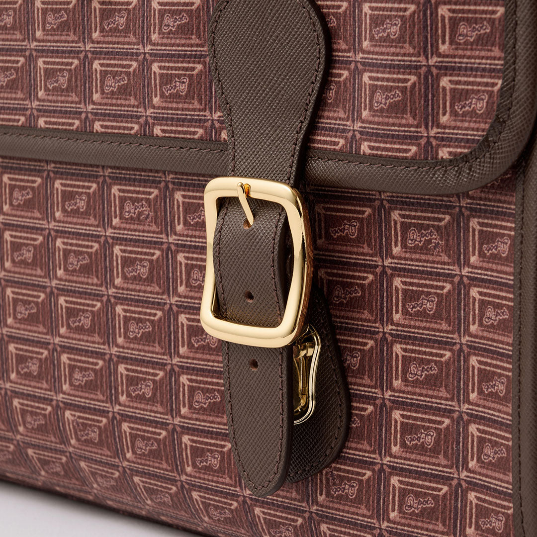 With its classy silhouette and chocolate bar motif, this satchel bag delivers timeless elegance with a playful twist. The body is crafted from water-resistant, PVC-coated cotton canvas, while the top handle and adjustable straps are made from genuine leather. Featuring a refined clasp closure and a spacious, structured interior, it’s perfect for both style and practicality.