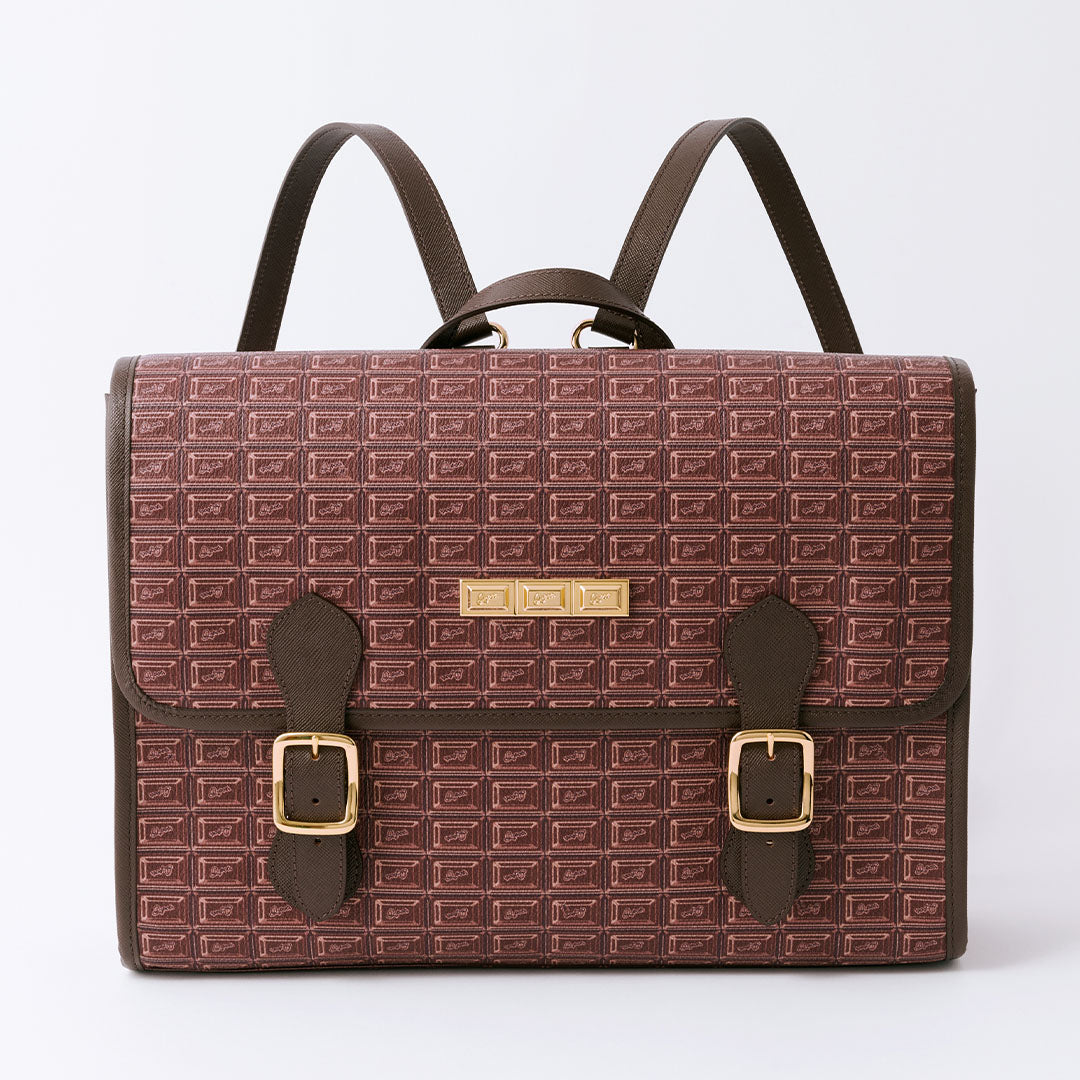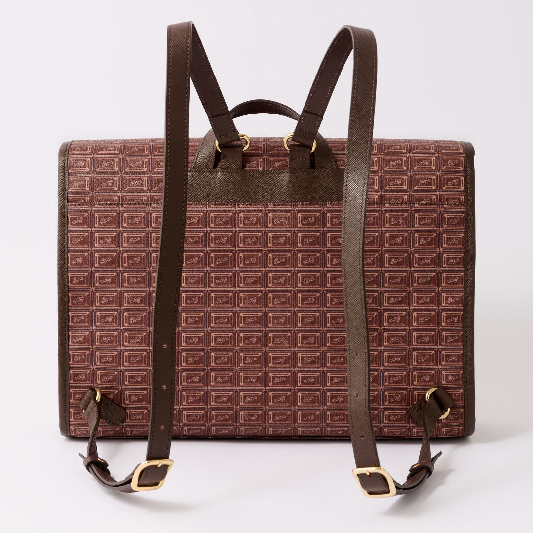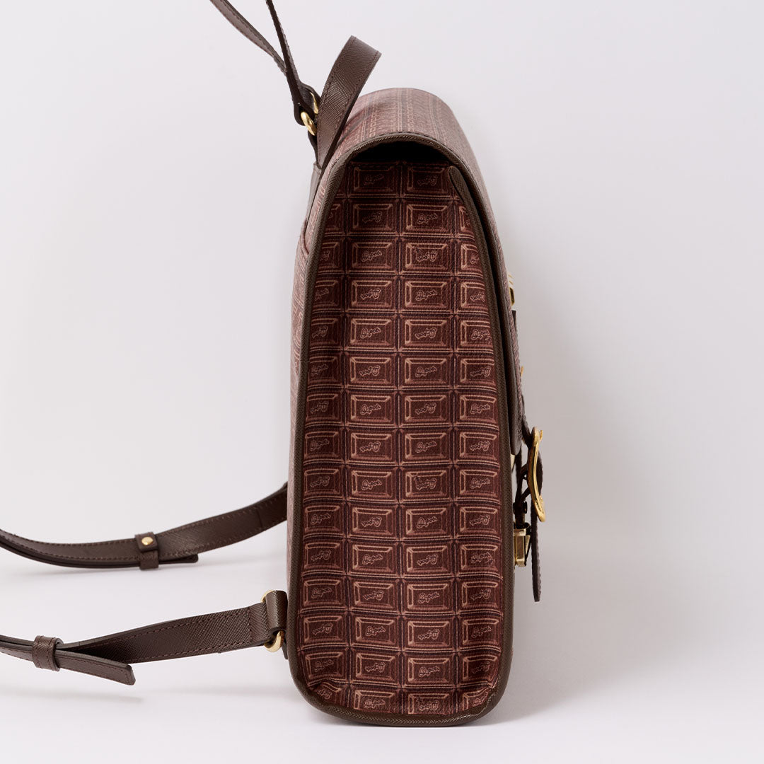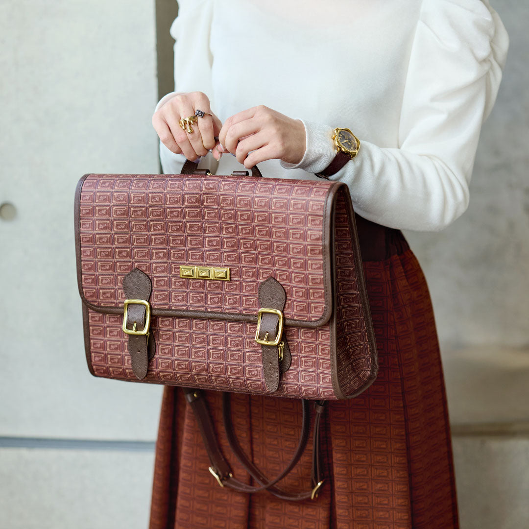 With its classy silhouette and chocolate bar motif, this satchel bag delivers timeless elegance with a playful twist. The body is crafted from water-resistant, PVC-coated cotton canvas, while the top handle and adjustable straps are made from genuine leather. Featuring a refined clasp closure and a spacious, structured interior, it’s perfect for both style and practicality.