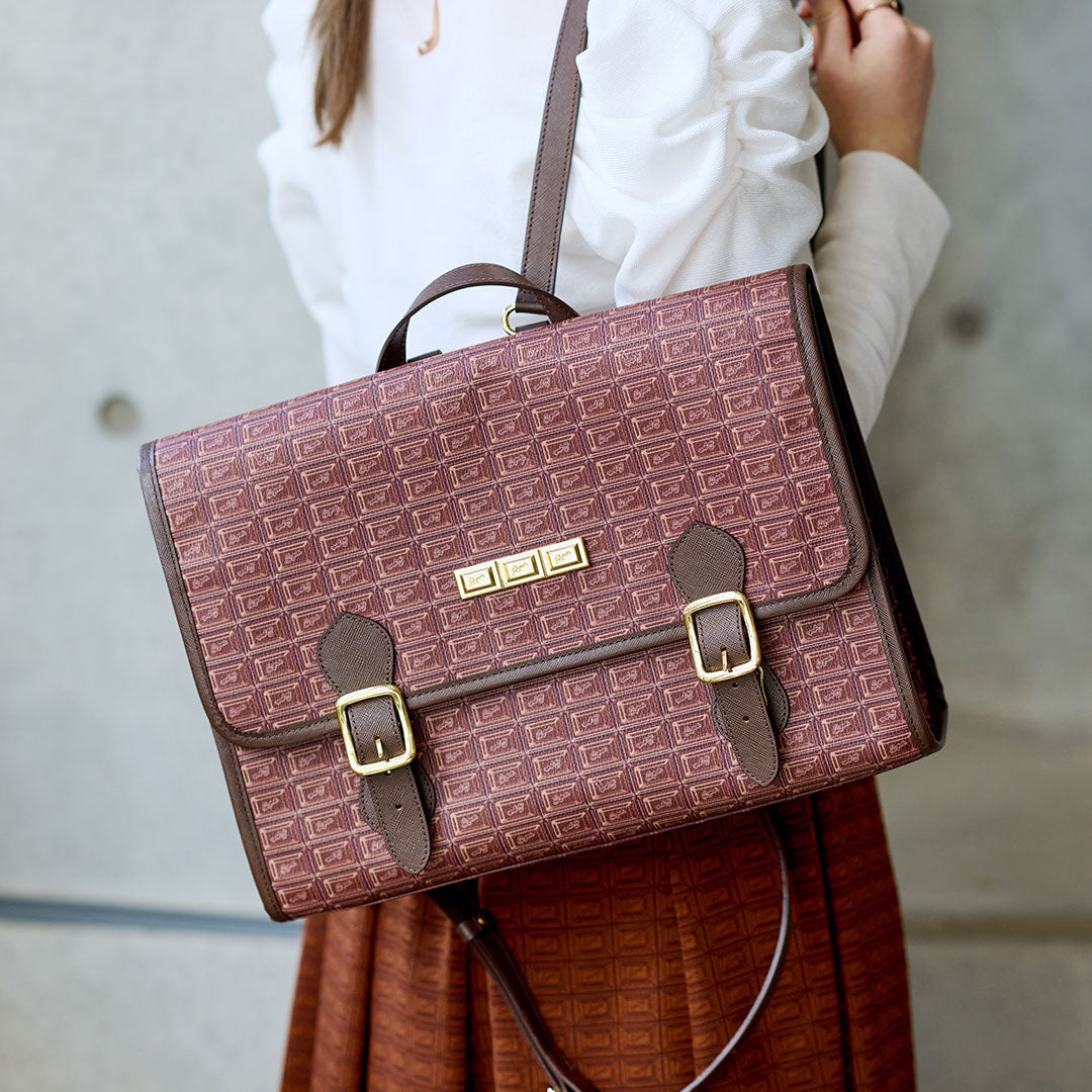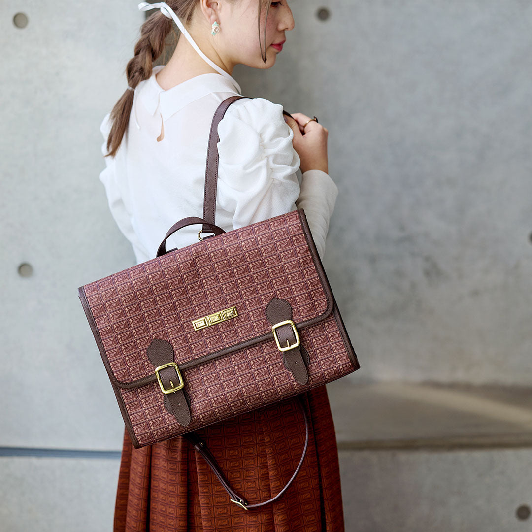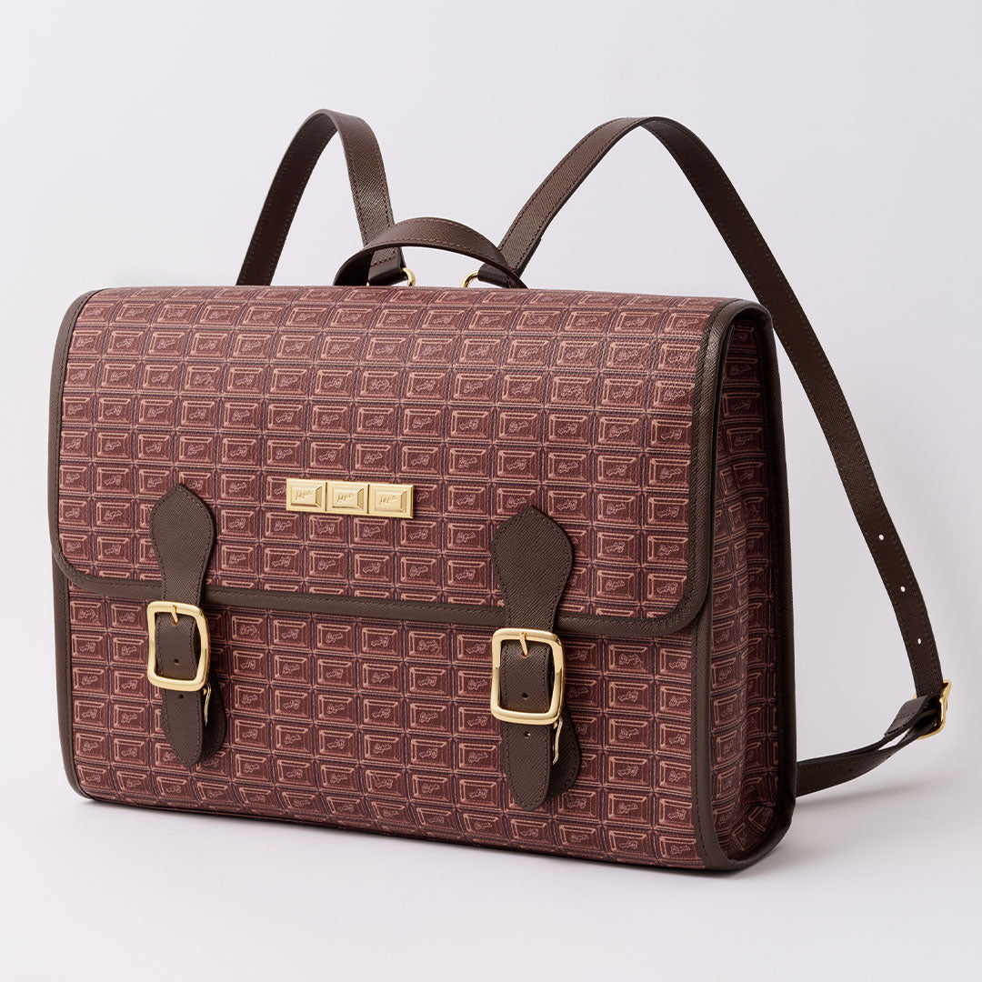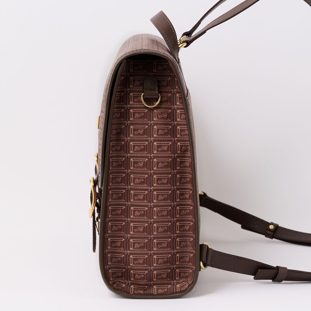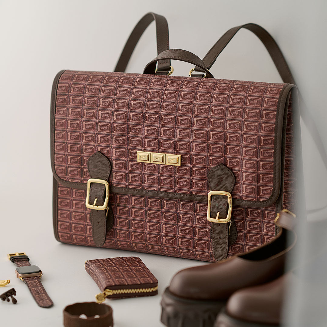 With its classy silhouette and chocolate bar motif, this satchel bag delivers timeless elegance with a playful twist. The body is crafted from water-resistant, PVC-coated cotton canvas, while the top handle and adjustable straps are made from genuine leather. Featuring a refined clasp closure and a spacious, structured interior, it’s perfect for both style and practicality.
