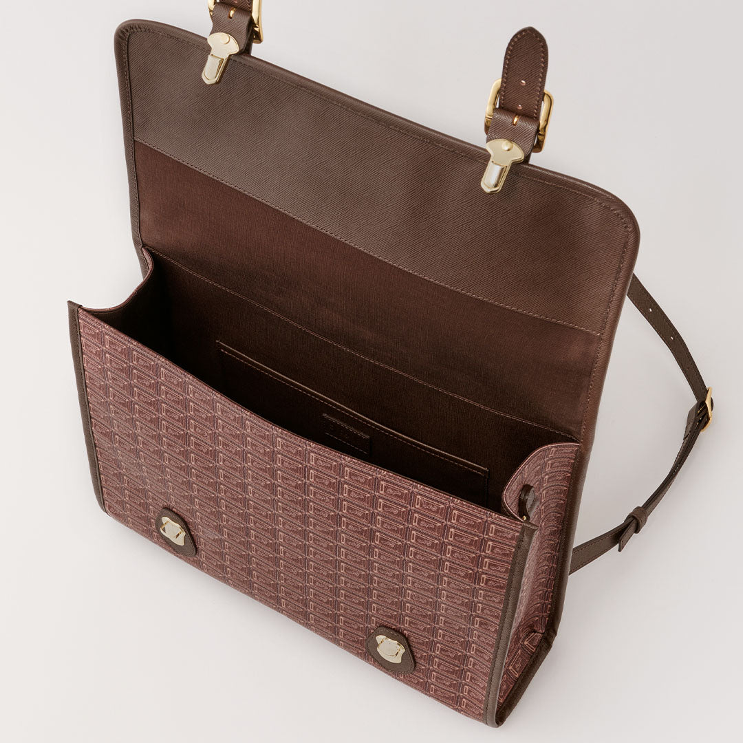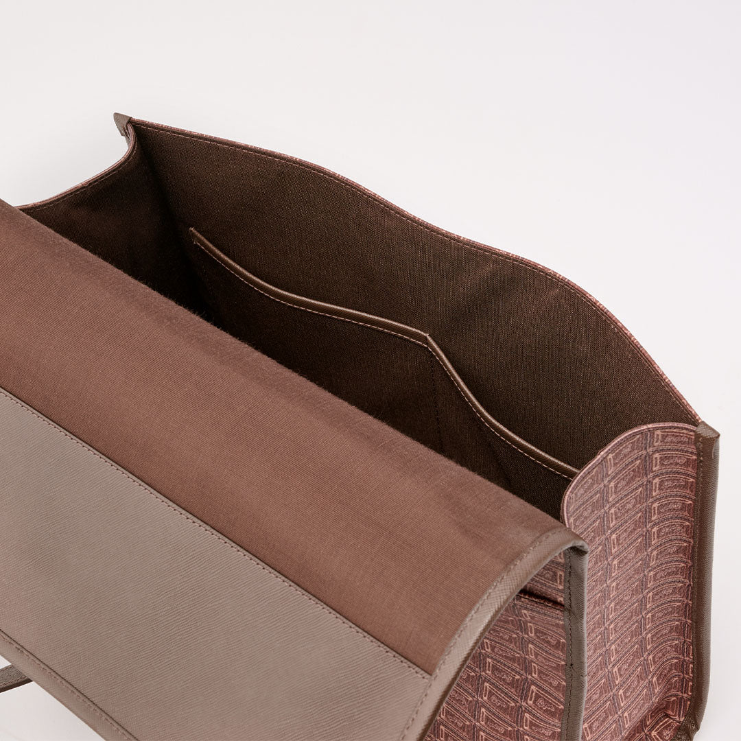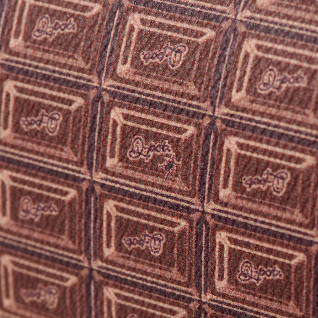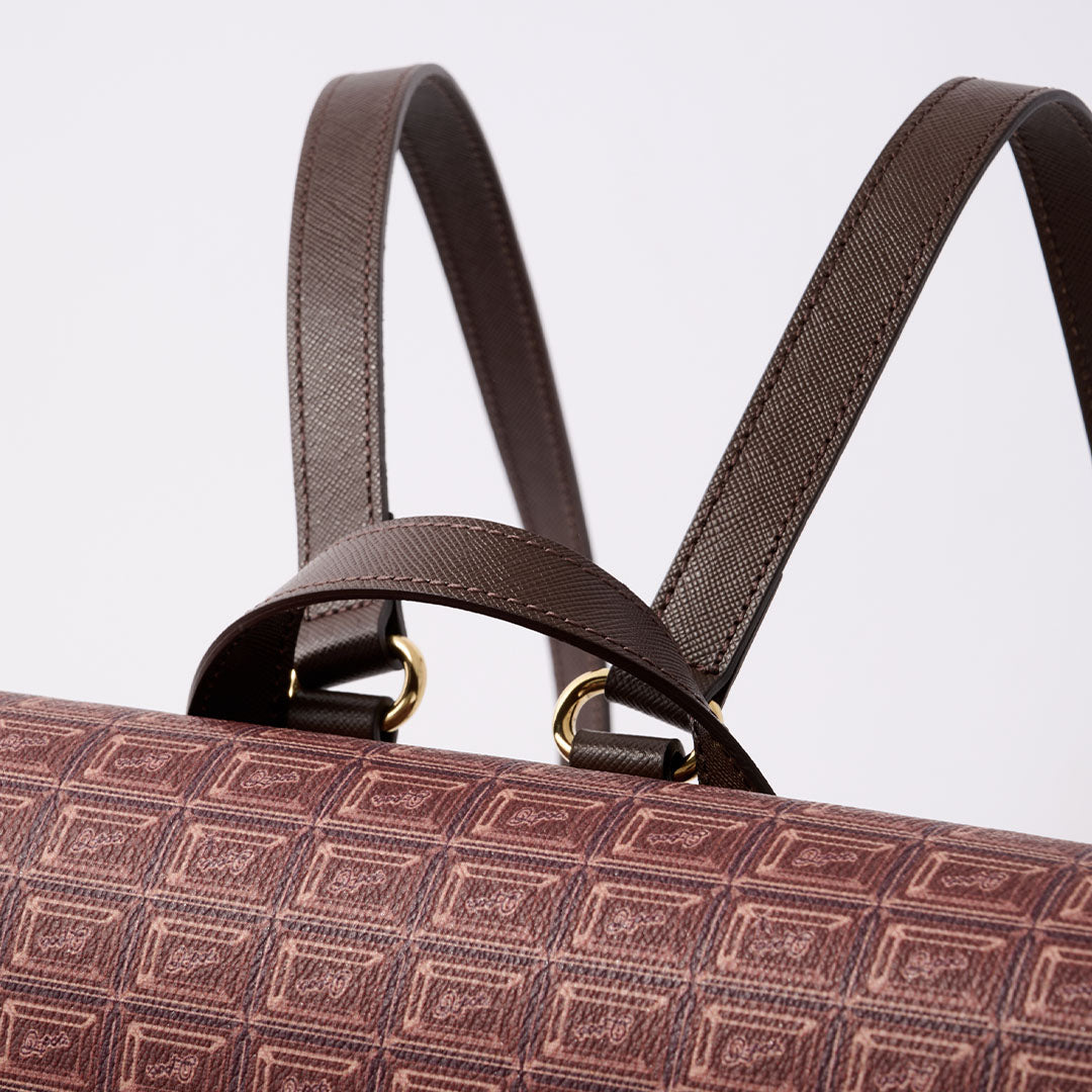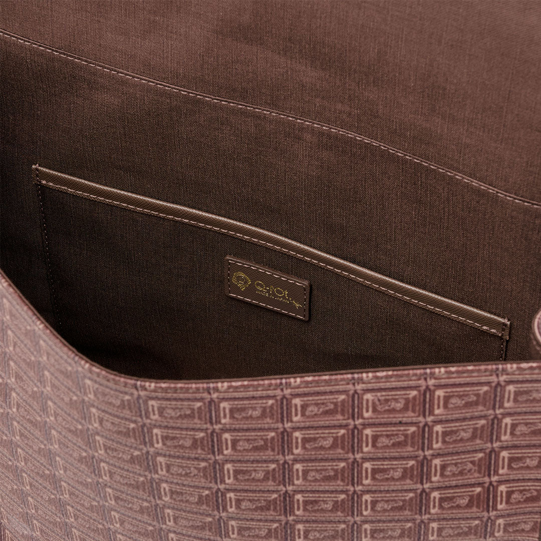 With its classy silhouette and chocolate bar motif, this satchel bag delivers timeless elegance with a playful twist. The body is crafted from water-resistant, PVC-coated cotton canvas, while the top handle and adjustable straps are made from genuine leather. Featuring a refined clasp closure and a spacious, structured interior, it’s perfect for both style and practicality.