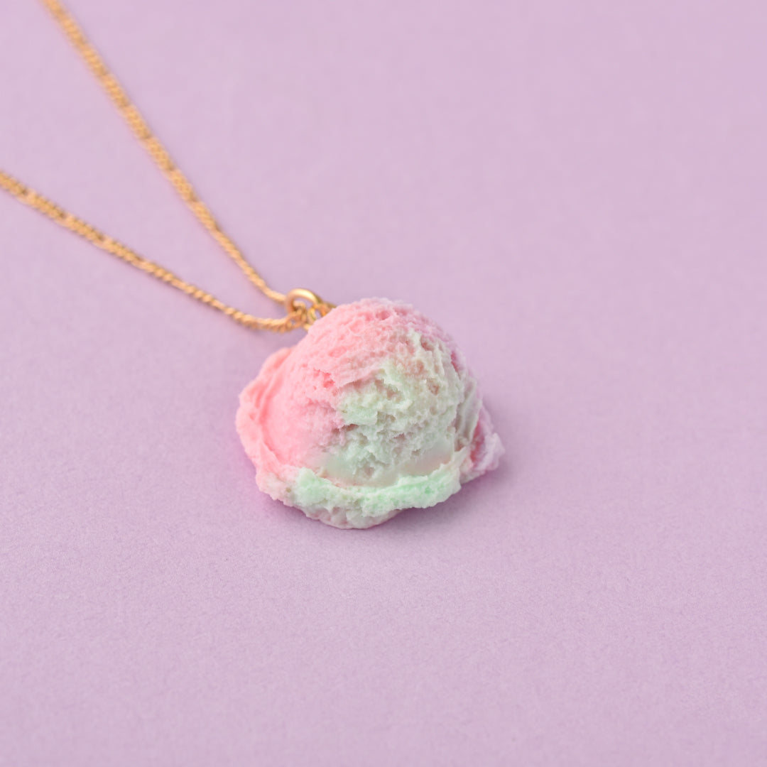 Fair favorite cotton candy flavored ice cream scoop can dangle at your chest with this unique necklace. Mix of soft pastel colors can almost taste sweet in your month and it makes you wish you can eat it!